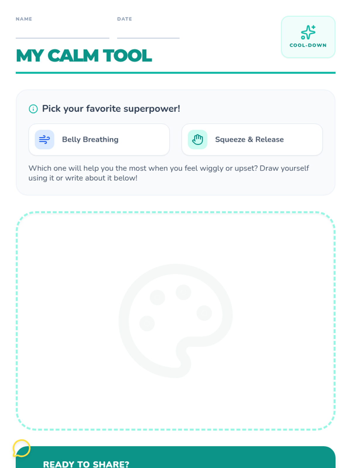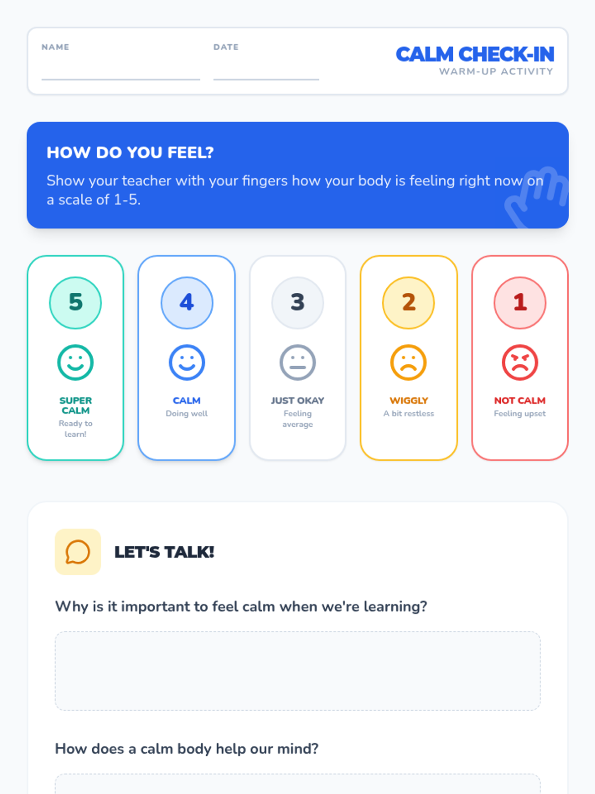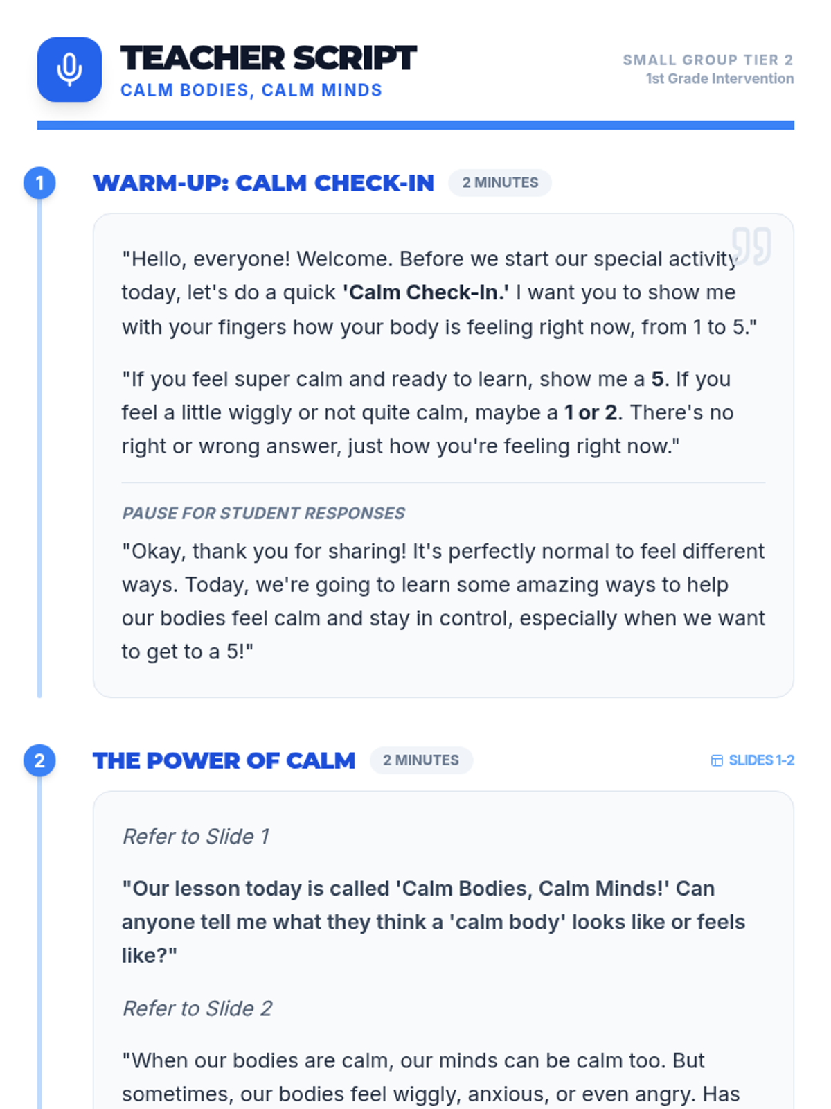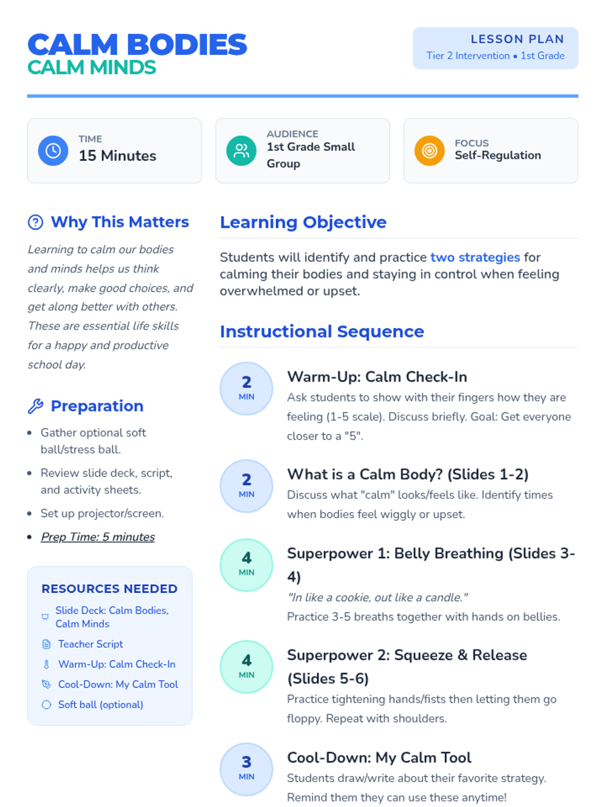 A 15-minute small group session for 1st graders to learn and practice self-regulation strategies like belly breathing and muscle relaxation.