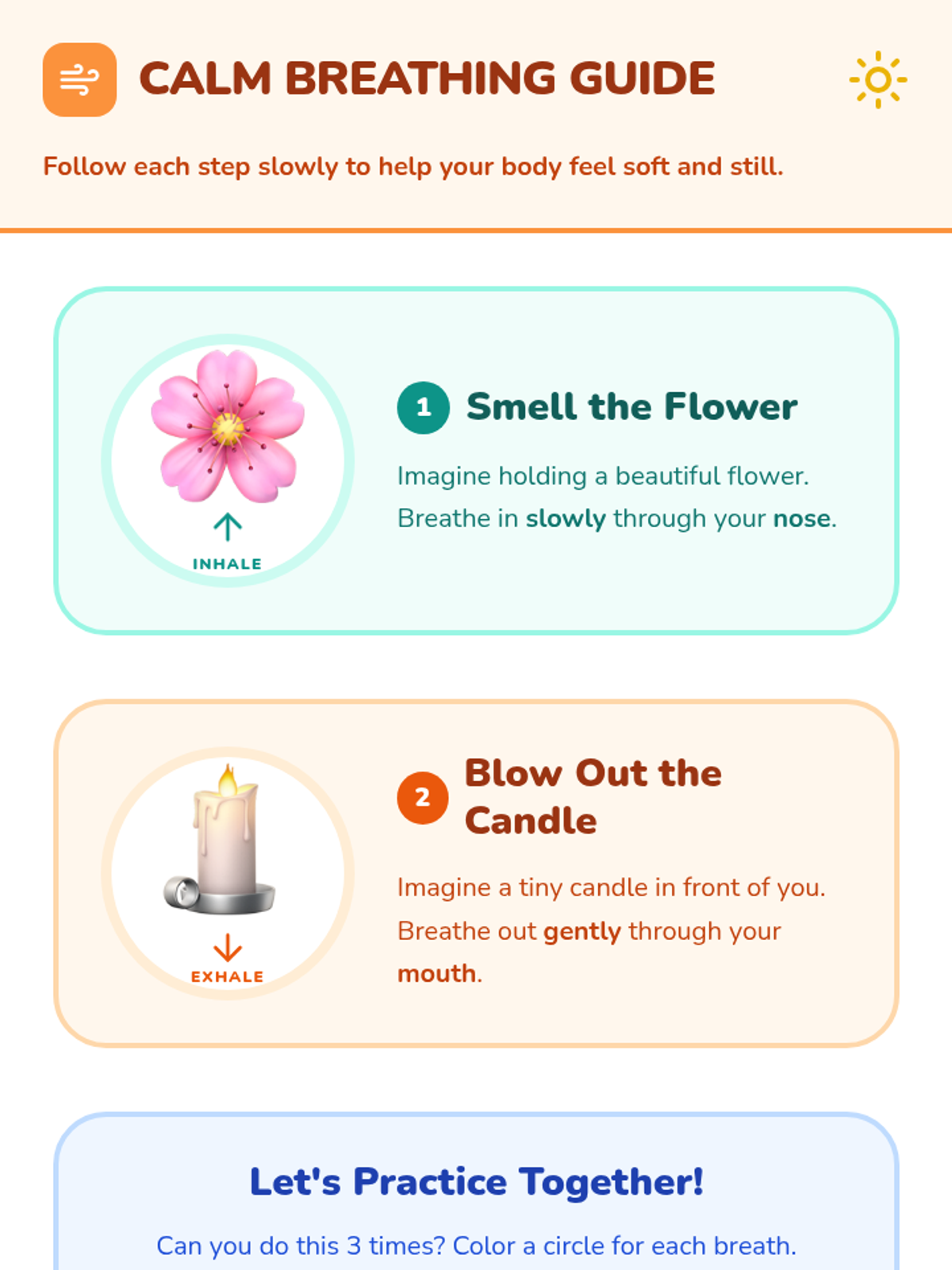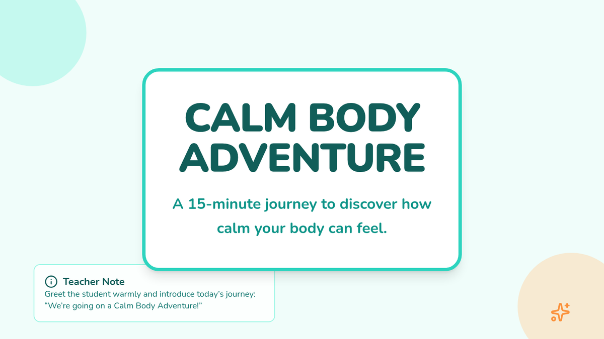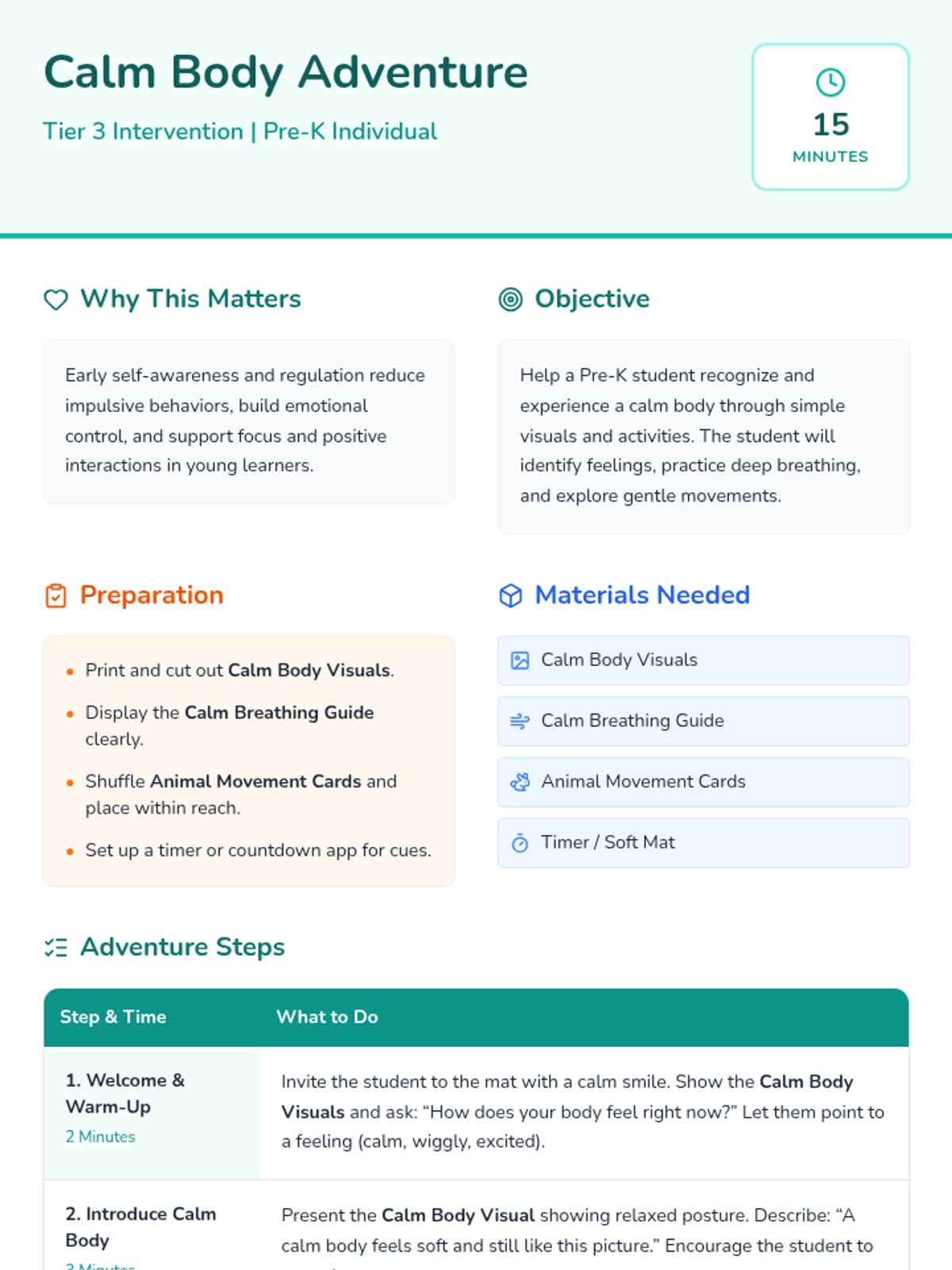 A 15-minute one-on-one introduction to help an impulsive Pre-K student explore what a calm body feels like through simple activities and visuals. This lesson builds self-awareness, basic breathing strategies, and playful movement to encourage self-regulation.