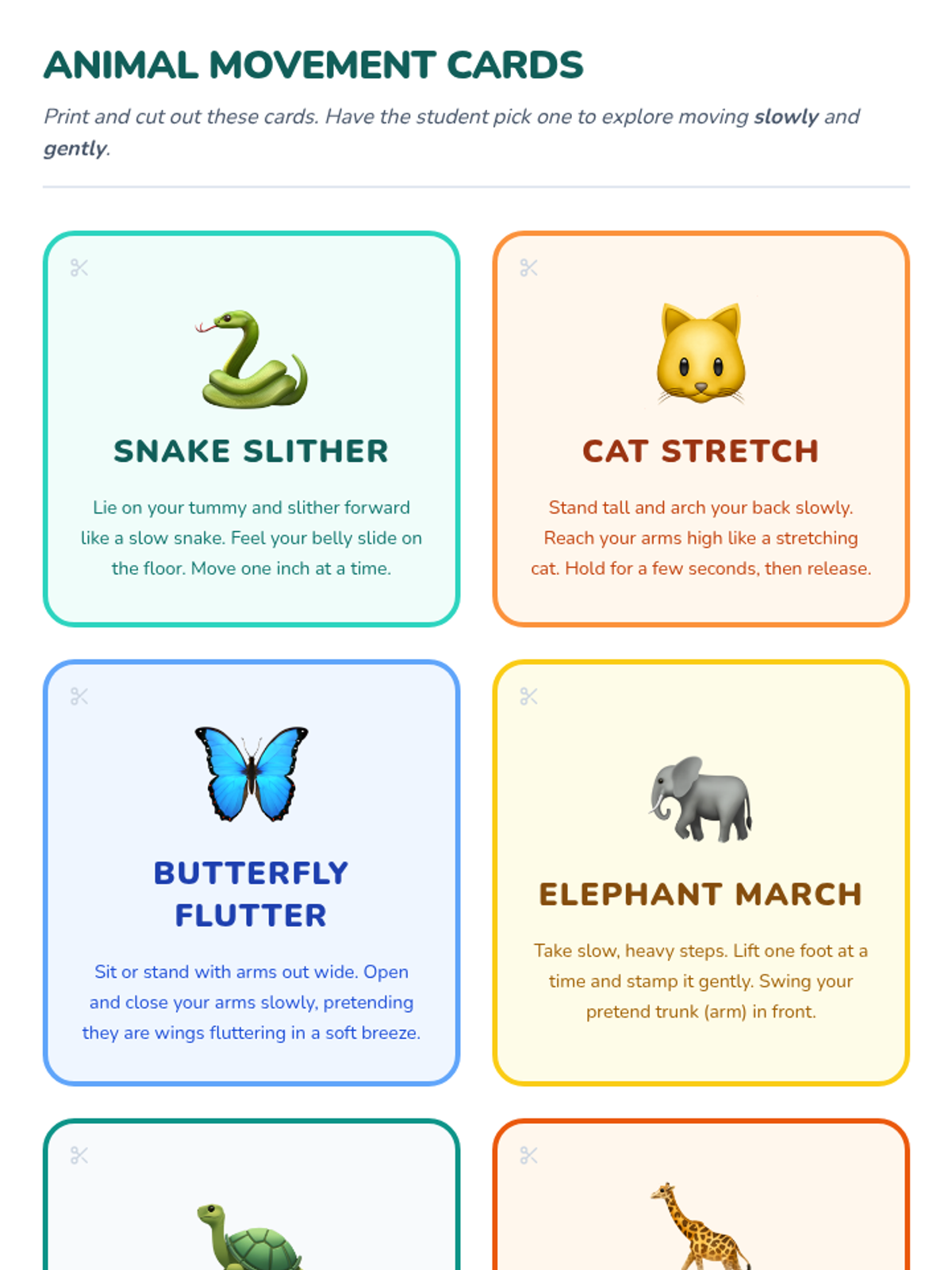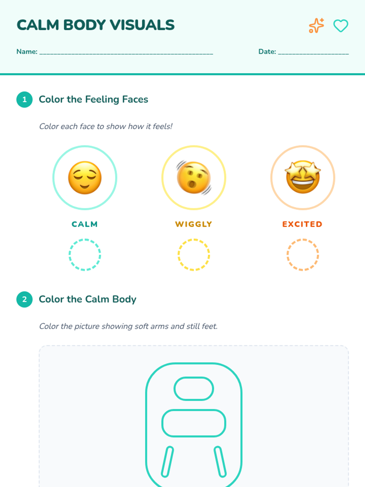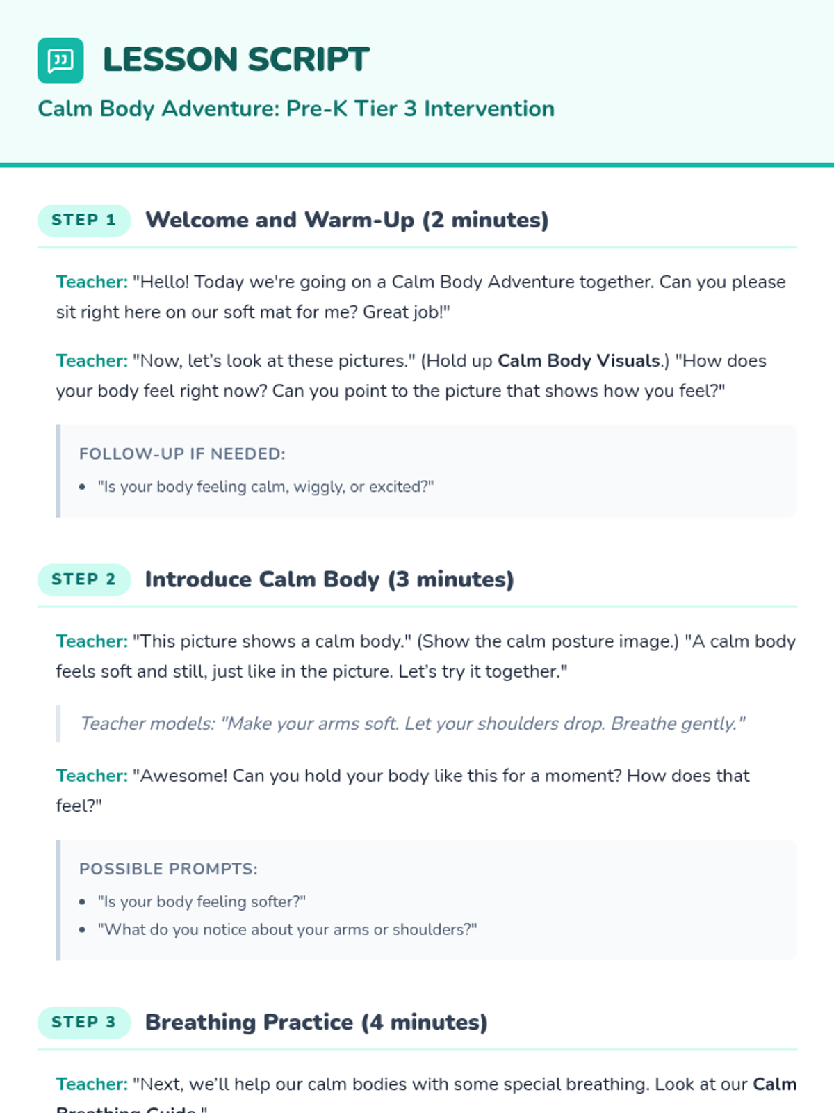 A 15-minute one-on-one introduction to help an impulsive Pre-K student explore what a calm body feels like through simple activities and visuals. This lesson builds self-awareness, basic breathing strategies, and playful movement to encourage self-regulation.