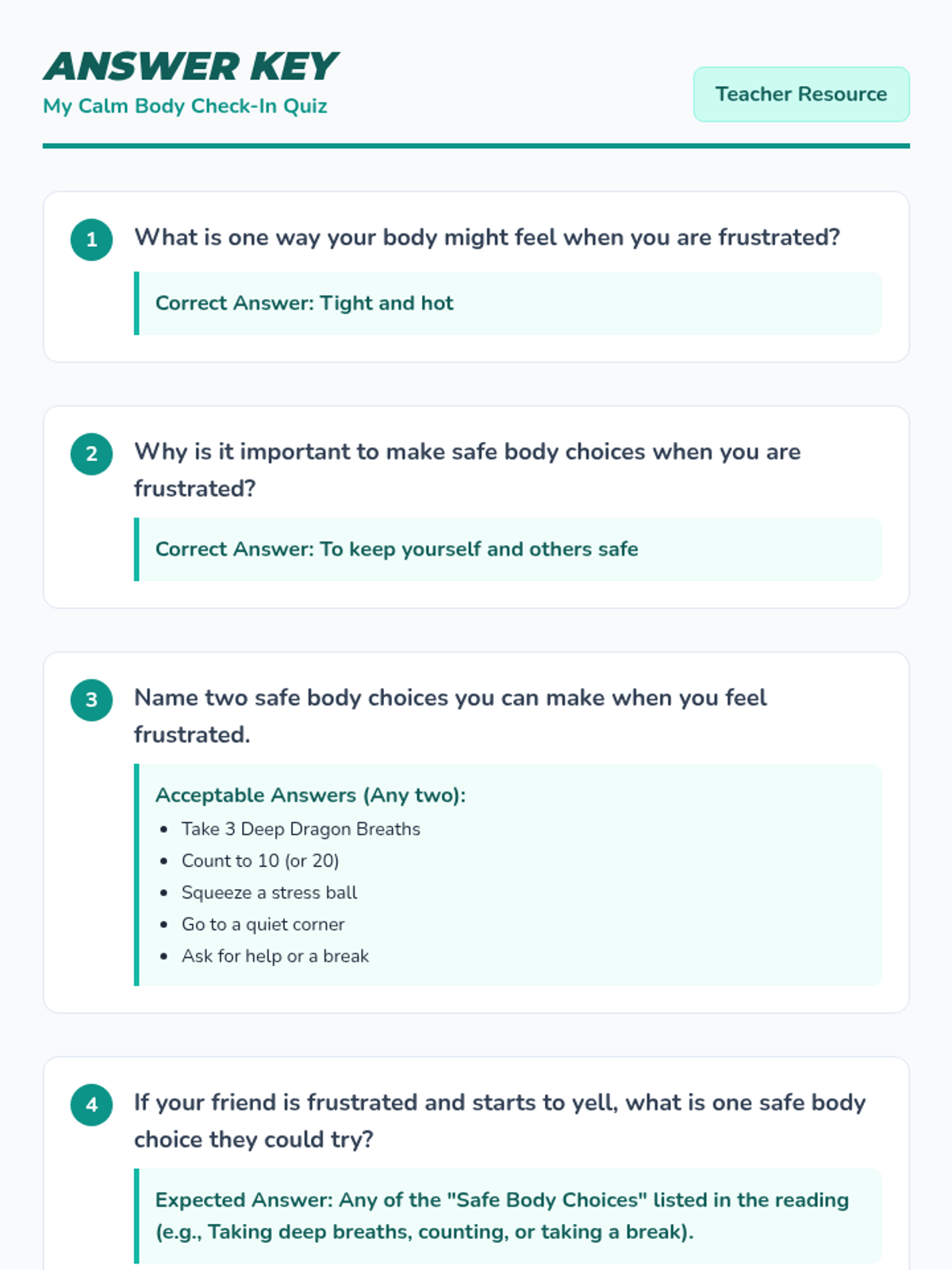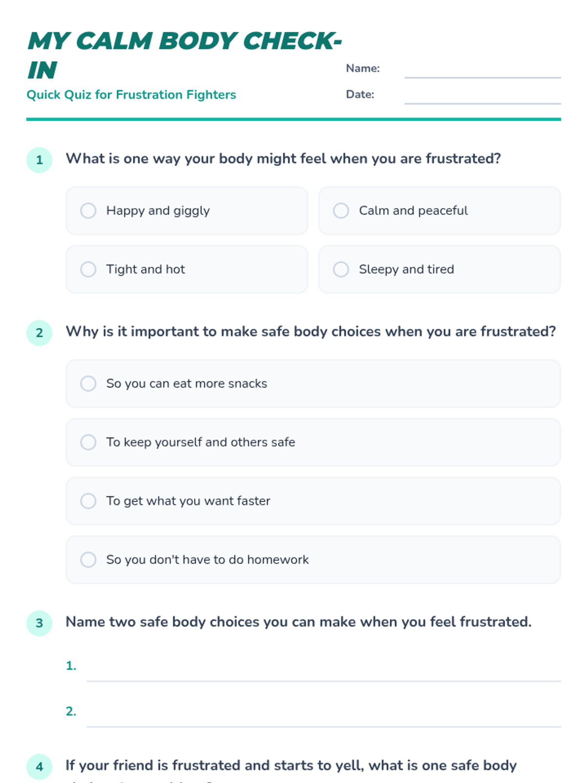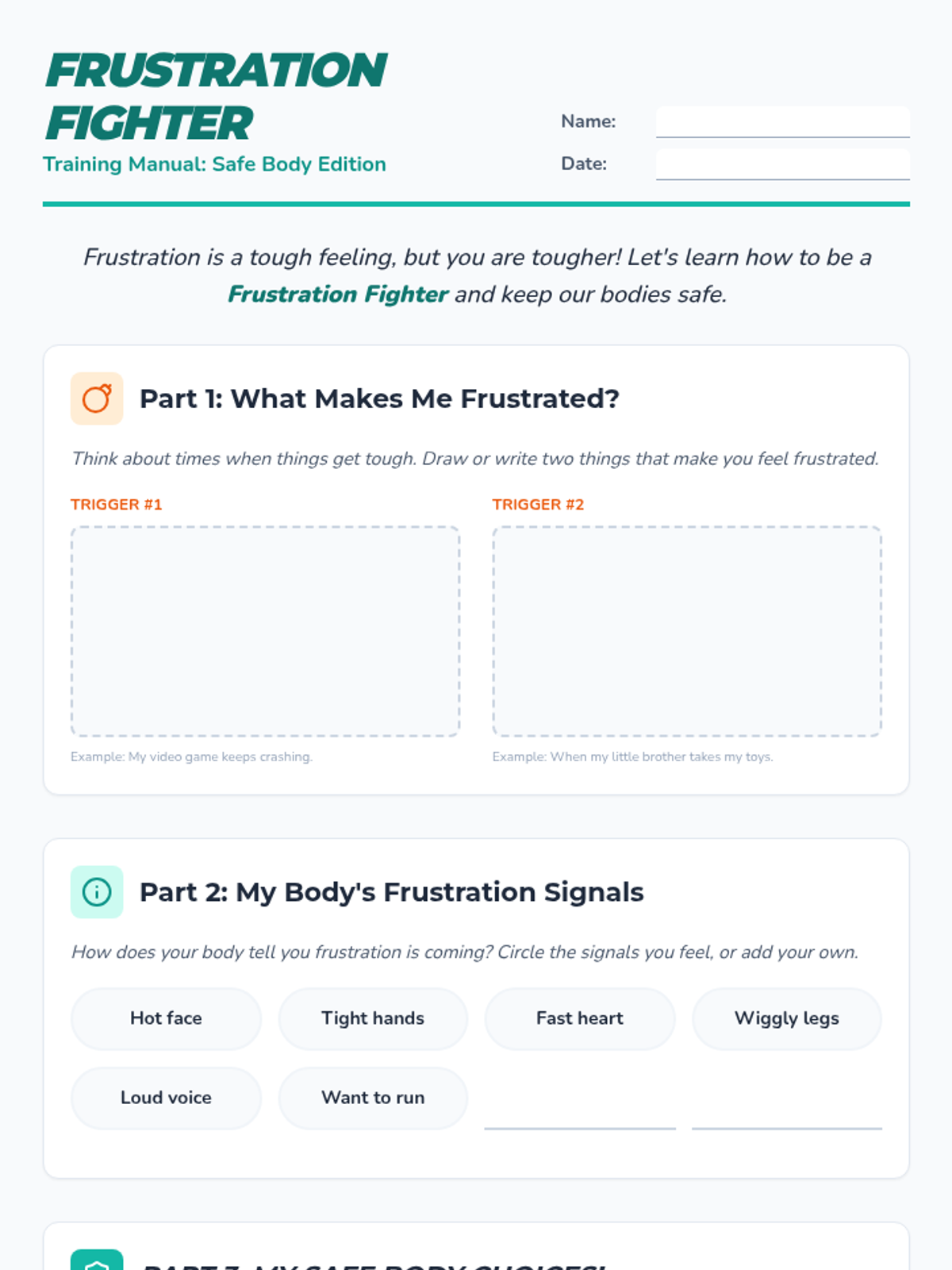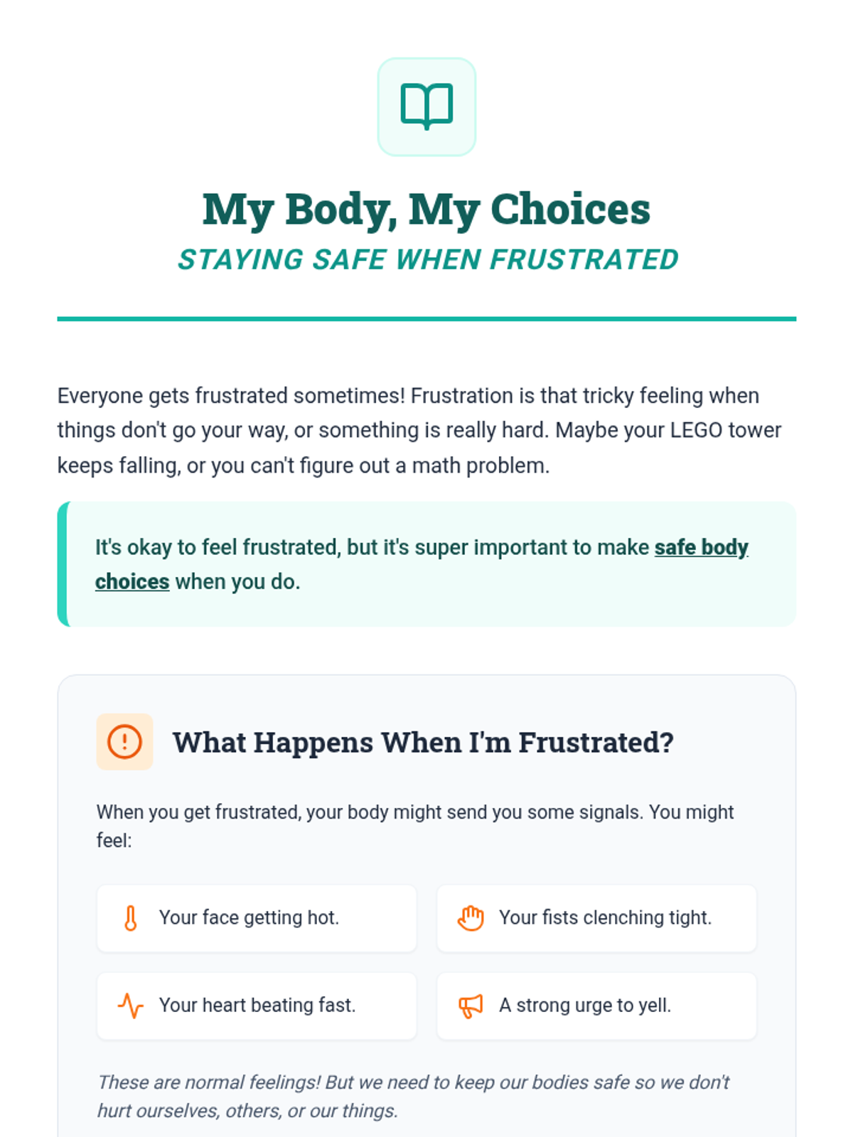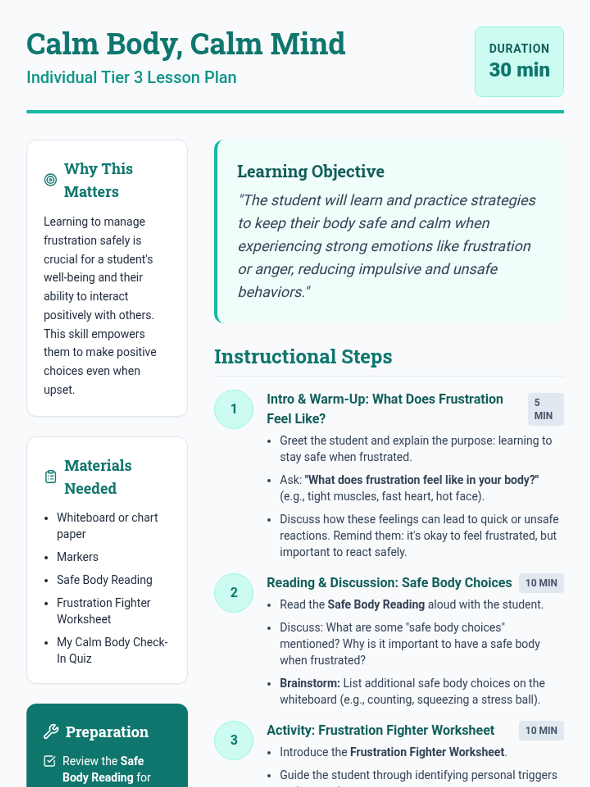 This individual Tier 3 lesson helps a 3rd-grade student learn and practice strategies for keeping their body safe and calm when experiencing strong emotions like frustration or anger. It aims to reduce impulsive and unsafe behaviors, fostering self-regulation skills.