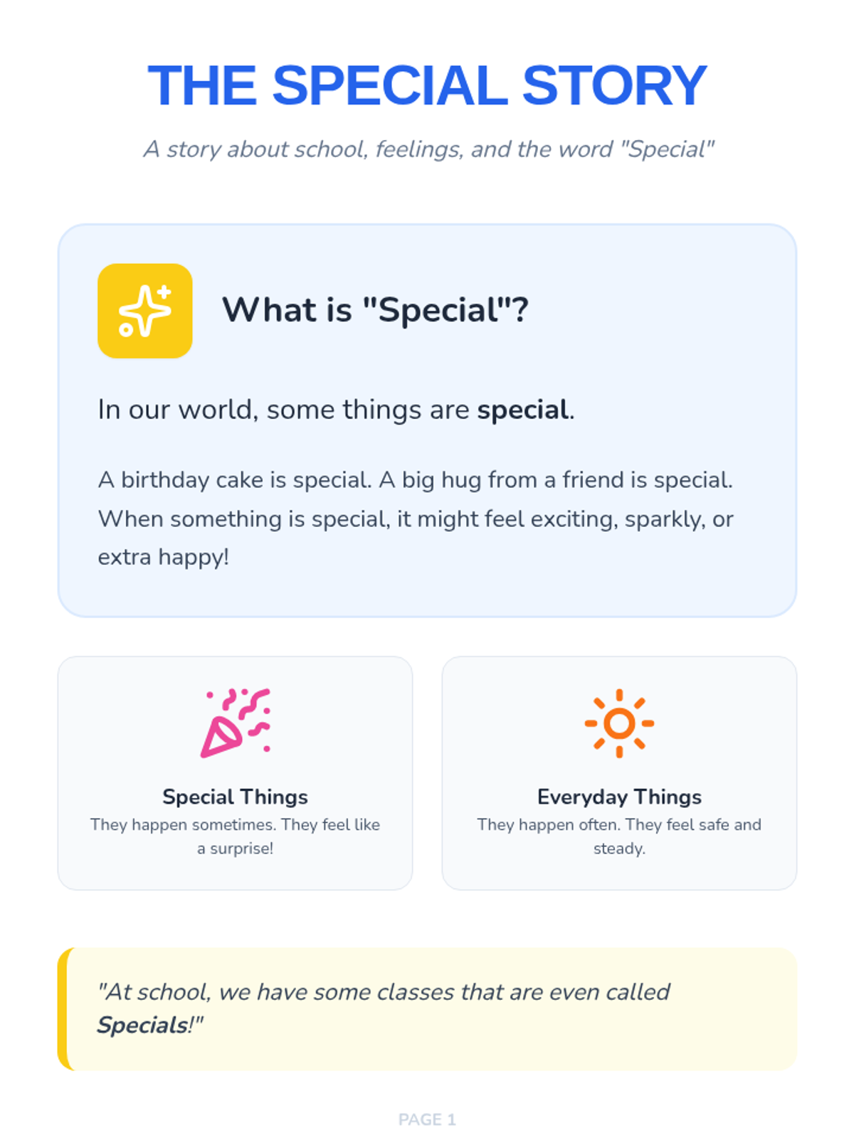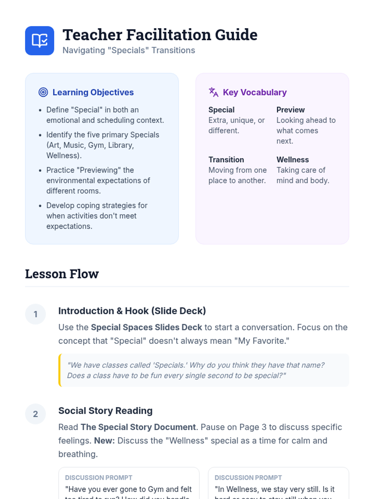 A comprehensive social story and supporting materials designed to help kindergarten students understand the concept of 'Specials' classes, manage expectations for different learning environments, and navigate transitions between high-energy and quiet activities.