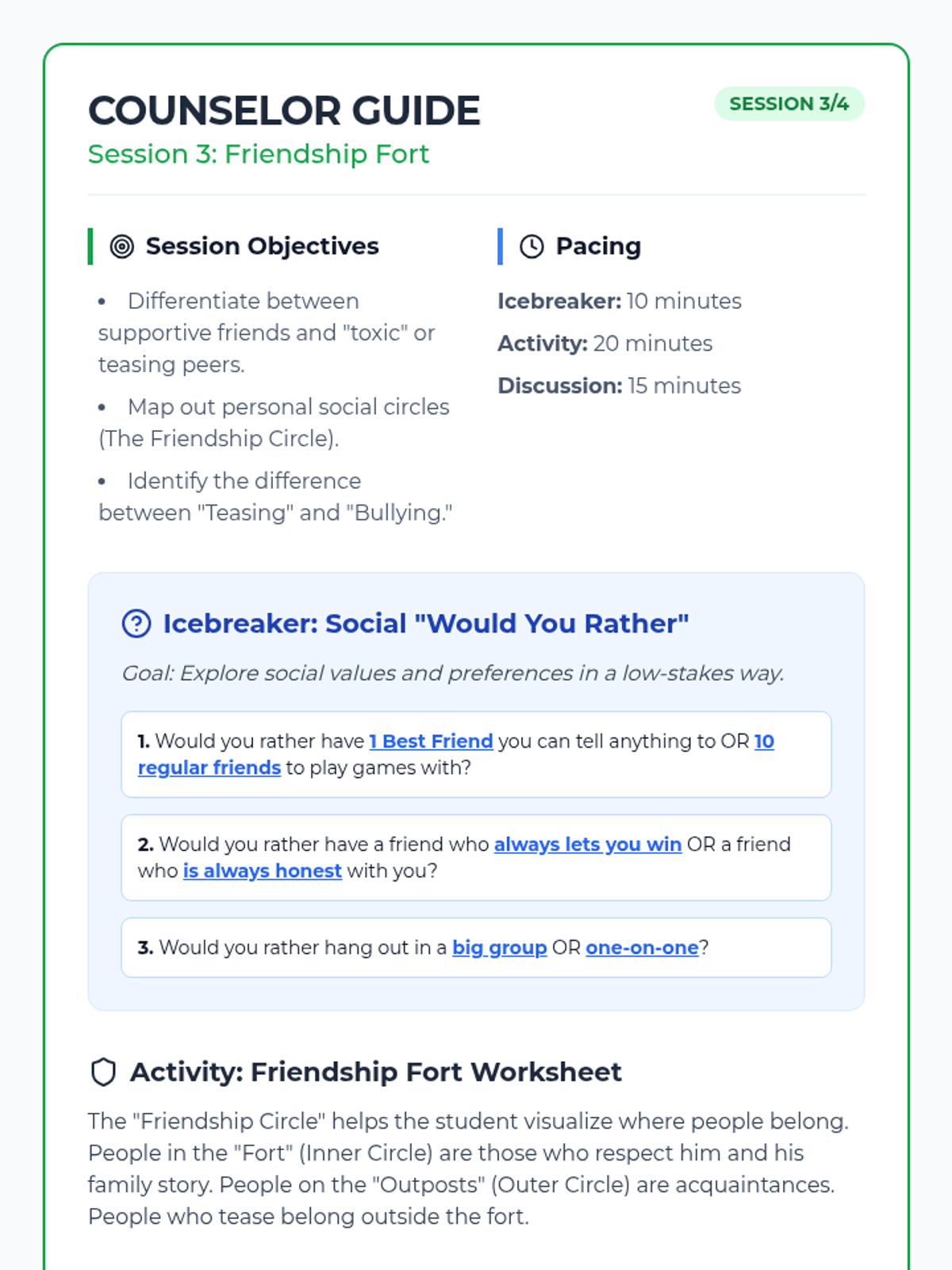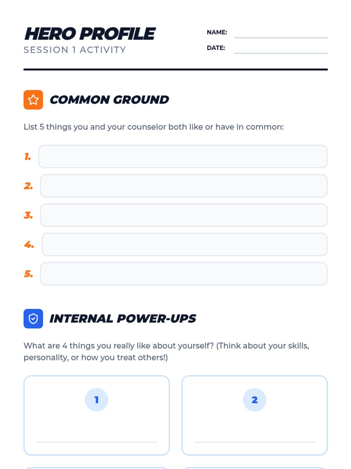 Build rapport through common interests and explore self-worth by identifying personal strengths and positive traits.
