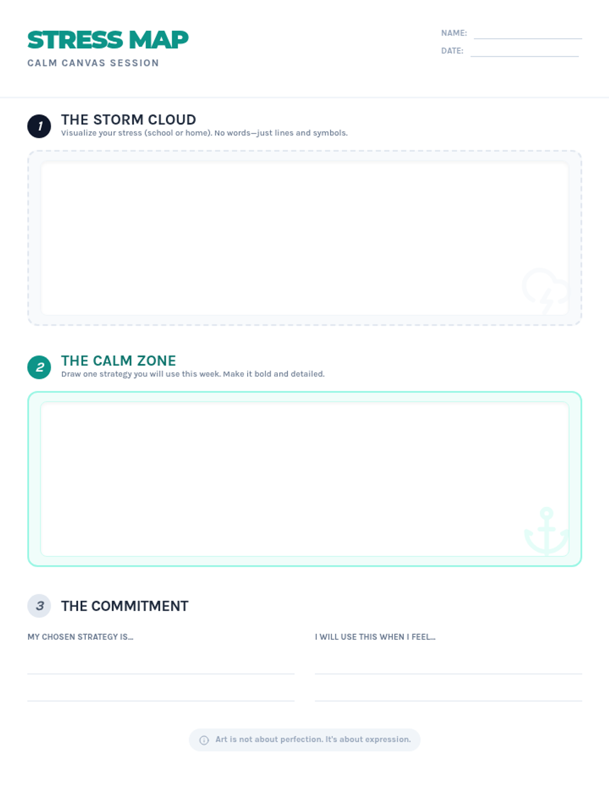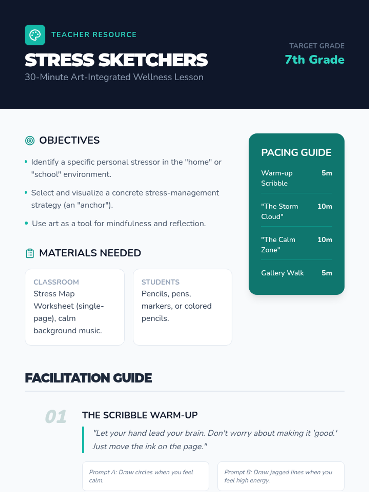 A 30-minute art-integrated lesson where 7th graders use drawing and doodling to visualize their personal stressors and design a concrete management strategy.