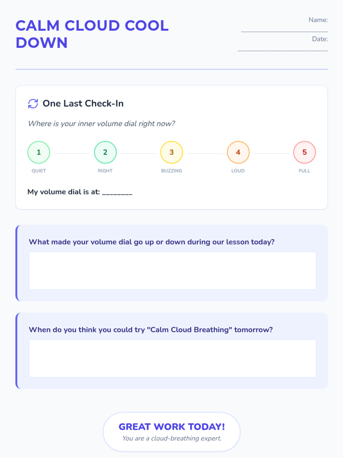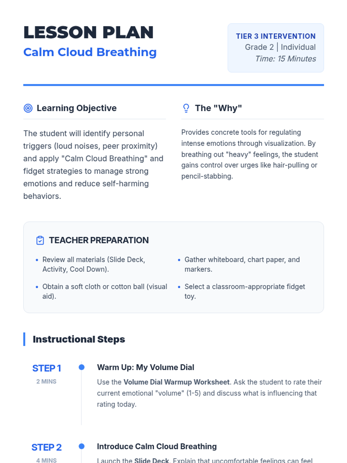 A 15-minute Tier 3 intervention for 2nd graders to manage sensory overstimulation and prevent self-harm through visualization and breathing.