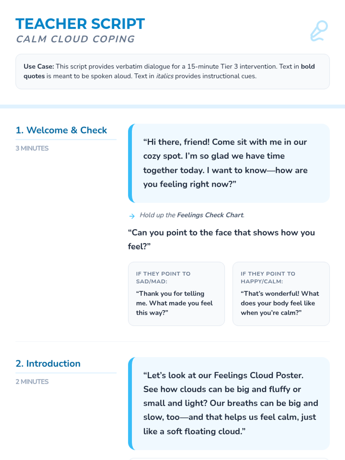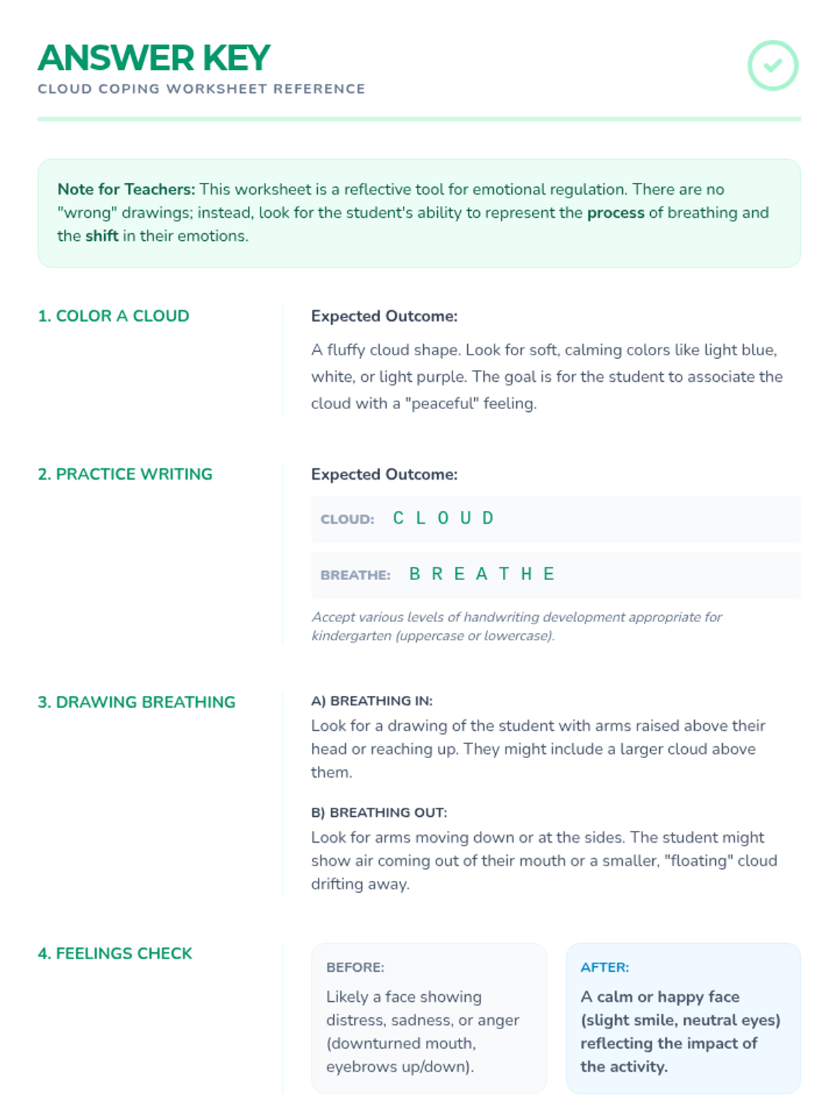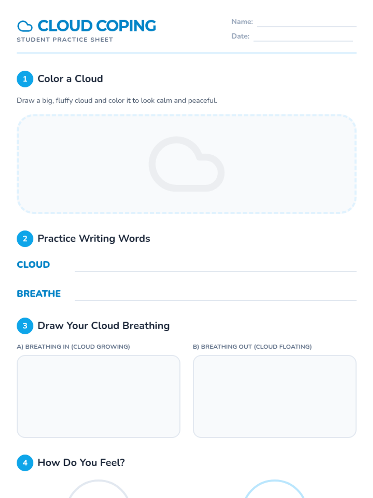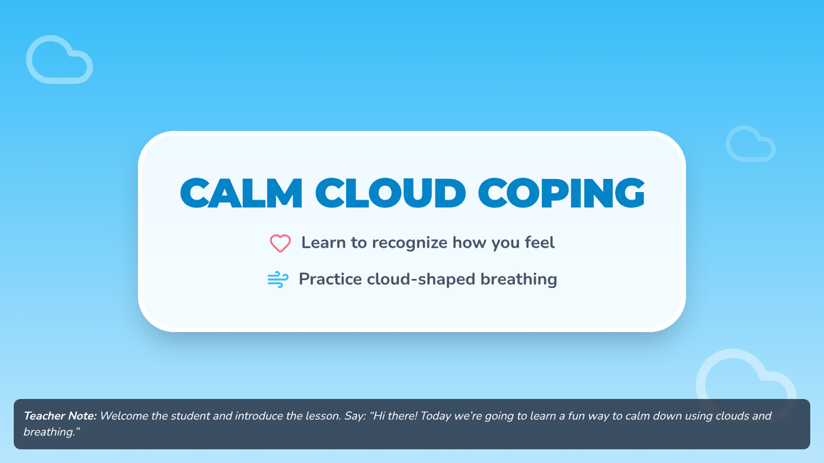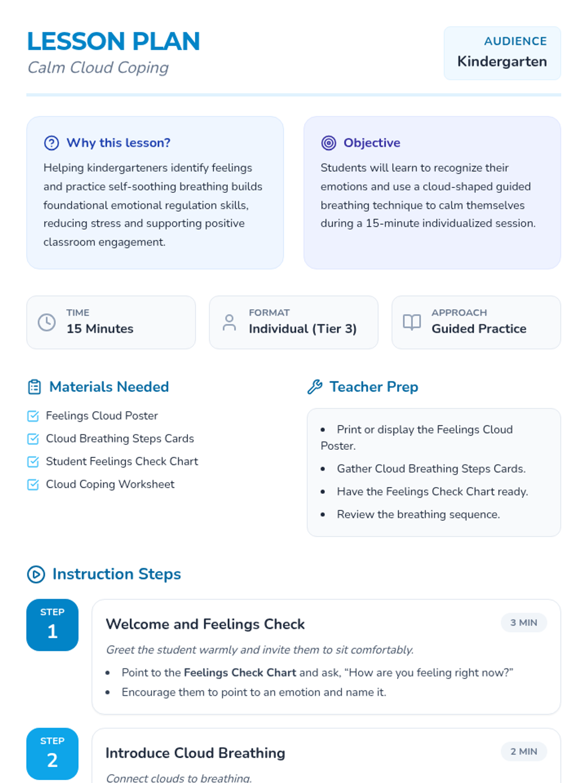 A short, 15-minute individualized lesson teaching kindergarteners simple coping skills using a cloud breathing activity and feelings check. This Tier 3 lesson empowers young learners to recognize emotions and use guided breathing to calm down.
