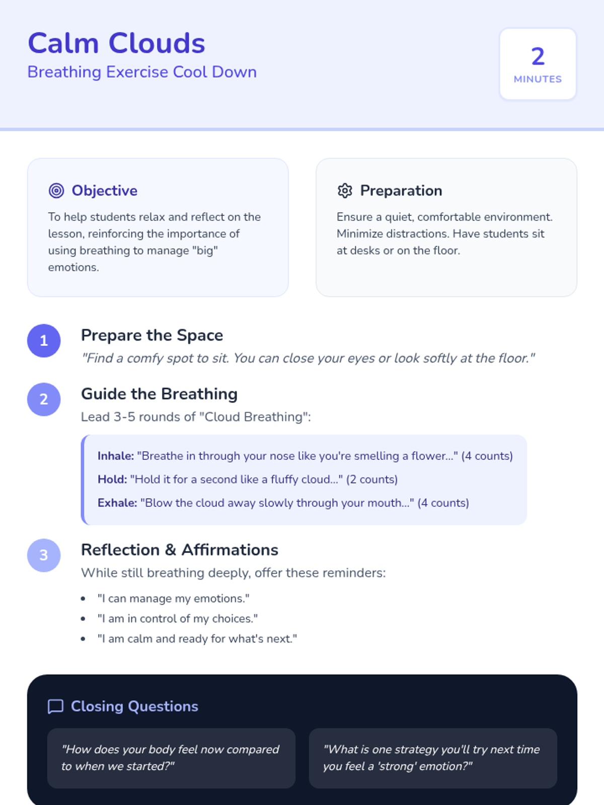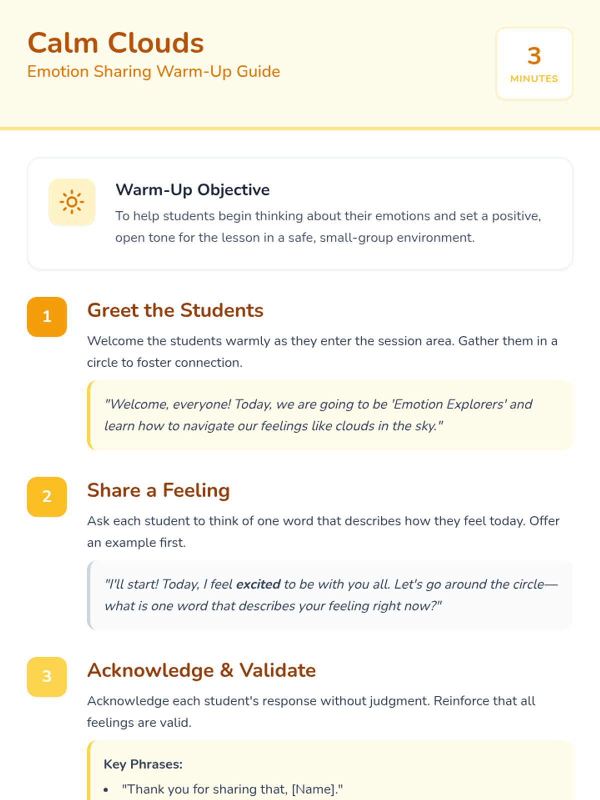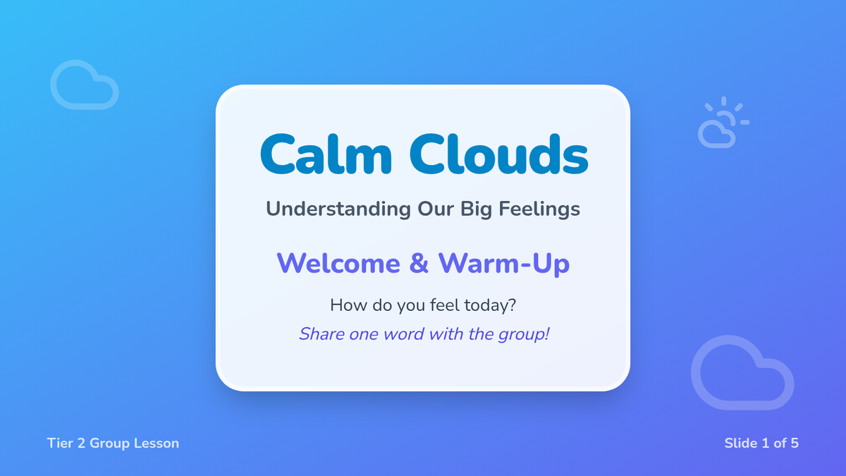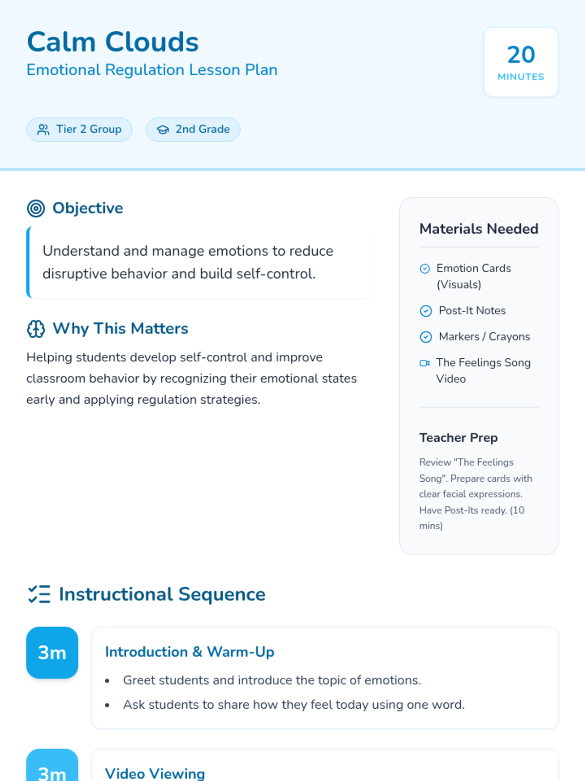 A 20-minute Tier 2 group lesson for 2nd graders to help them identify, express, and manage their emotions using interactive activities and calming techniques.