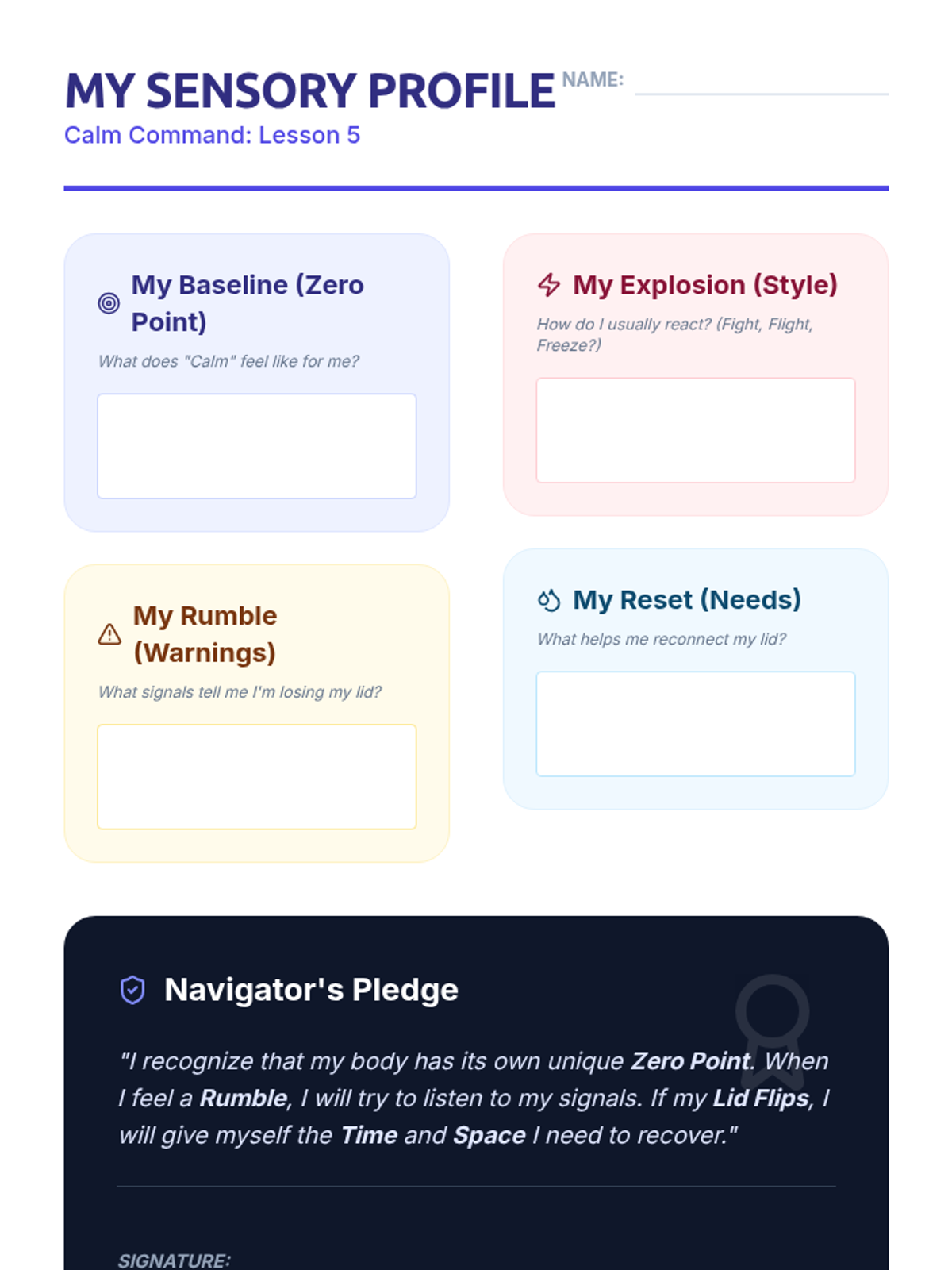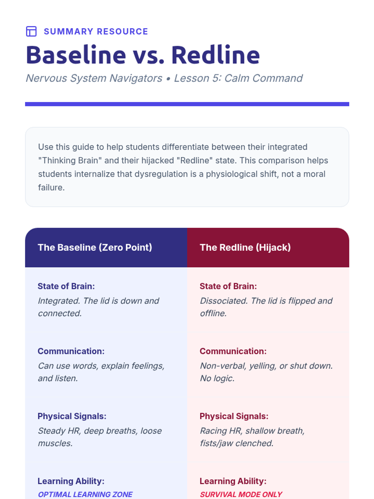 Students synthesize their learning to define what a 'calm' baseline feels like for them, creating a personal profile to guide their future self-regulation efforts.