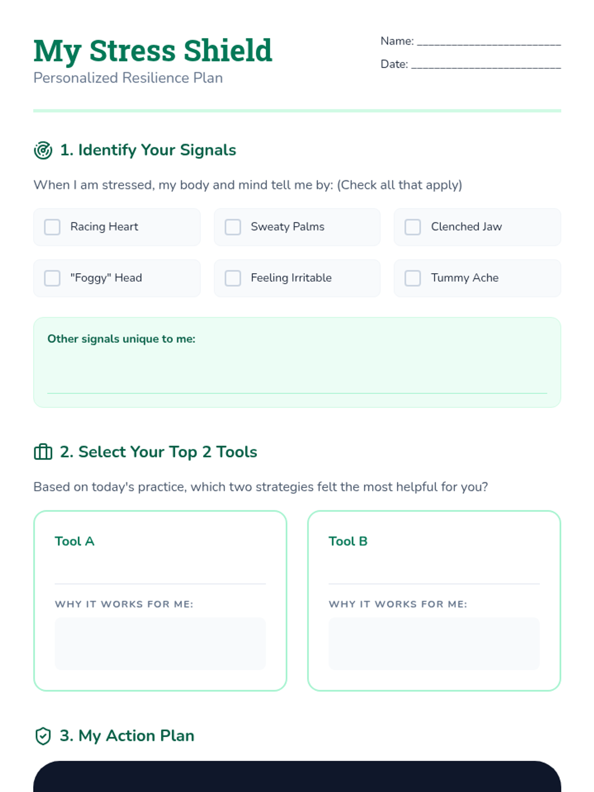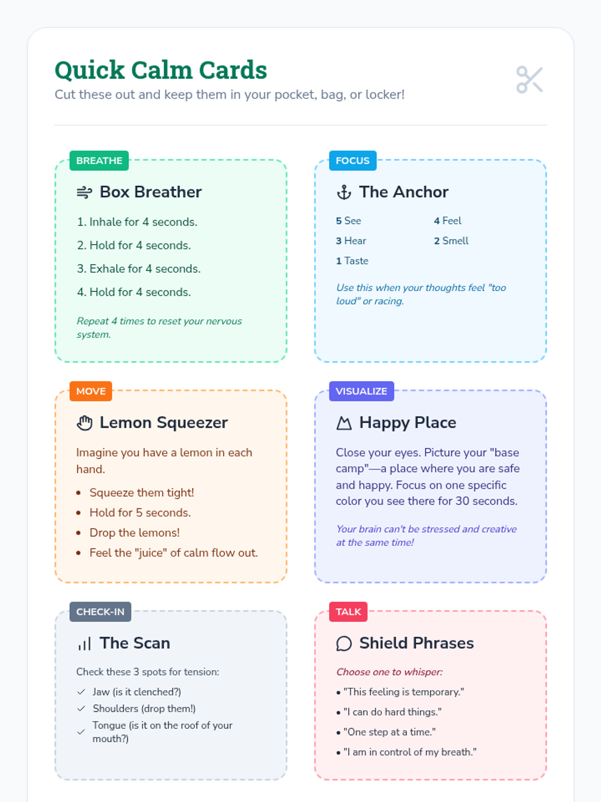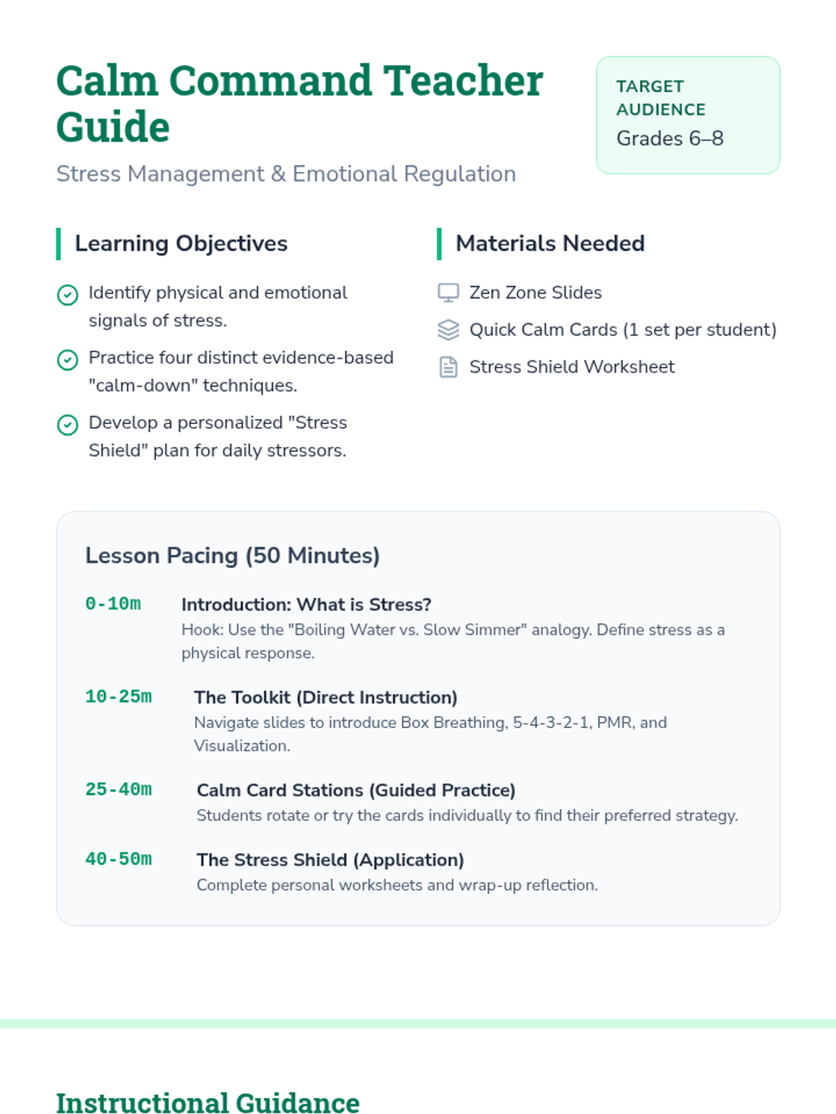 A comprehensive lesson for middle schoolers to identify stressors and build a personal toolkit of breathing, movement, and visualization strategies for emotional regulation.