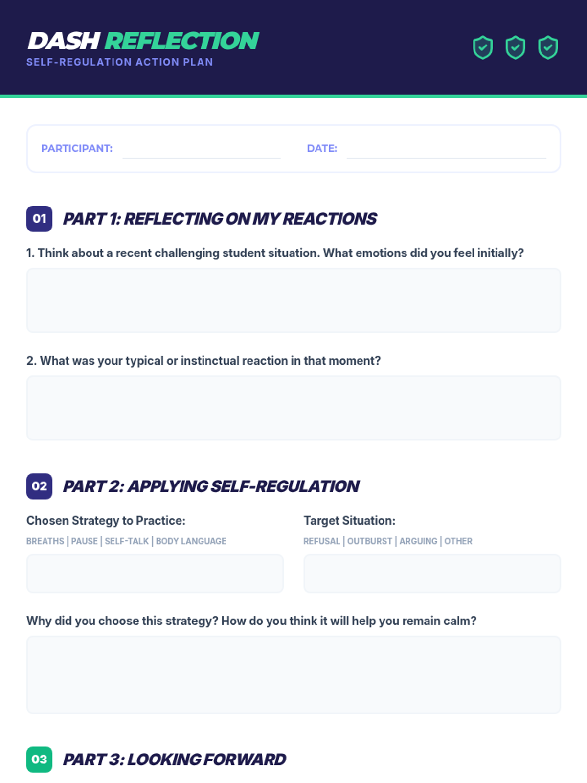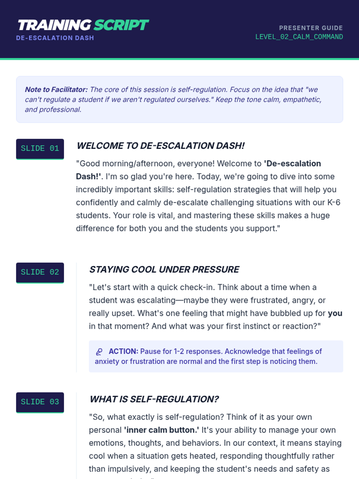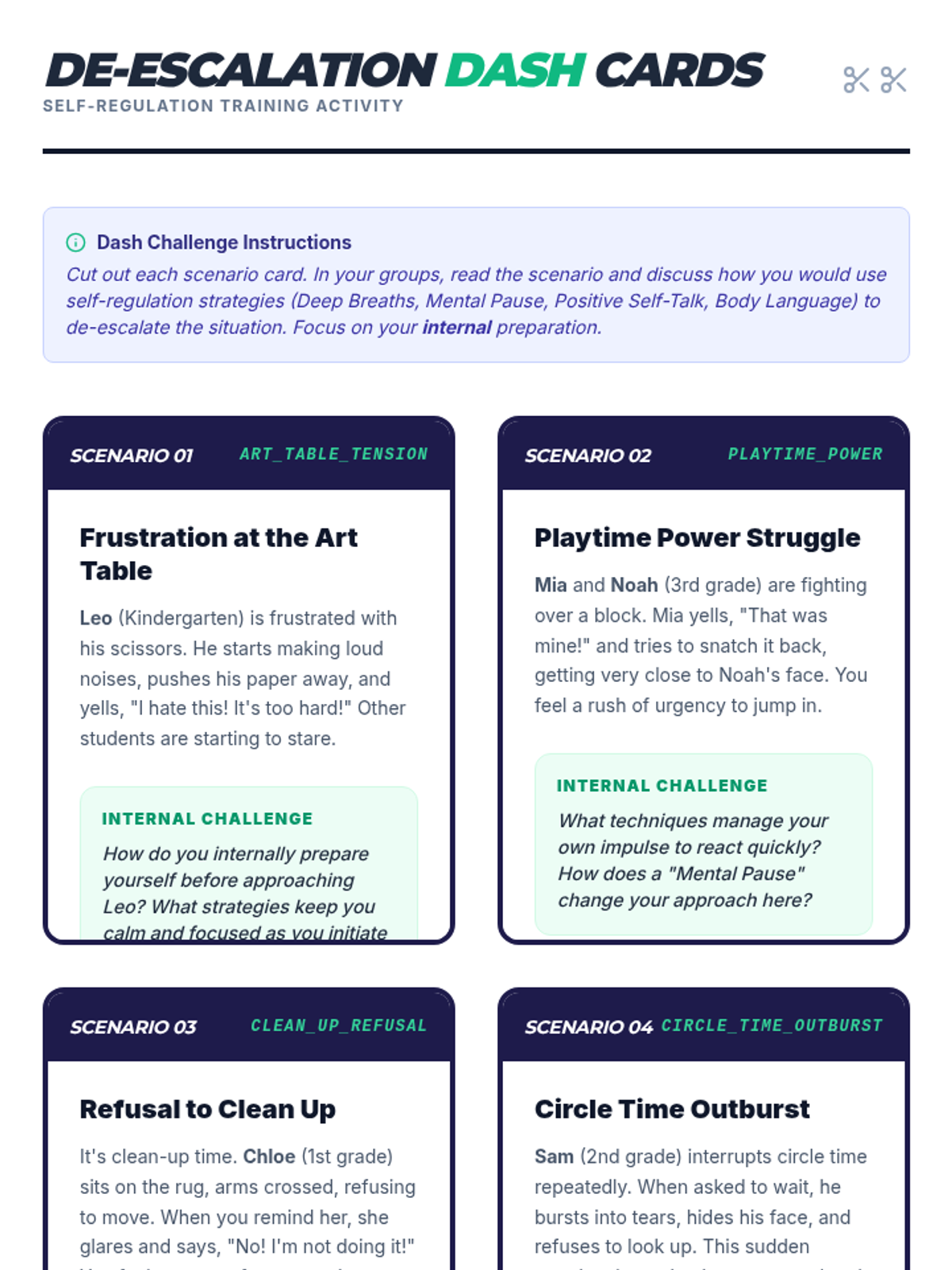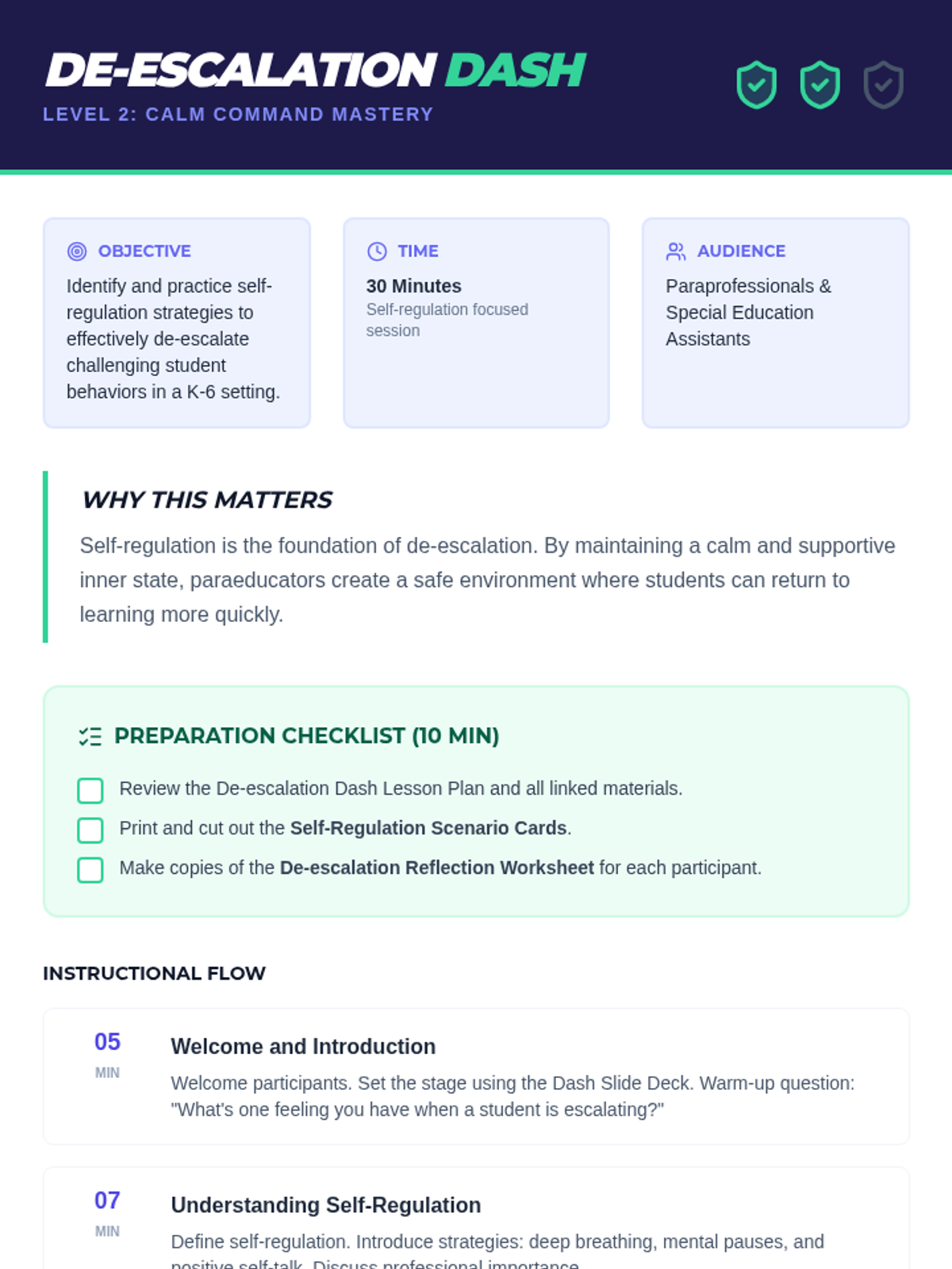 A 30-minute training session focusing on self-regulation strategies to help paraprofessionals effectively de-escalate challenging student behaviors.