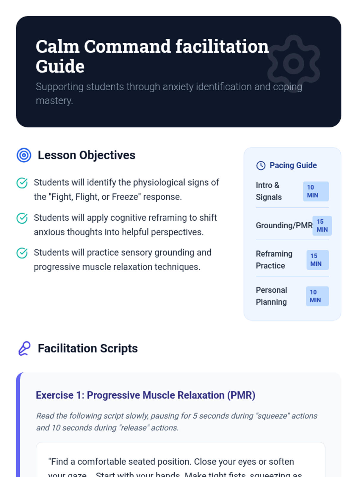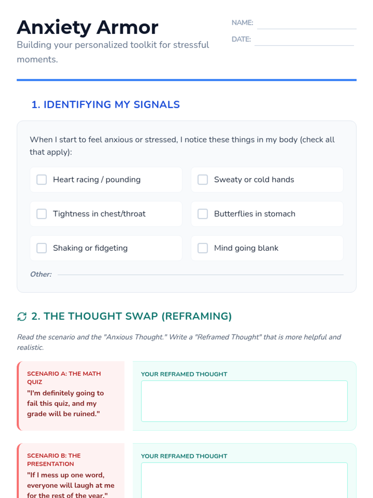 A comprehensive lesson designed to help students identify the physical and mental signs of anxiety and master practical coping strategies like cognitive reframing, grounding, and muscle relaxation.