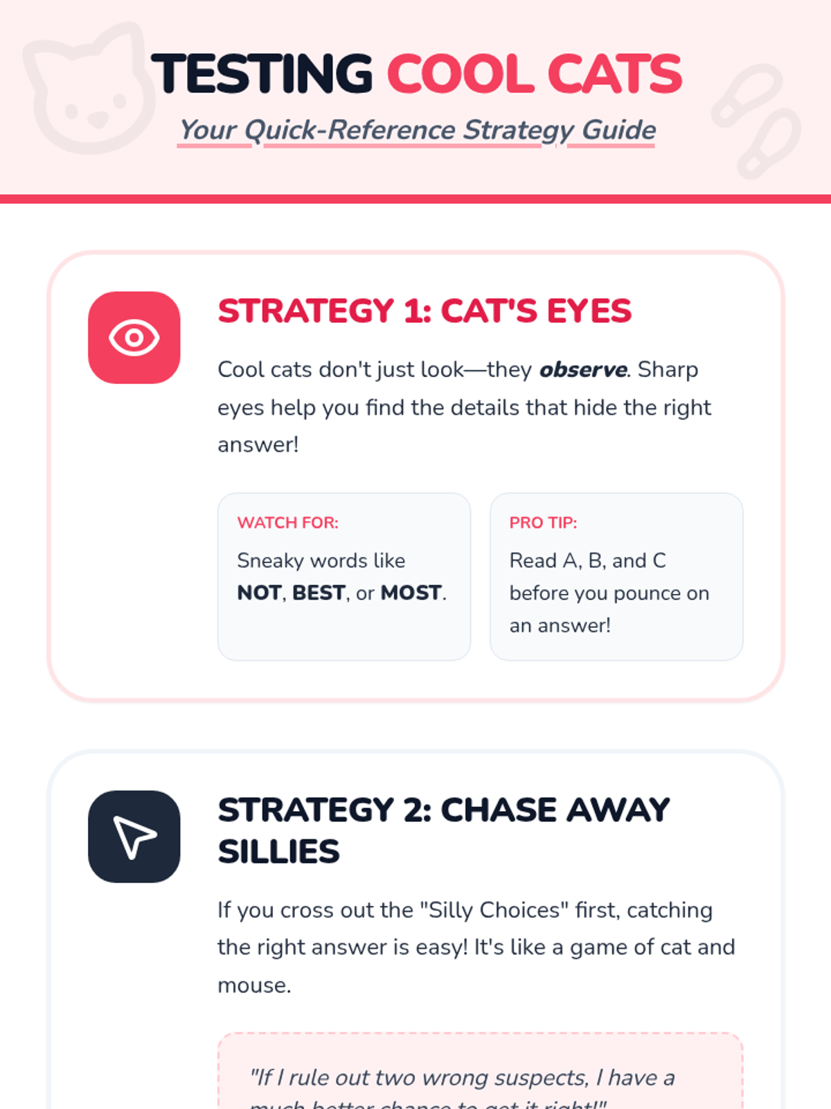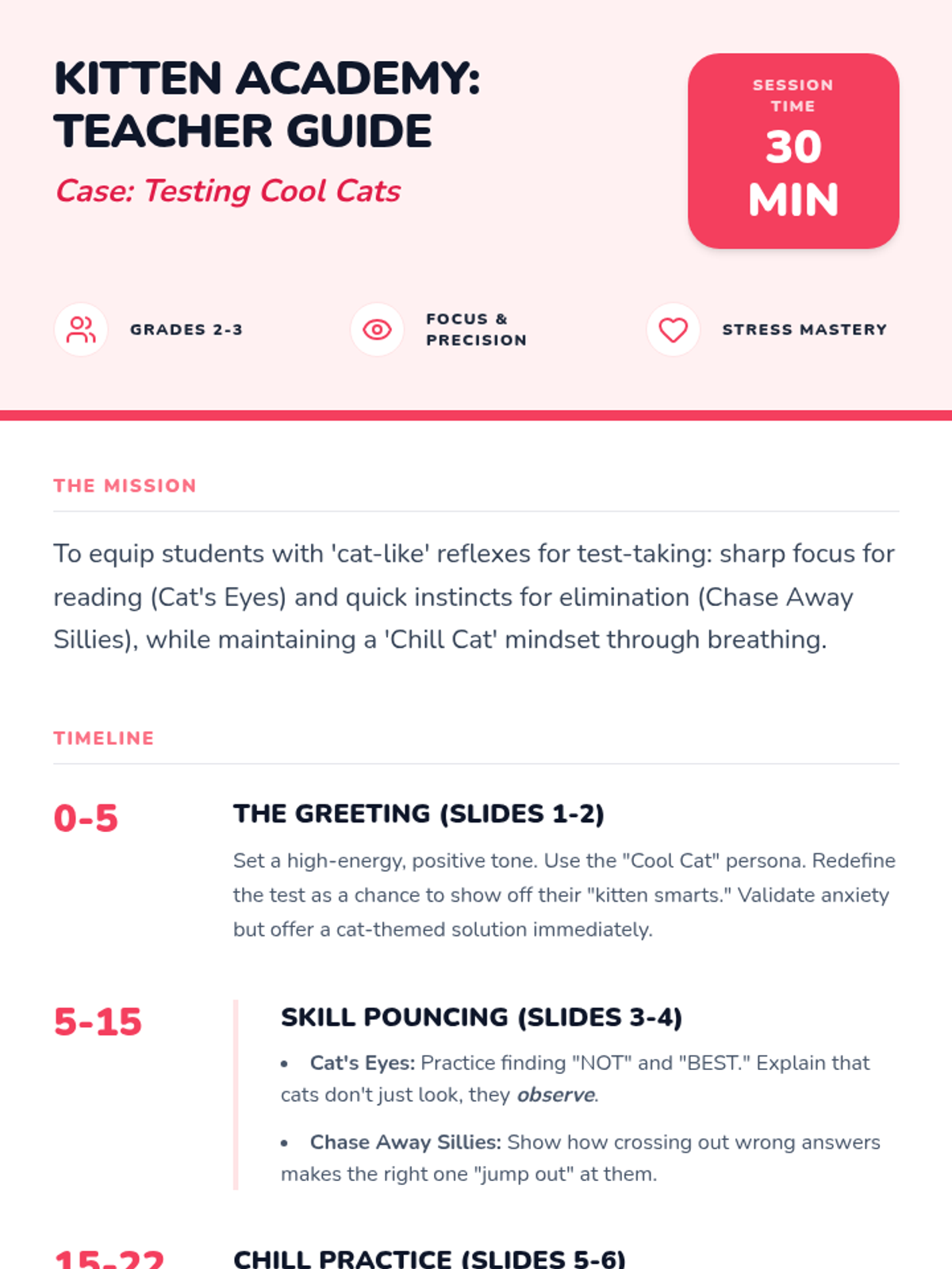 A 30-minute cat-themed lesson for 2nd and 3rd graders that teaches test-taking strategies as 'Cool Cat Skills' and coping skills for staying calm like a 'Chill Cat.'
