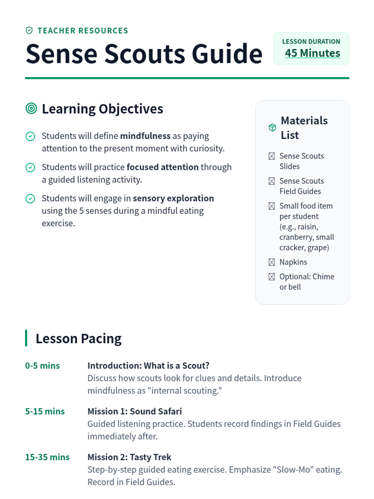 An introductory mindfulness lesson focusing on sharpening the senses through mindful listening and eating practices to help students stay present.
