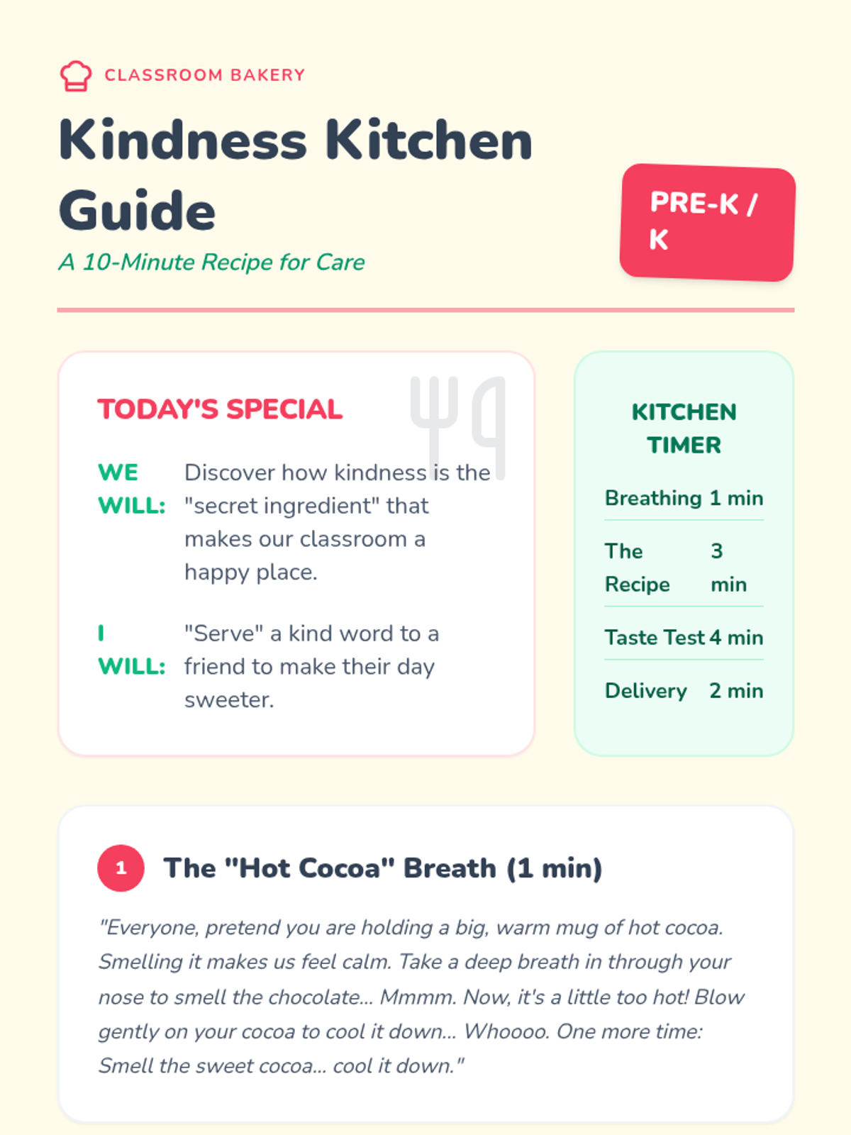 A whimsical, sensory-focused 10-minute introduction to kindness using a "Kindness Kitchen" theme, moving away from rule-based scenarios to focus on the 'sweetness' of care and proactive helpfulness.
