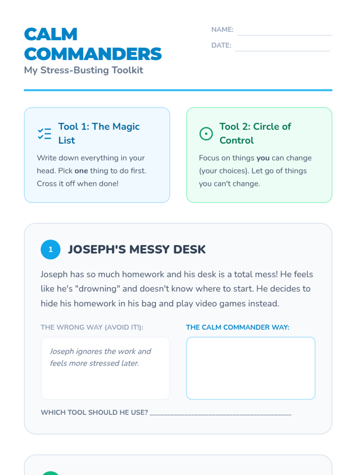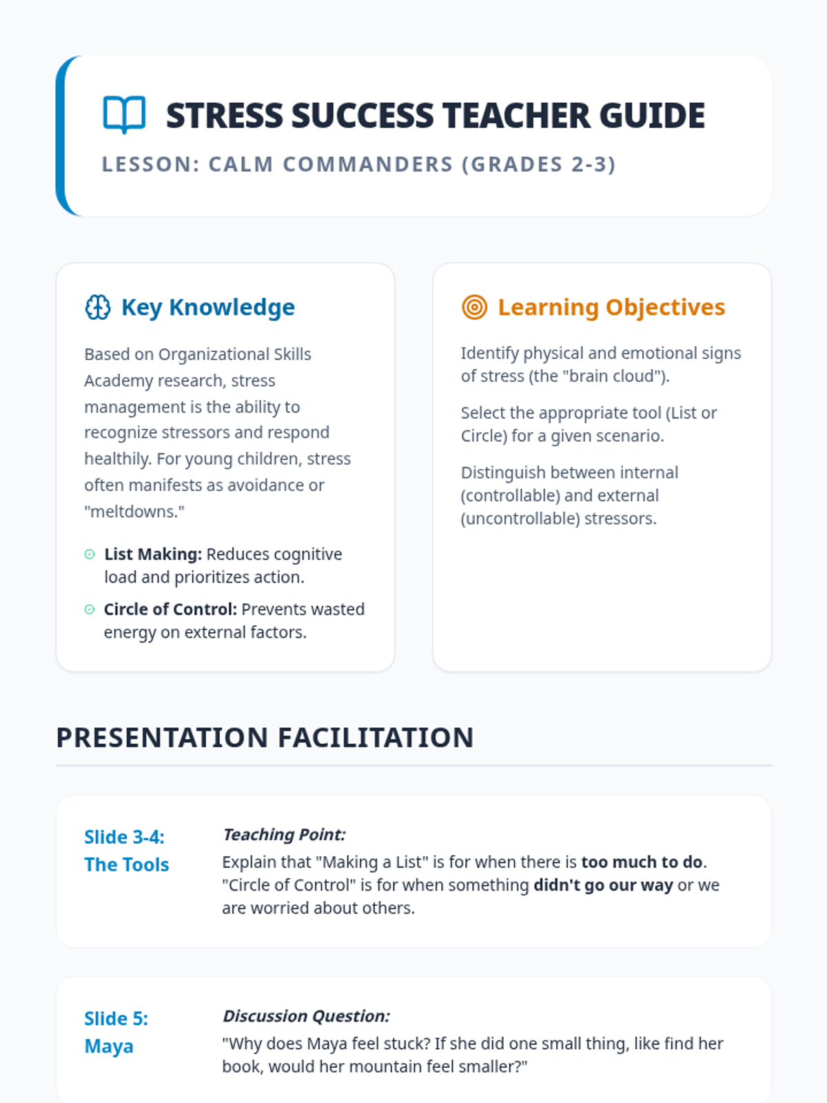A lesson designed for 2nd and 3rd graders to recognize stressors and apply management techniques like 'Making a List' and the 'Circle of Control'. Students will practice turning overwhelming moments into manageable actions through relatable scenarios.