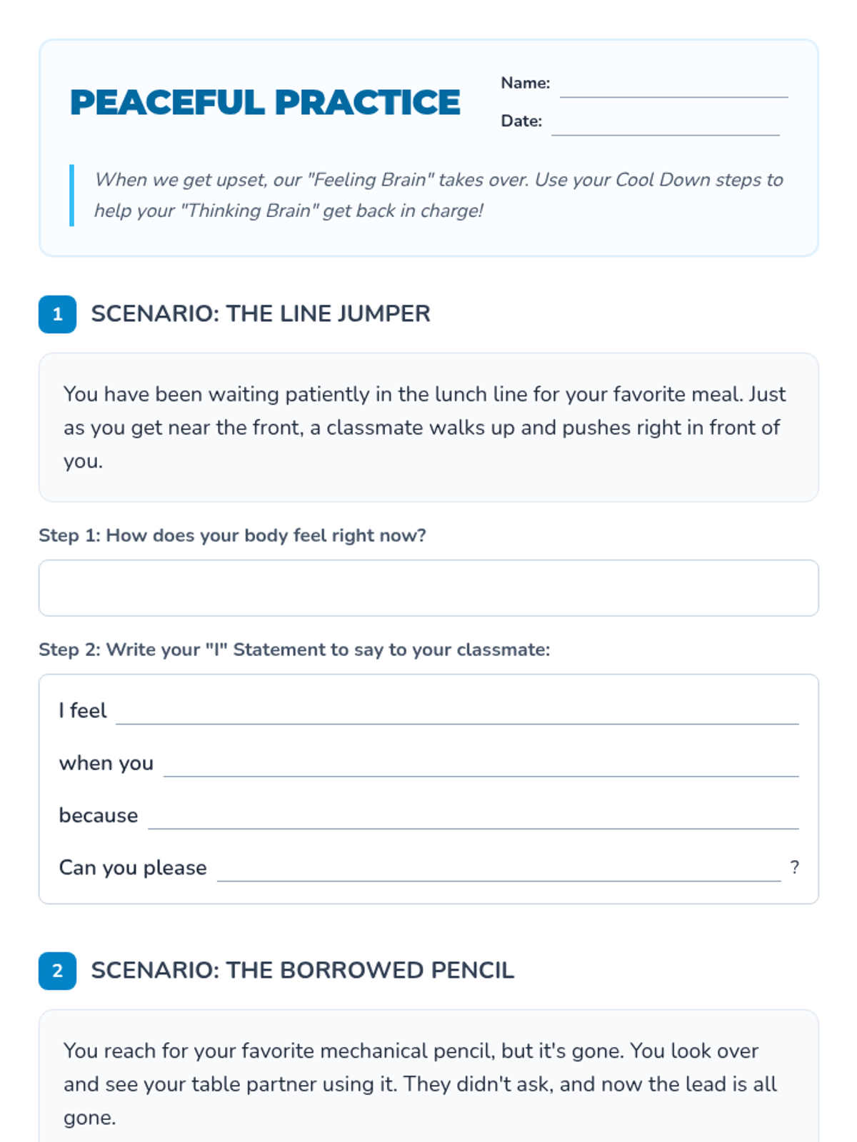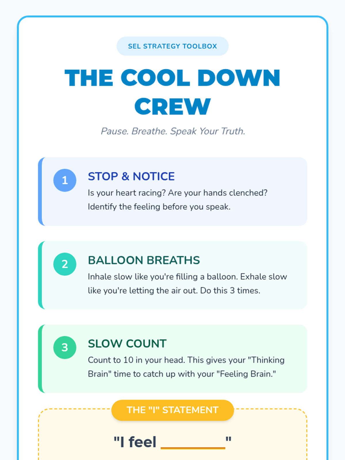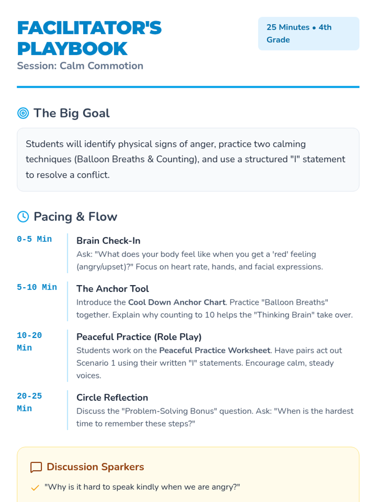 A small group session focused on self-regulation techniques and effective communication during conflicts, specifically designed for 4th graders. Students learn to calm their bodies and use 'I' statements to express their needs peacefully.