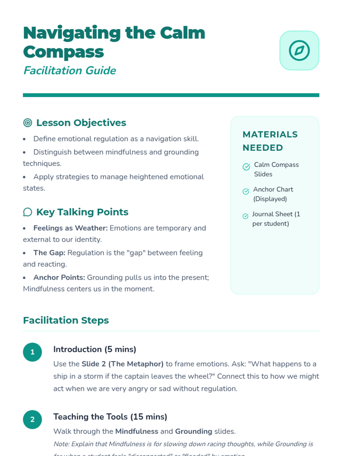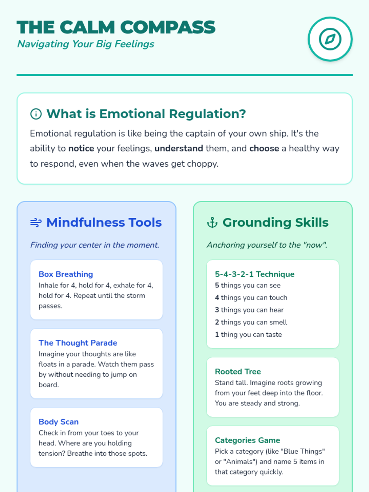 This lesson introduces students to the concept of emotional regulation through the 'Calm Compass' framework, focusing on mindfulness and grounding techniques to navigate big feelings.