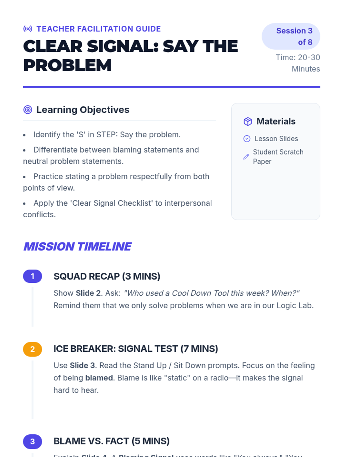 Focus on the 'S' in STEP: Say the problem. Students learn to describe interpersonal conflicts respectfully and without blaming others.