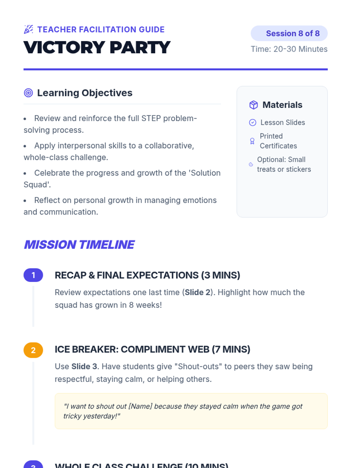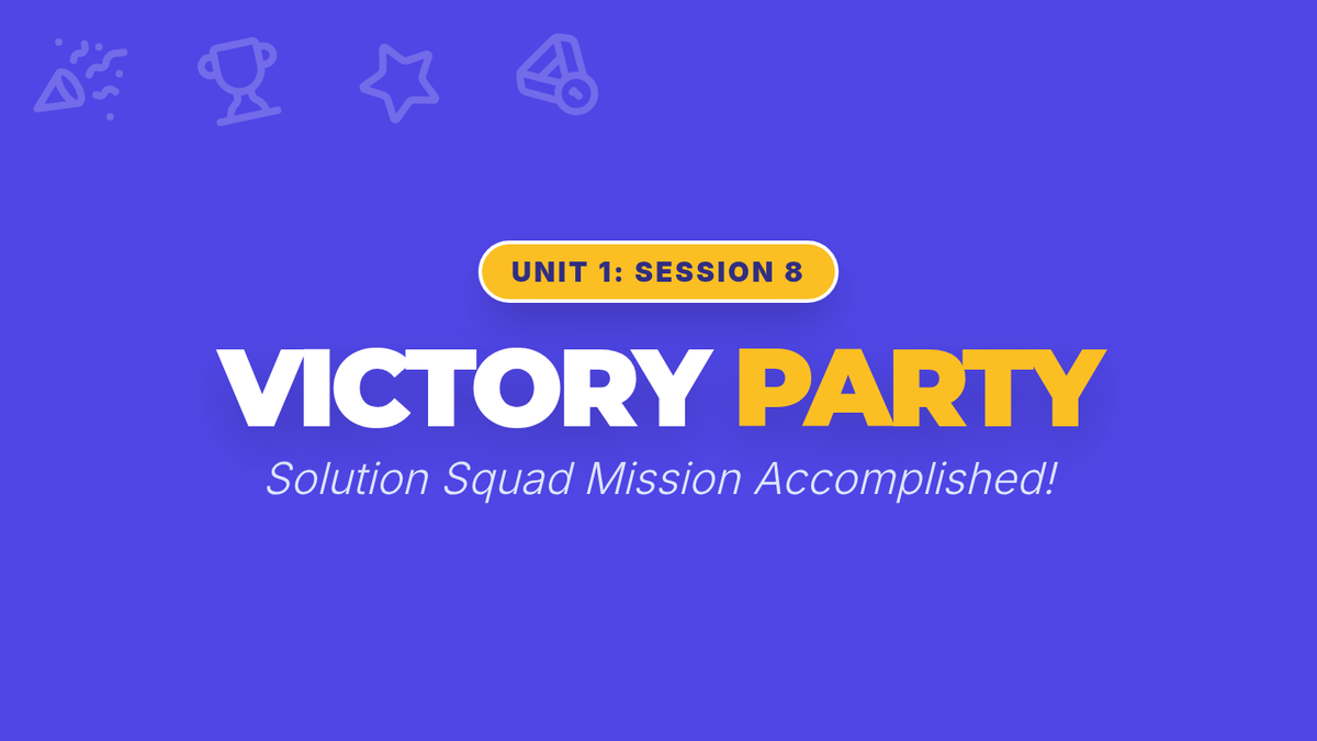 A culminating session where students apply the full STEP process to a final whole-class challenge and celebrate their growth as Solution Squad members.