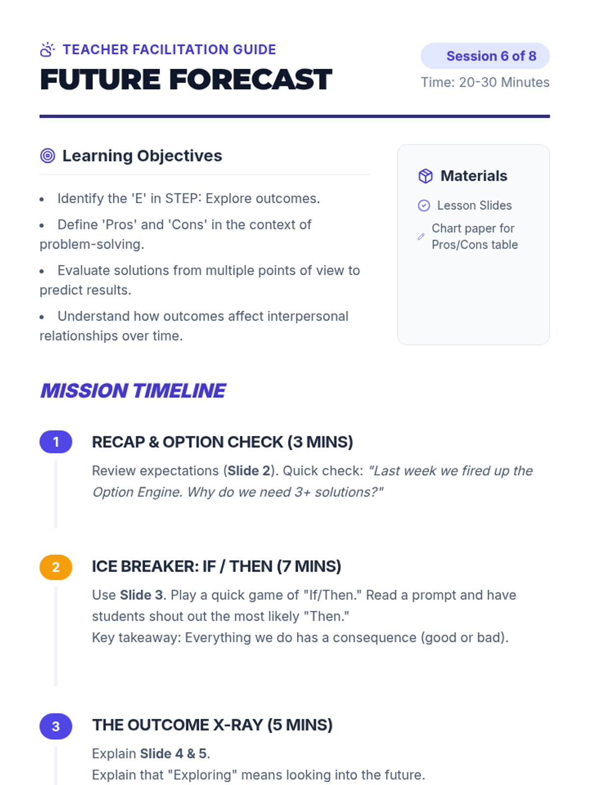 Focus on the 'E' in STEP: Explore outcomes. Students evaluate the possible consequences (pros and cons) of their solutions from all perspectives involved.