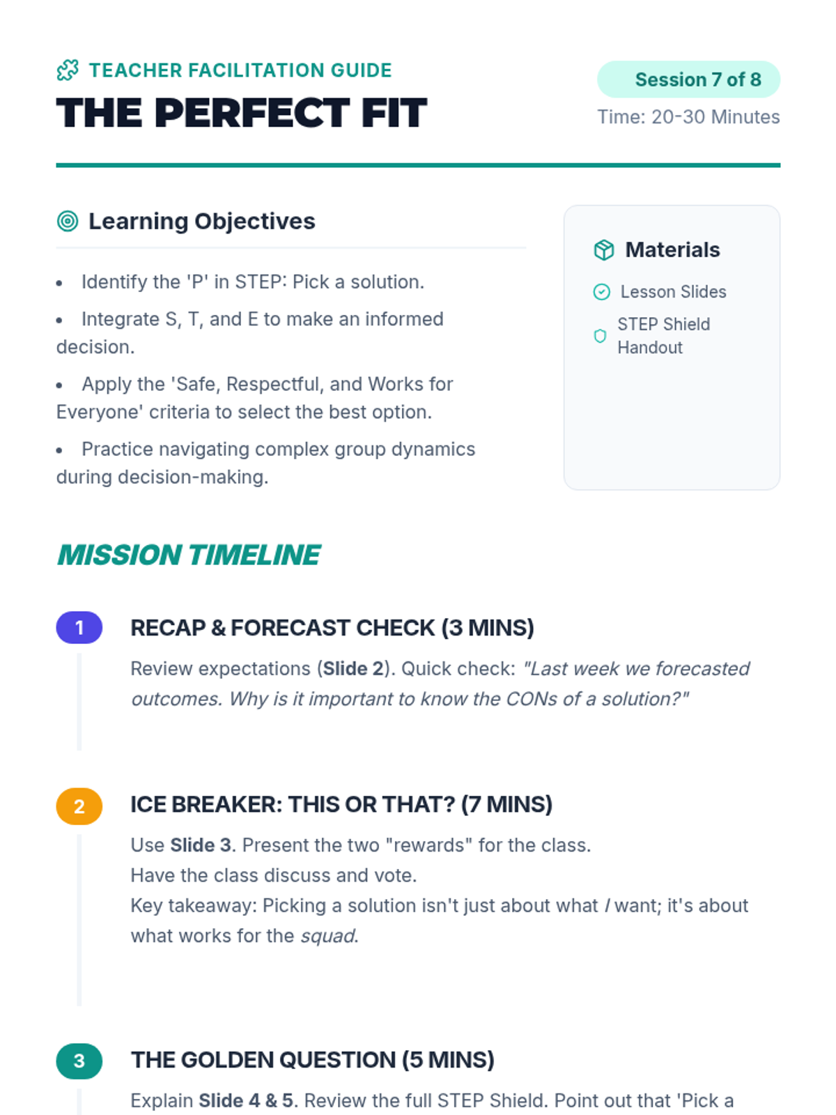 Focus on the 'P' in STEP: Pick a solution. Students synthesize all previous steps to choose the best, most respectful solution for everyone involved.
