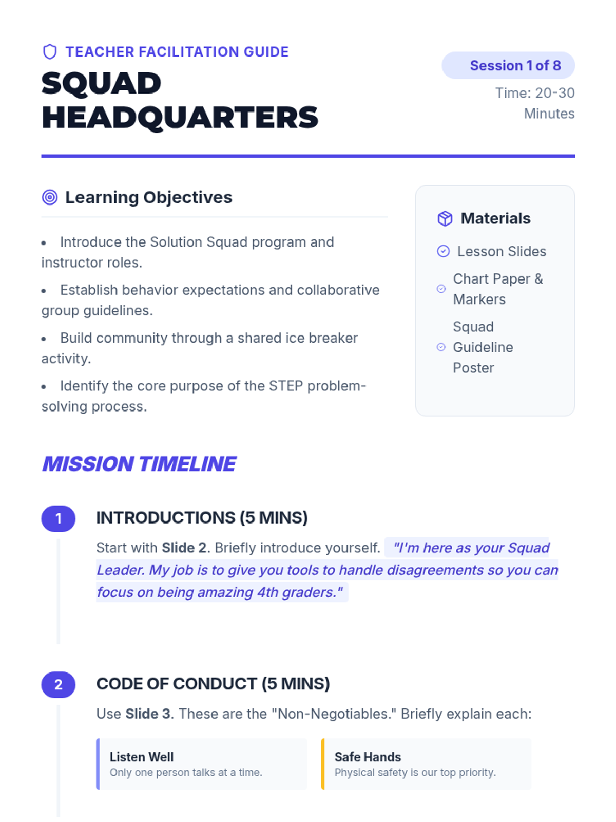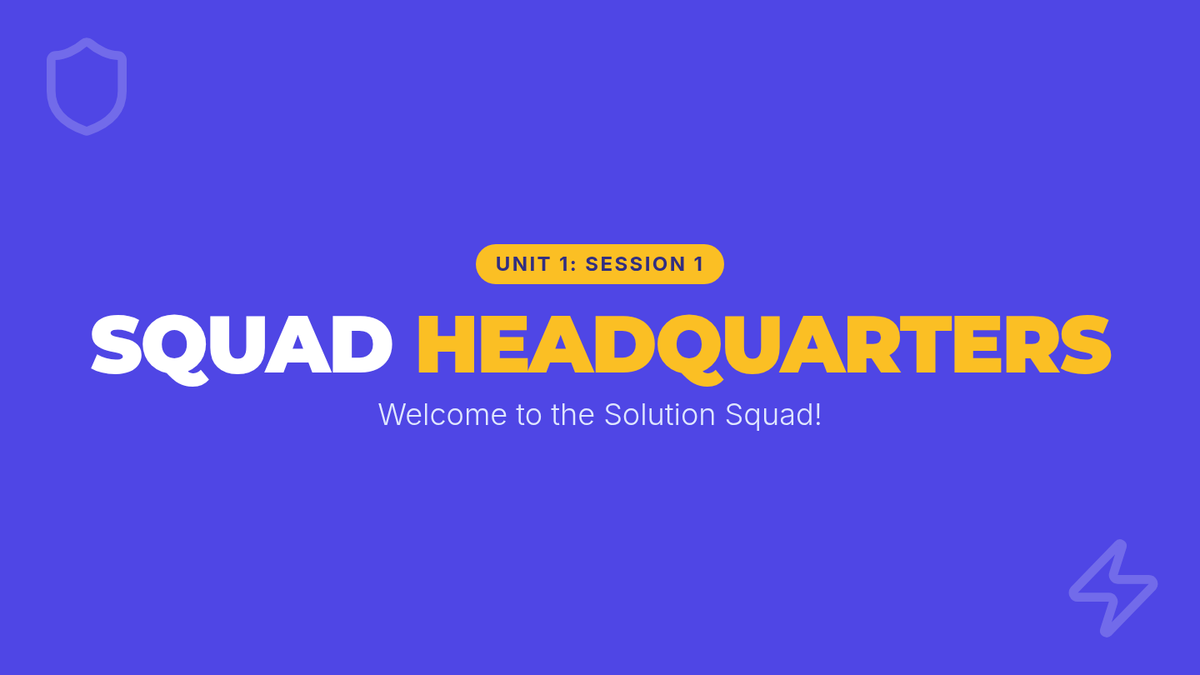 Introduce the instructor, establish group guidelines, and build community through ice breakers. Students learn what the Solution Squad is all about and set expectations for the next 8 weeks.