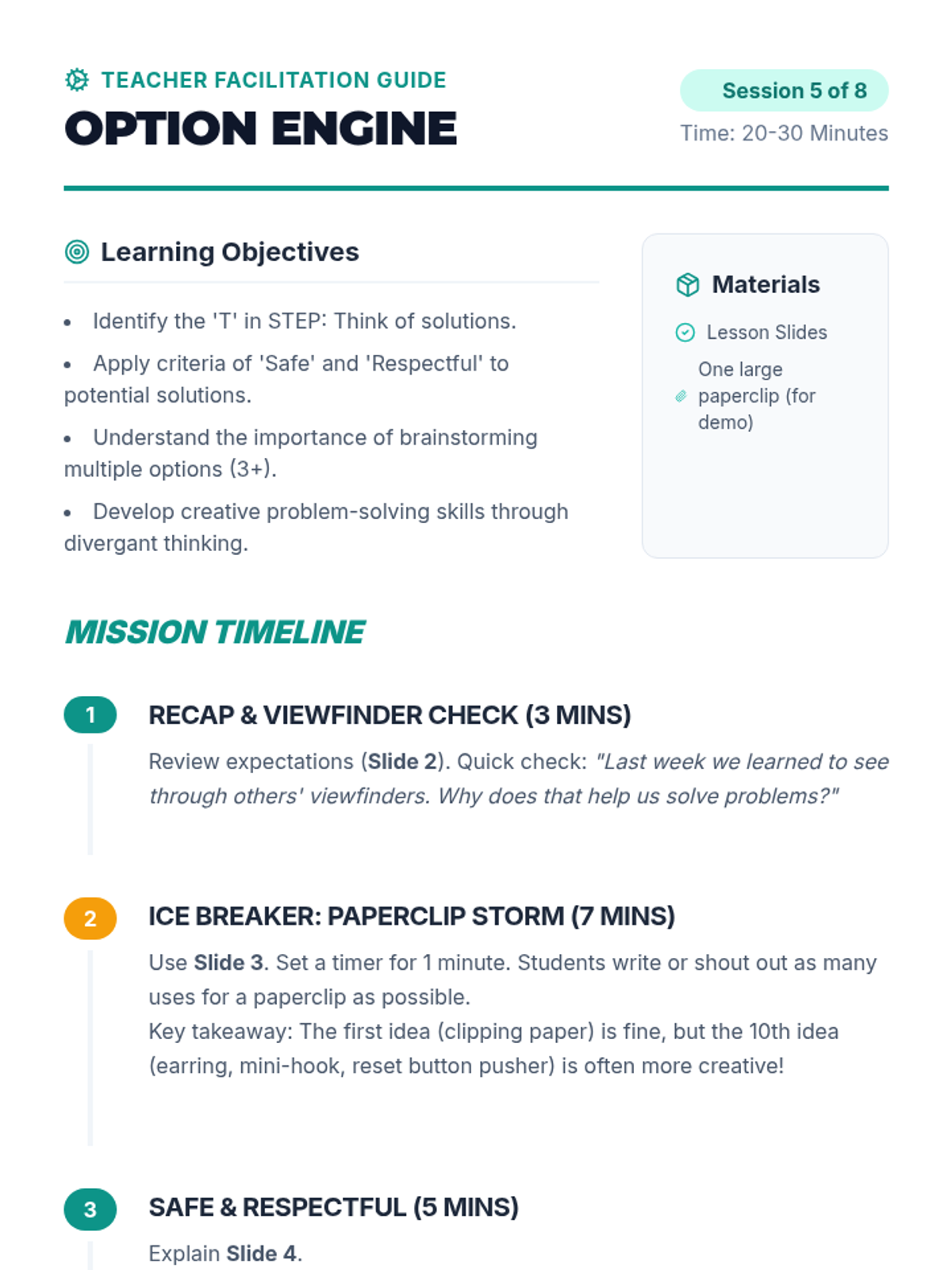 Focus on the 'T' in STEP: Think of solutions. Students brainstorm multiple safe and respectful ideas to solve a variety of interpersonal problems.