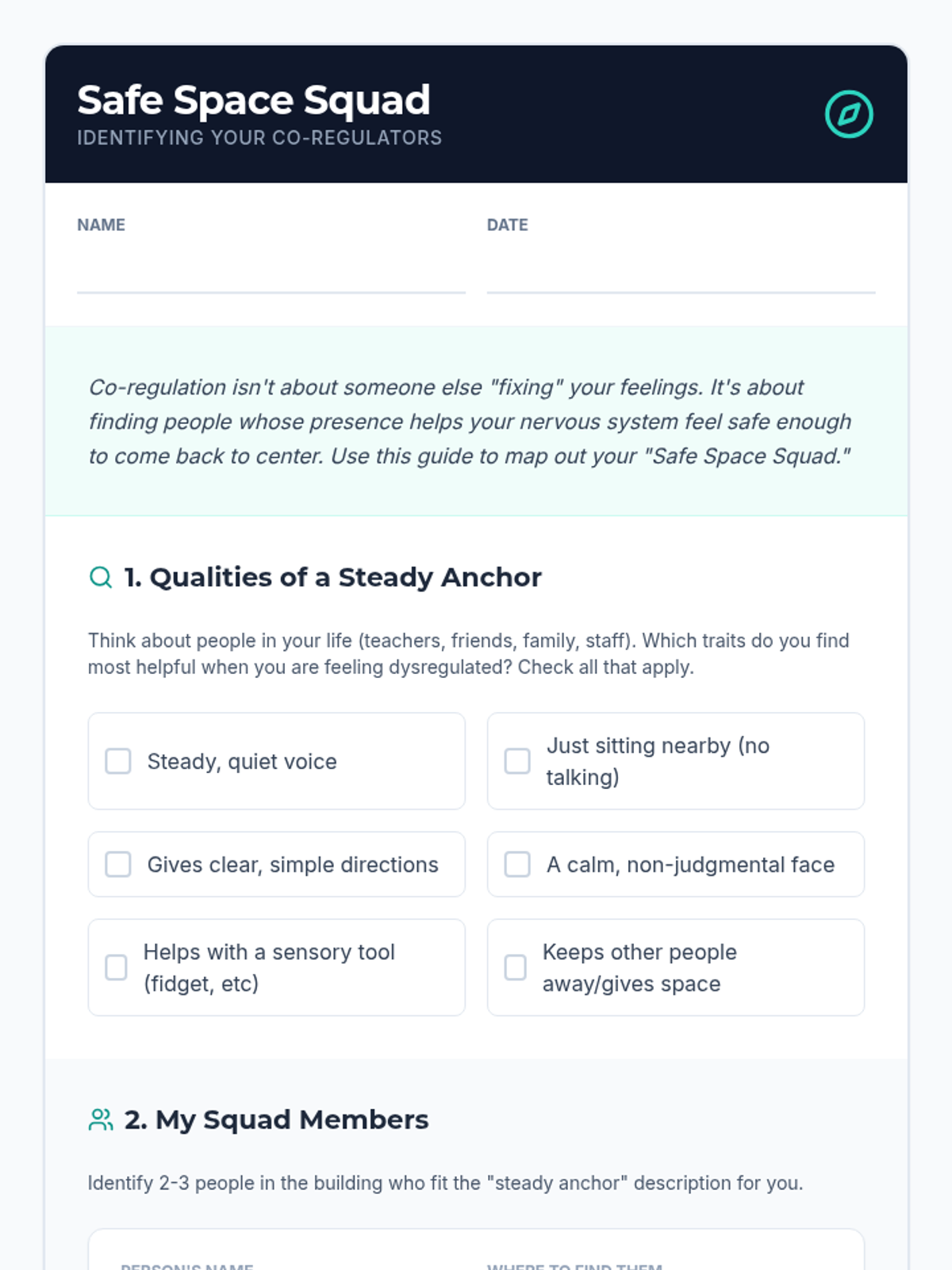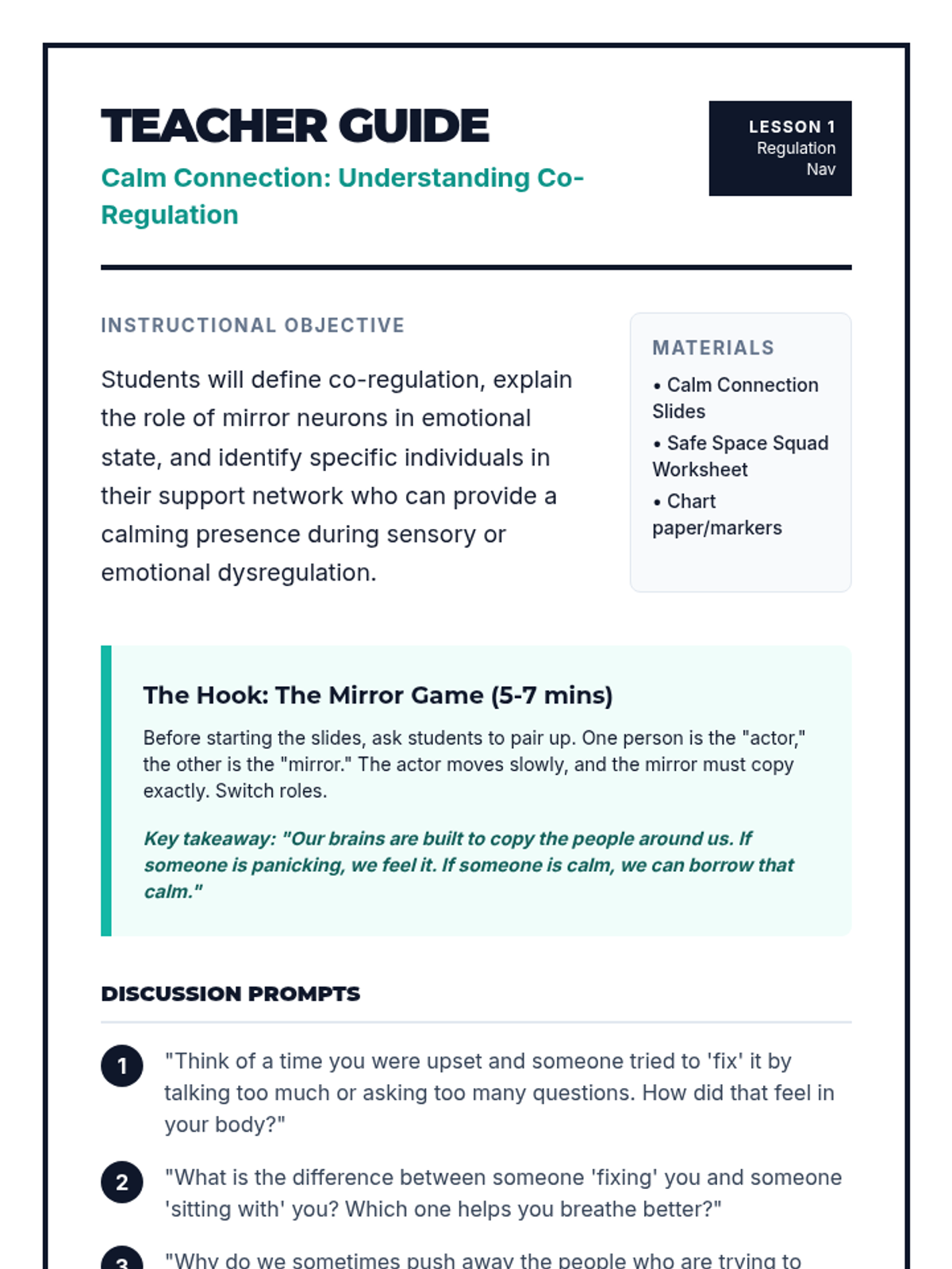Students explore co-regulation and identify 'safe people' who help them return to a calm state through social cues and presence.