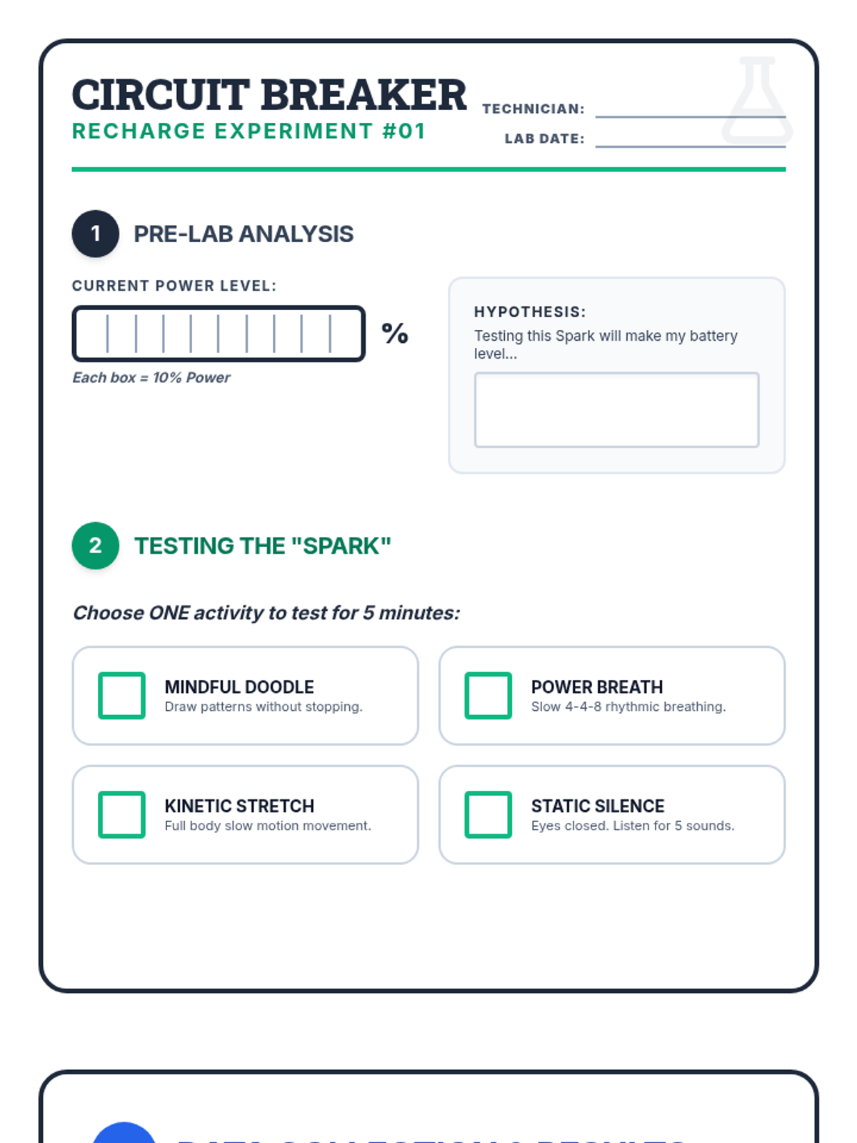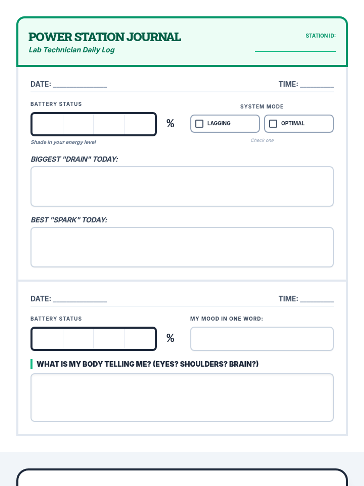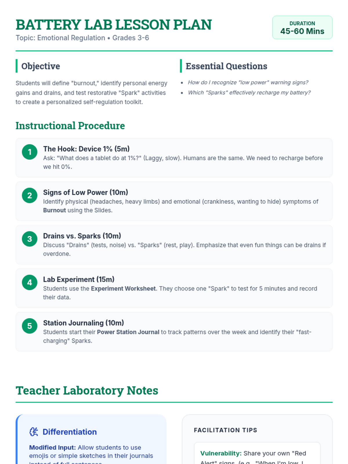 A hands-on emotional regulation lesson that treats energy management like a scientific experiment. Students in grades 3-6 learn to identify energy drains, recognize signs of burnout, and test specific 'recharging' activities to maintain their internal battery.