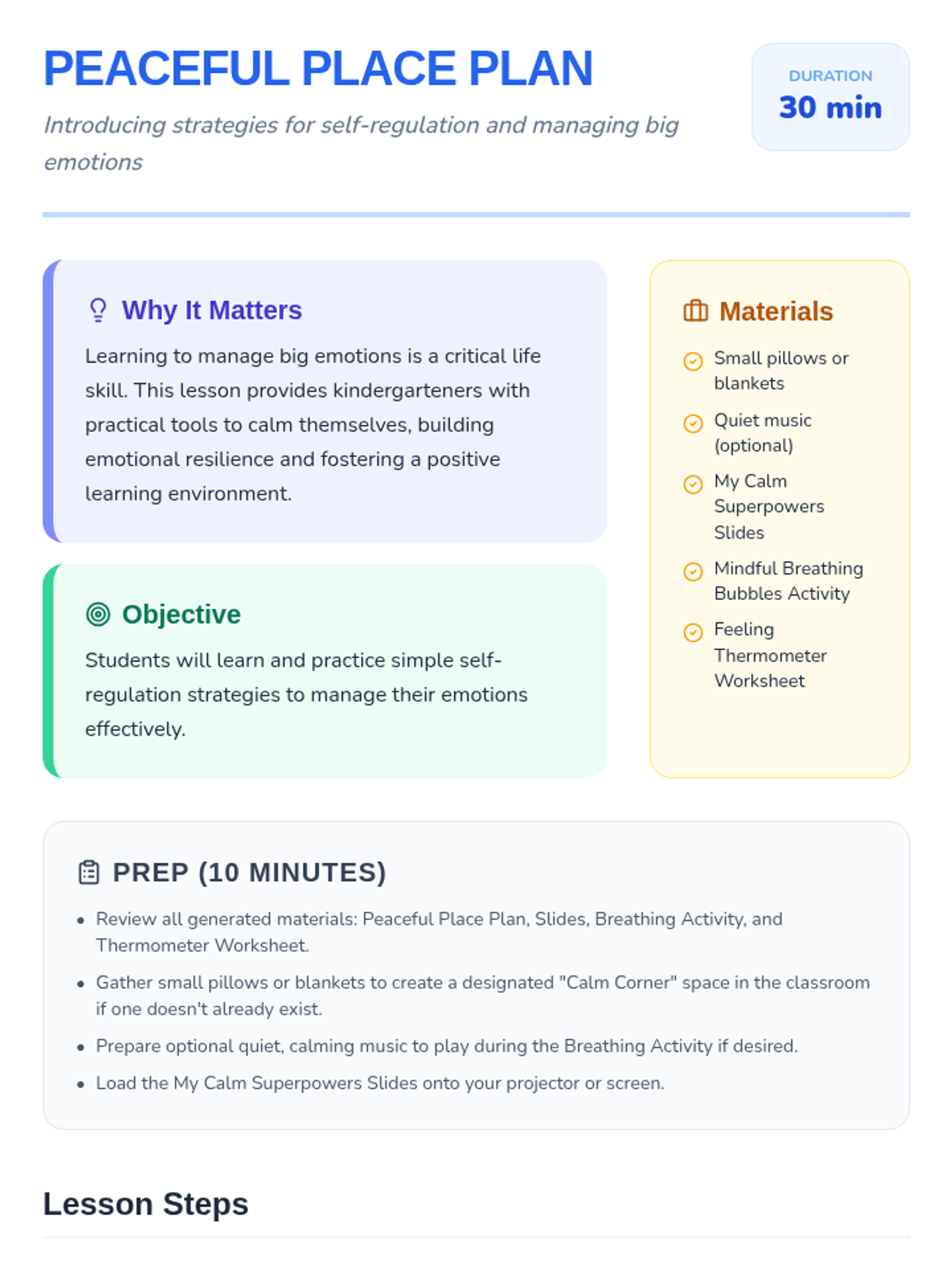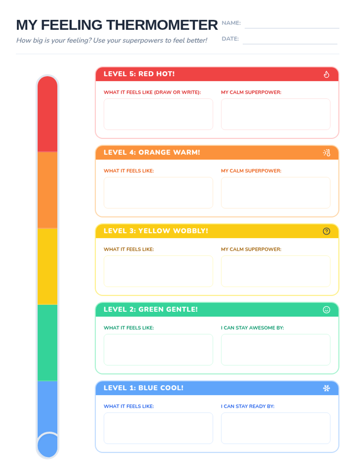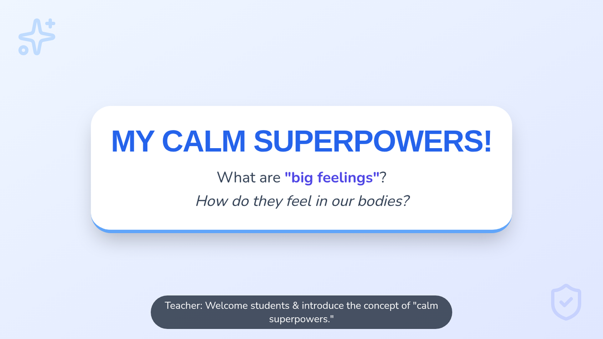 A small-group lesson for kindergarteners to learn self-regulation strategies and calming techniques for managing big emotions. Students explore their 'calm superpowers' and practice using a feeling thermometer to identify and respond to their emotional states.