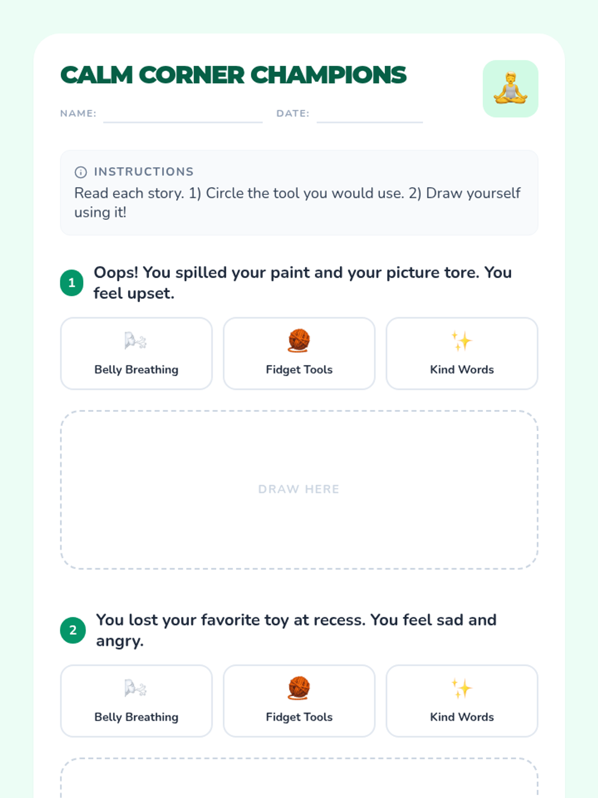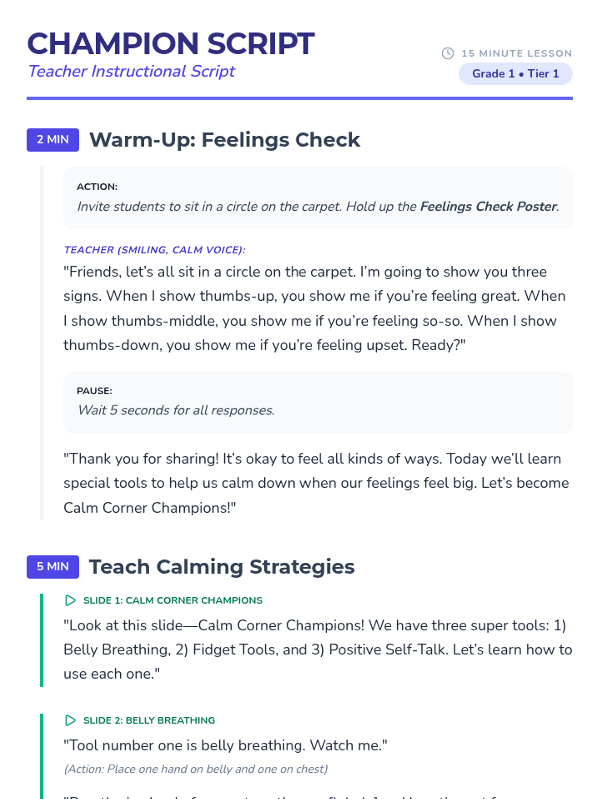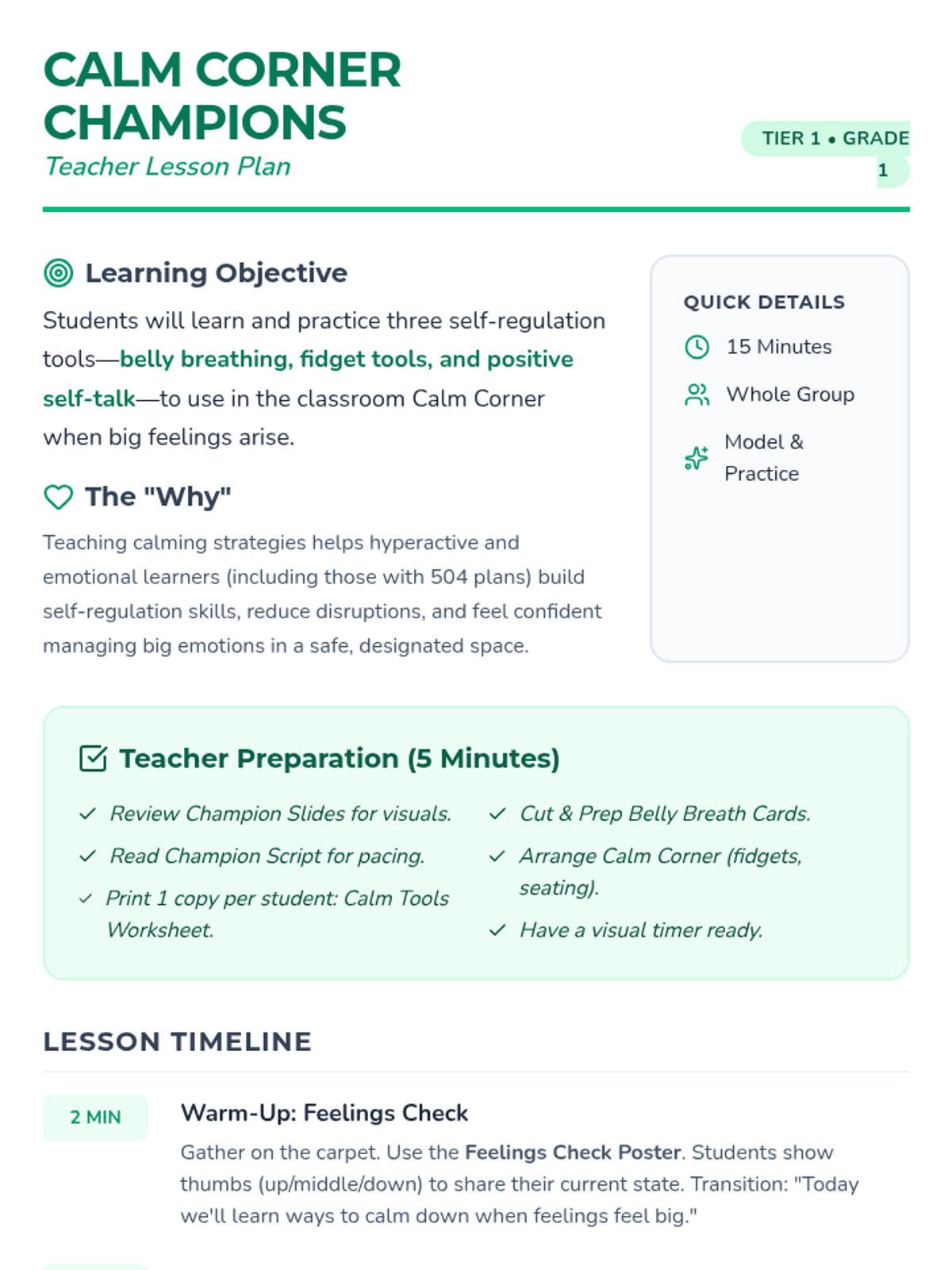 A 15-minute Tier 1 lesson for first graders to learn and practice self-regulation strategies in the classroom Calm Corner. Students explore belly breathing, fidget tools, and positive self-talk through modeling, guided practice, and reflection.