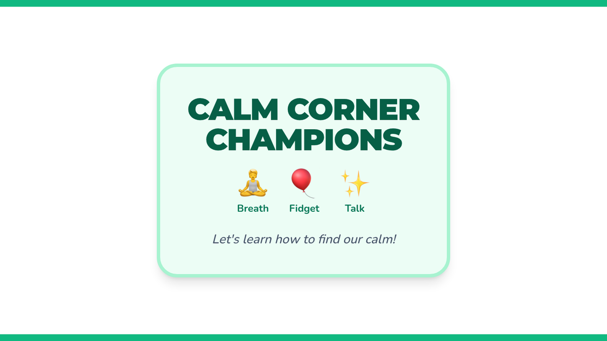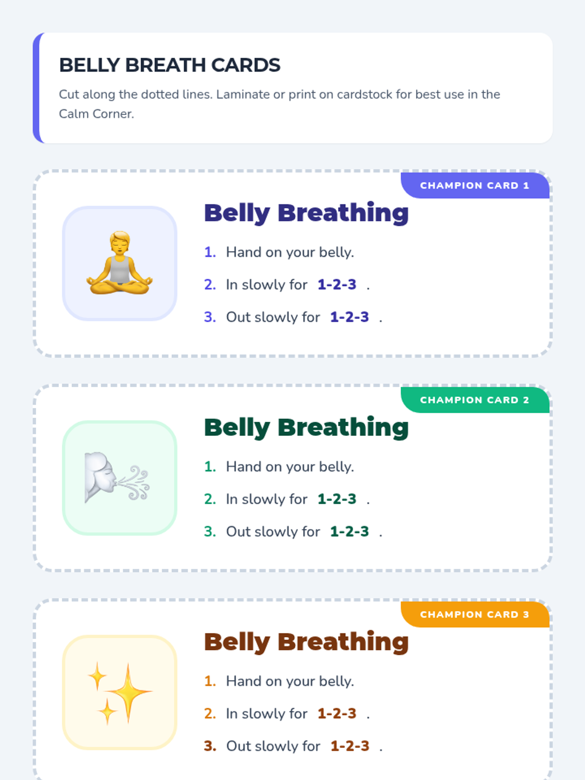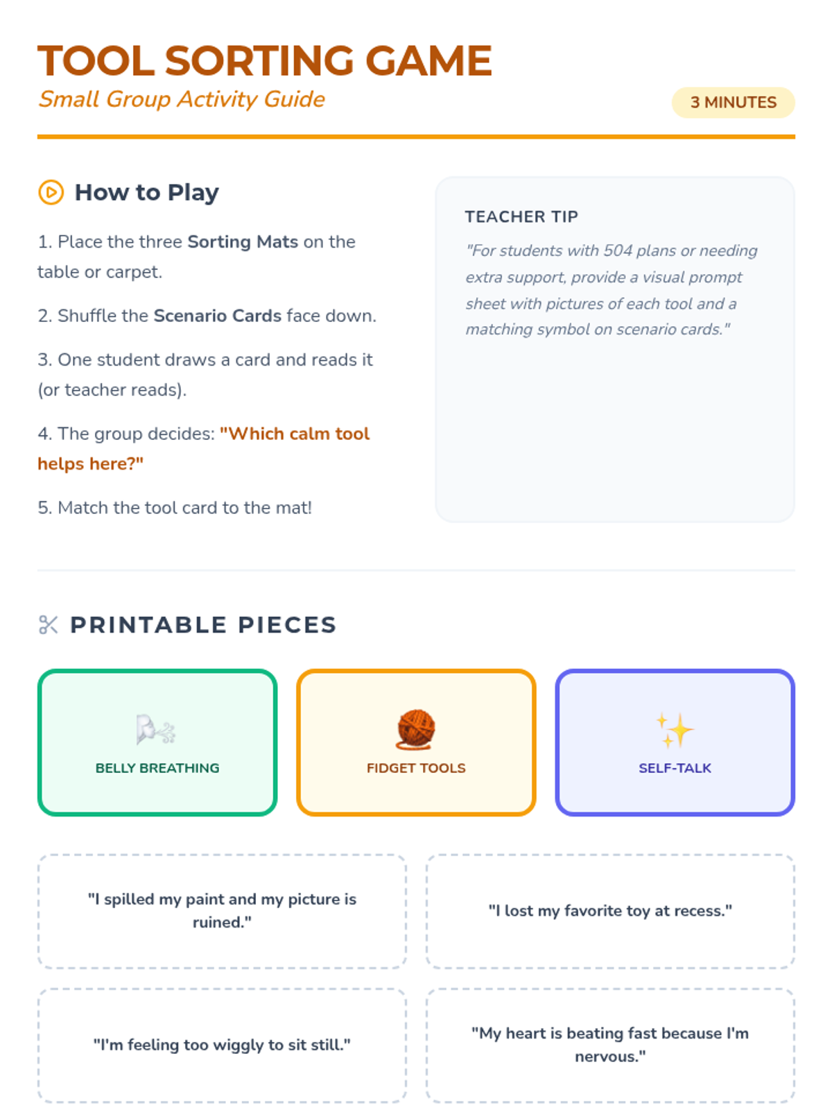 A 15-minute Tier 1 lesson for first graders to learn and practice self-regulation strategies in the classroom Calm Corner. Students explore belly breathing, fidget tools, and positive self-talk through modeling, guided practice, and reflection.