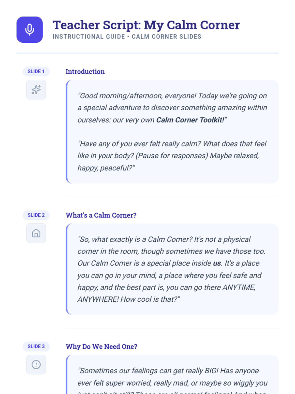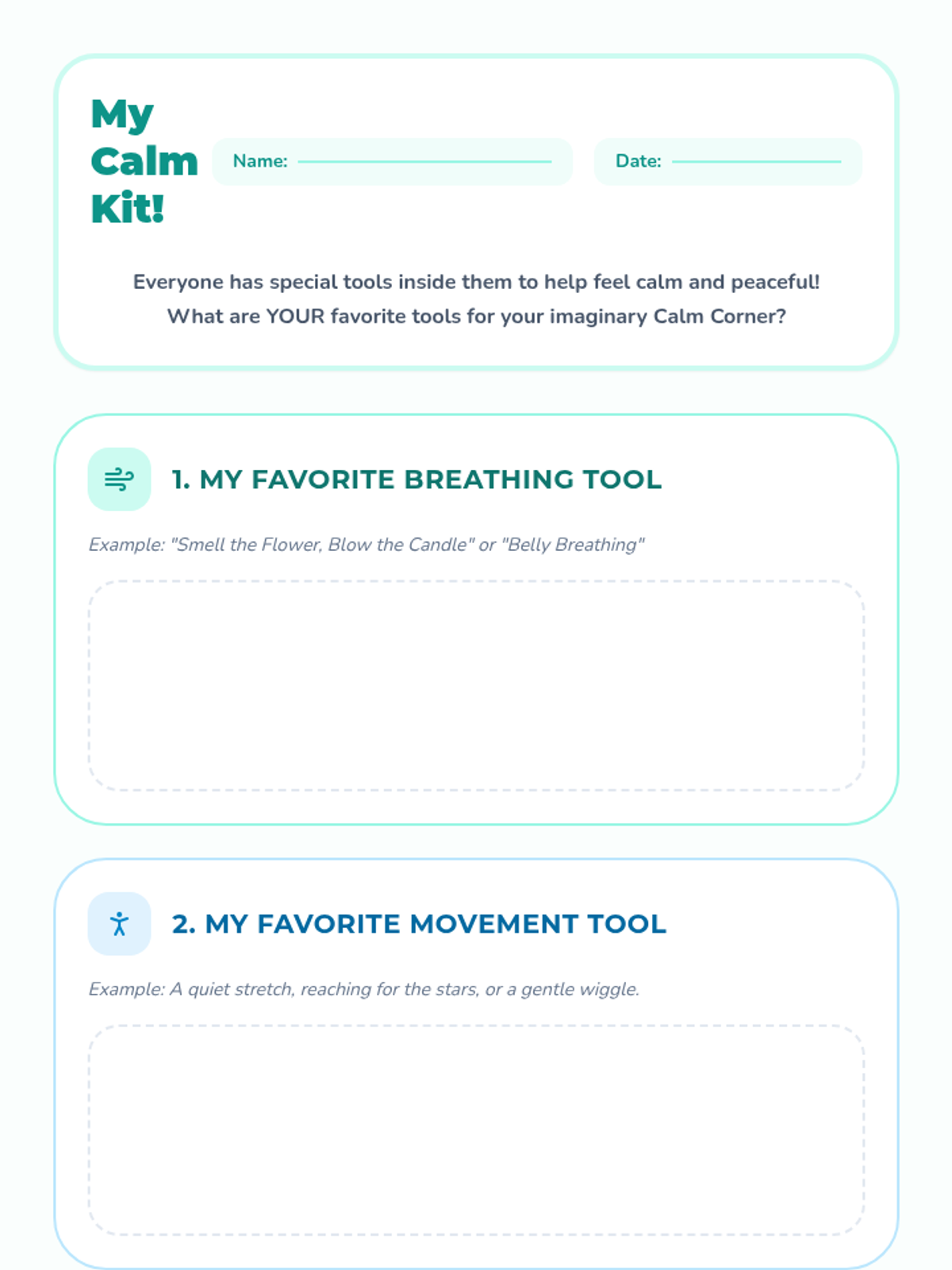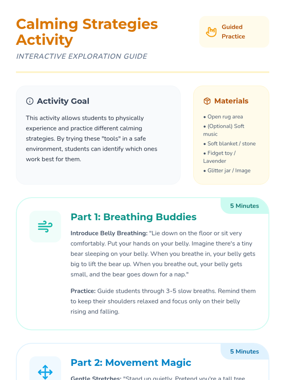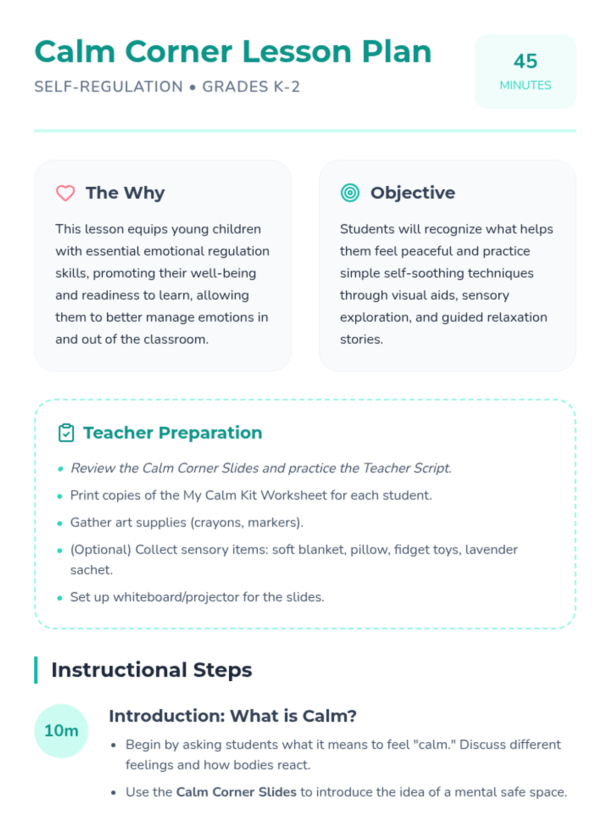 This lesson for K-2 students helps them identify personal calming strategies and create a mental 'calm corner' they can access anytime, anywhere. Students will explore breathing, movement, and sensory tools to build emotional regulation skills.