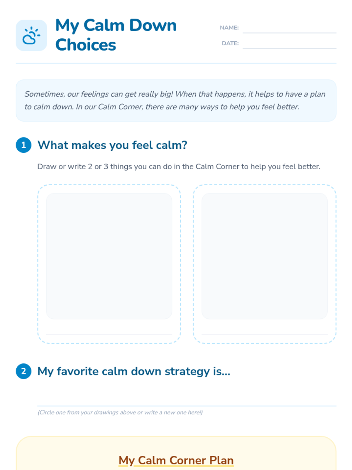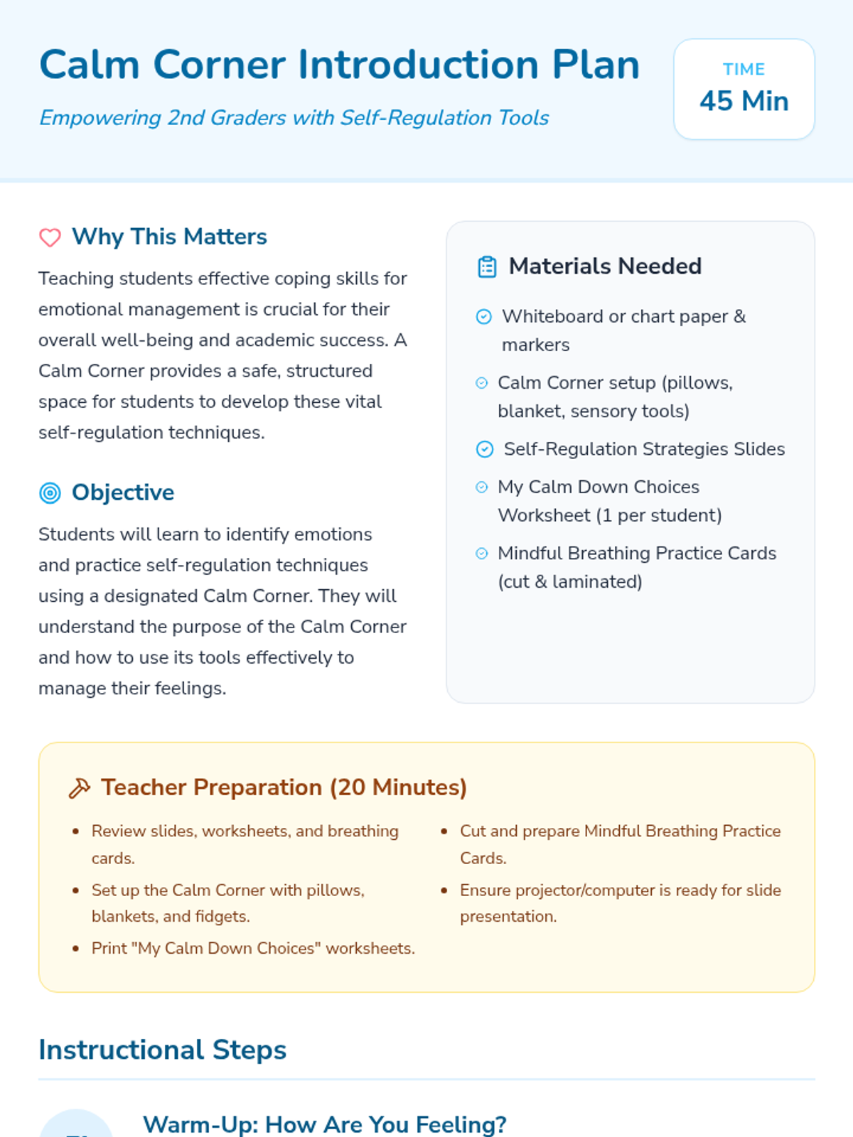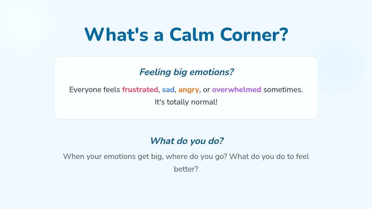 A comprehensive 45-minute lesson for 2nd graders to introduce self-regulation techniques and the use of a classroom 'Calm Corner' for emotional management.