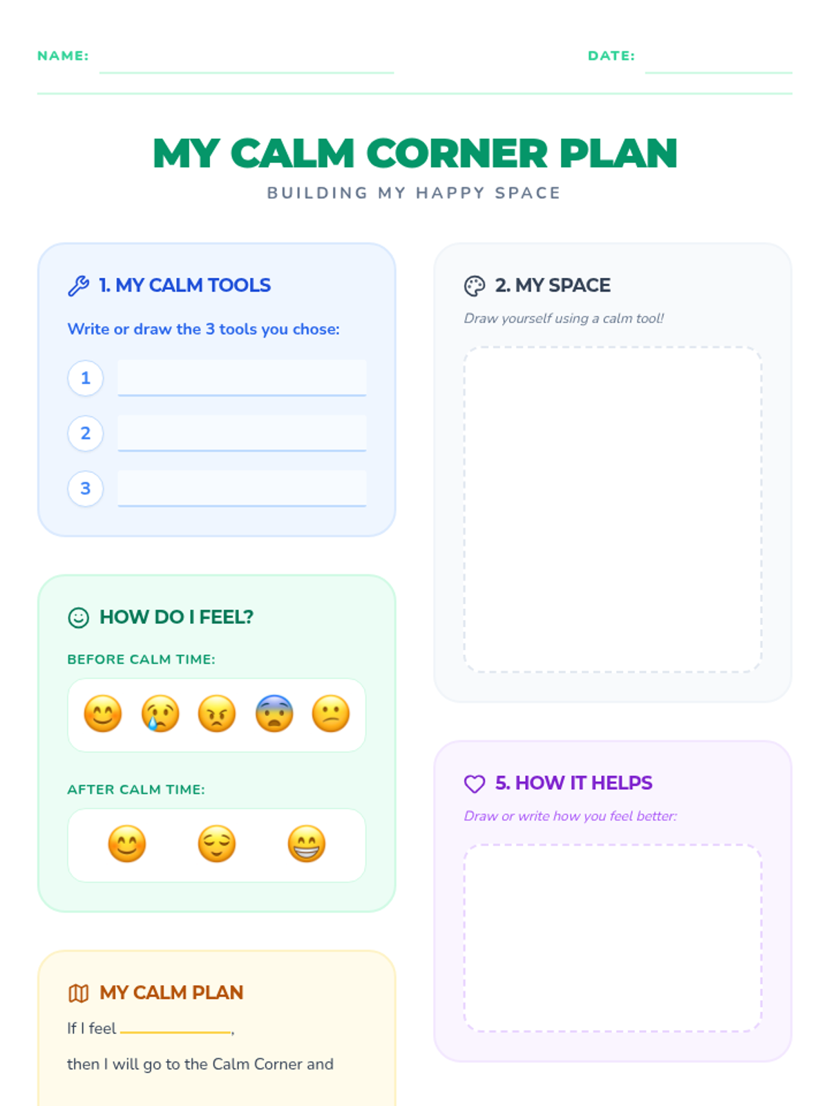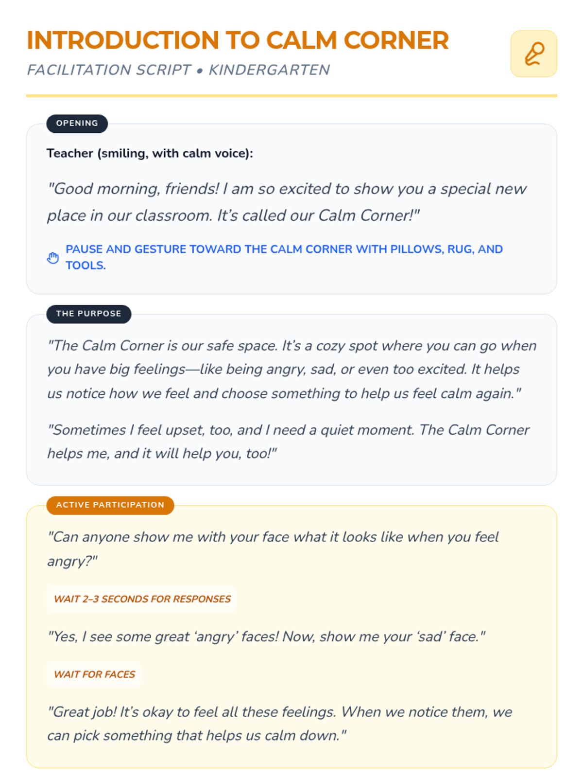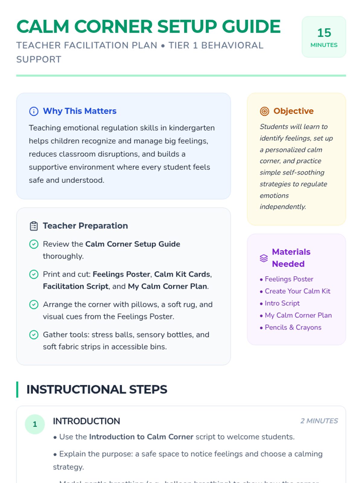 A 15-minute Tier 1 behavioral lesson for Kindergarten focused on identifying feelings and using a classroom calm-down corner for emotional regulation.
