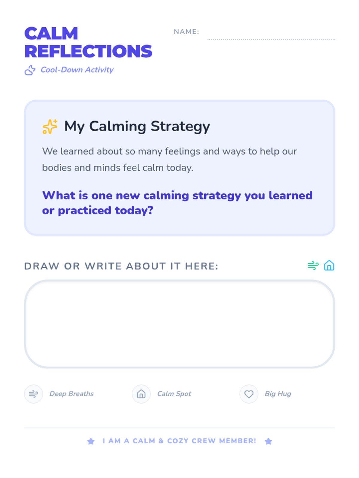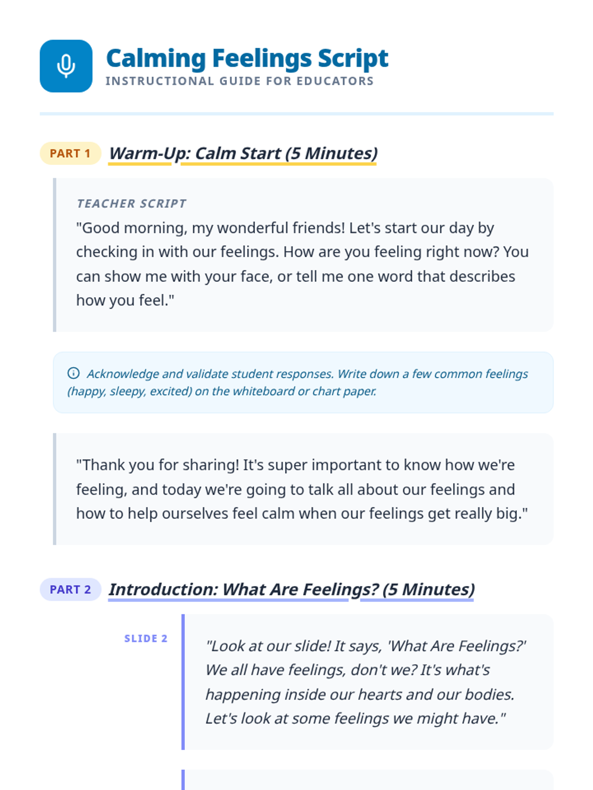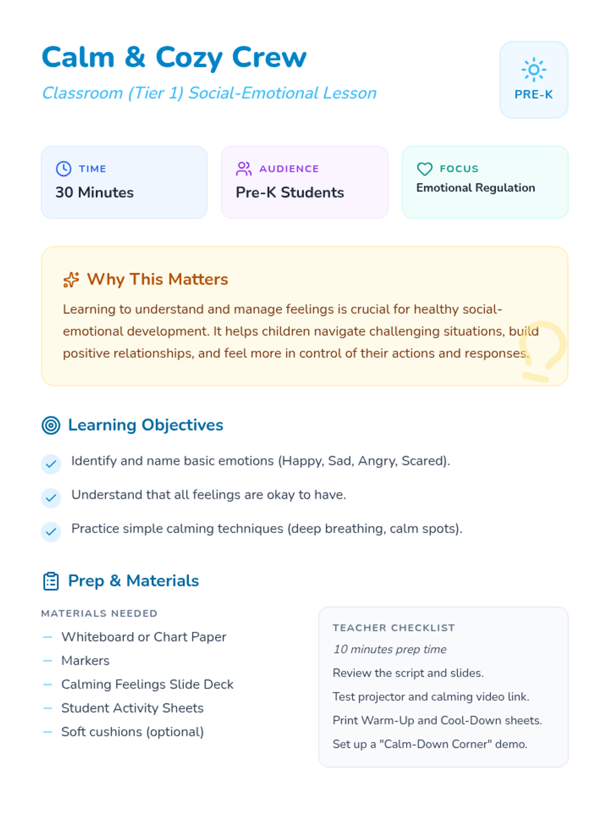 This lesson helps Pre-K students learn and practice simple strategies to manage big feelings and find calm through interactive discussion and guided practice.