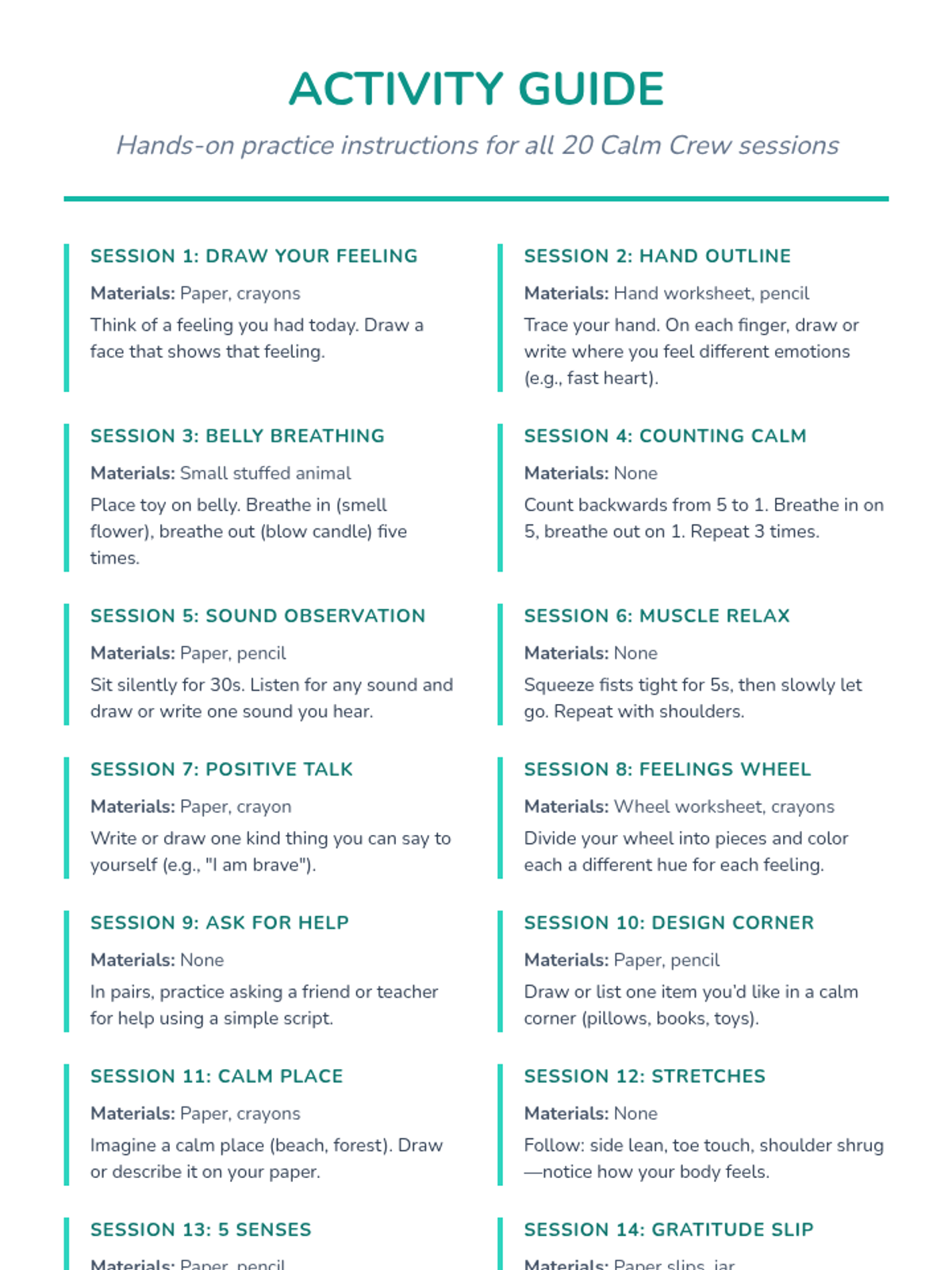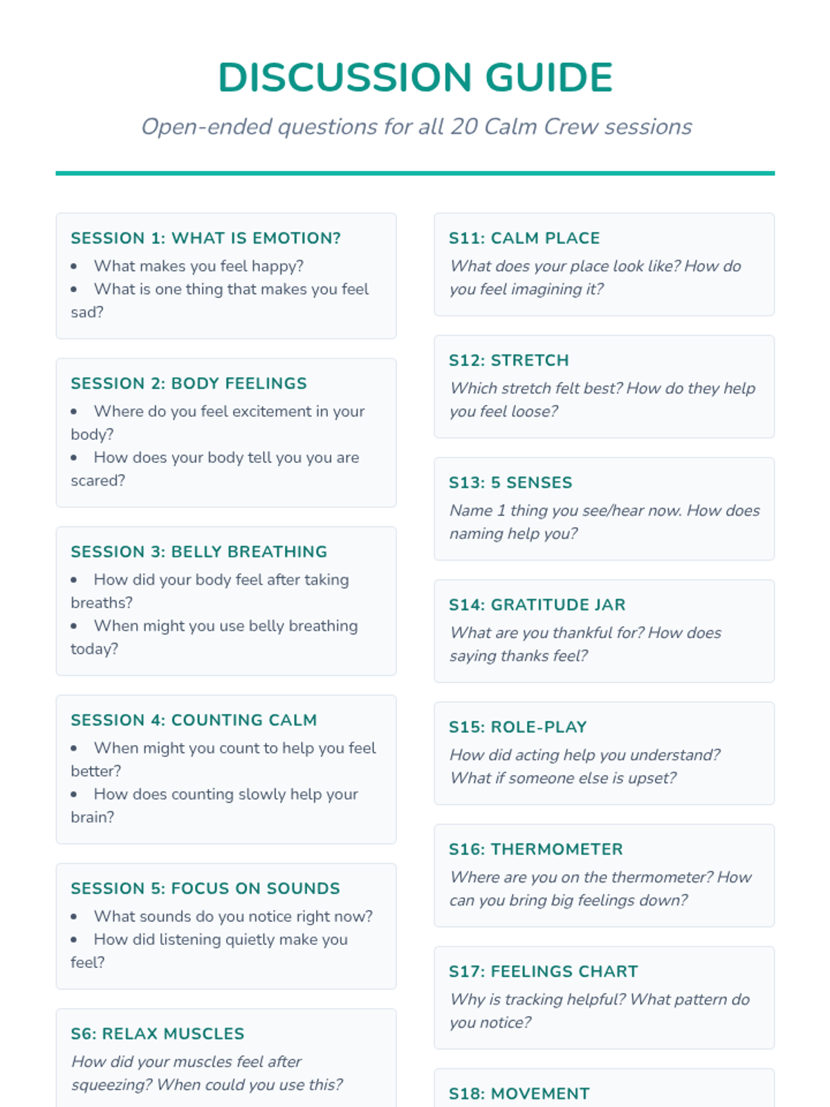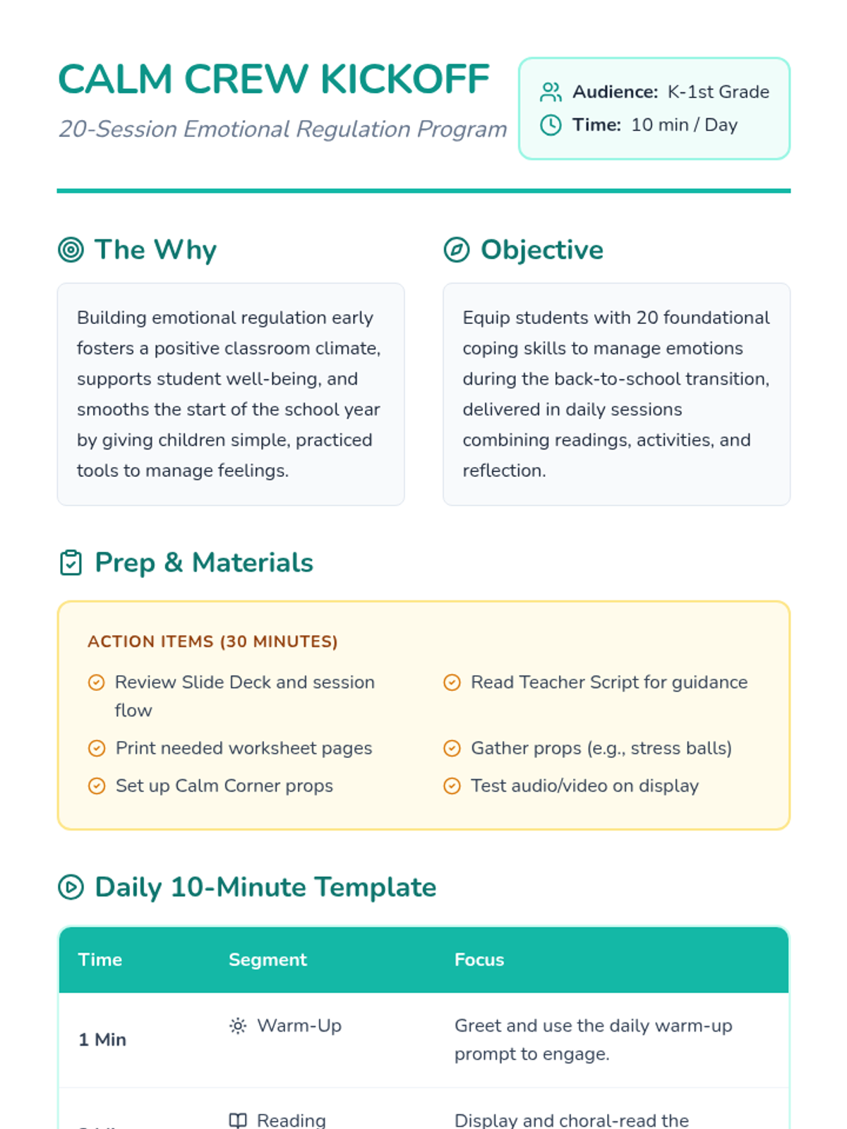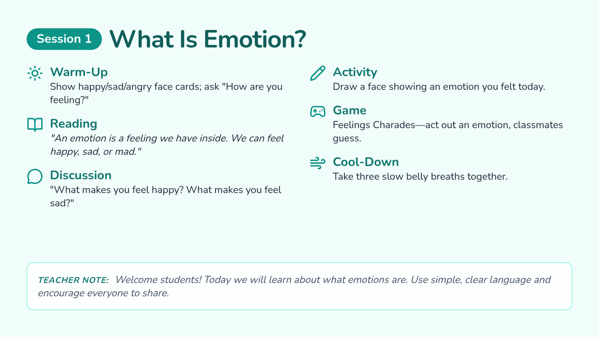 The complete 20-session program featuring daily 10-minute activities, discussions, and games to build emotional resilience.