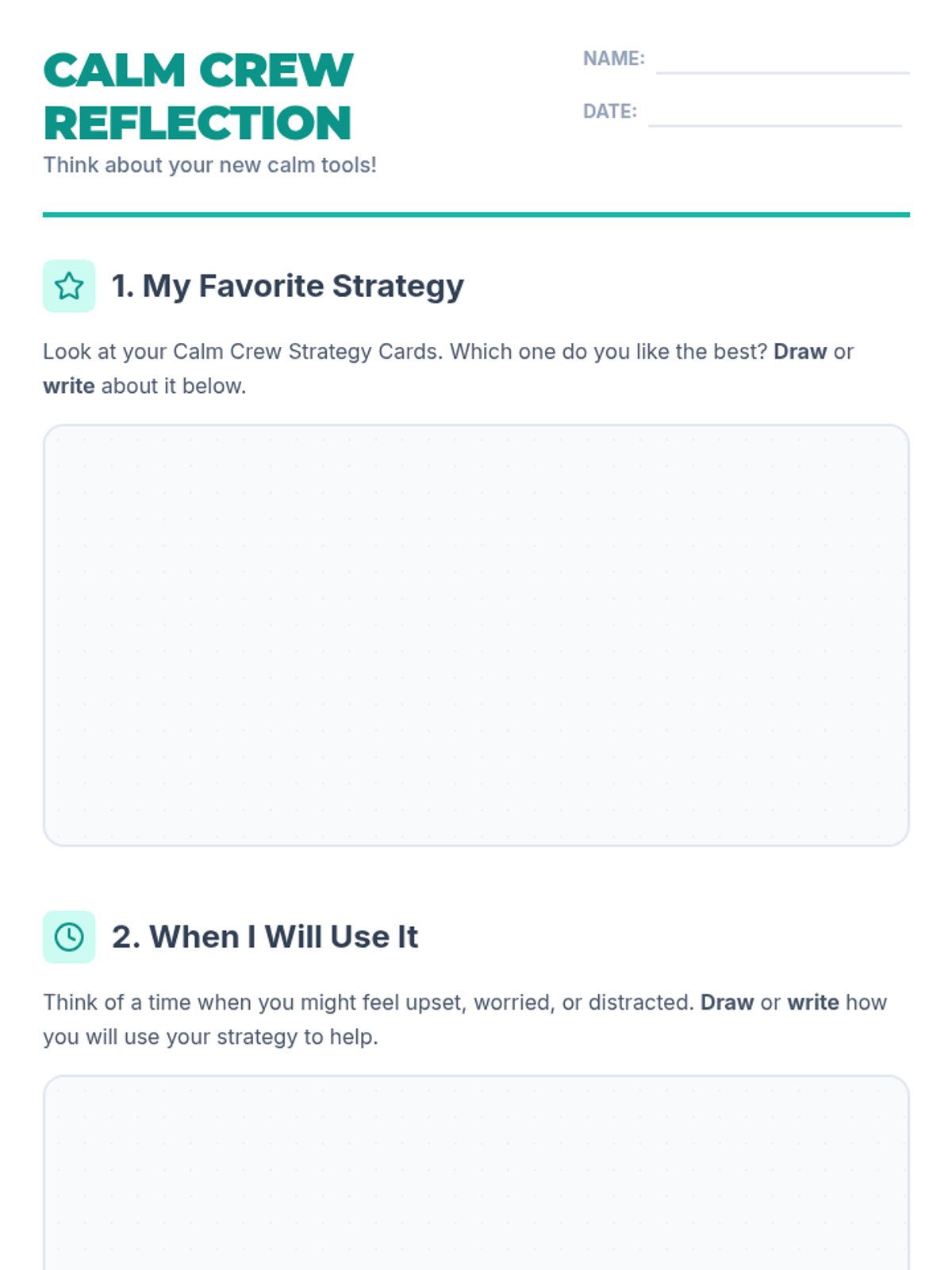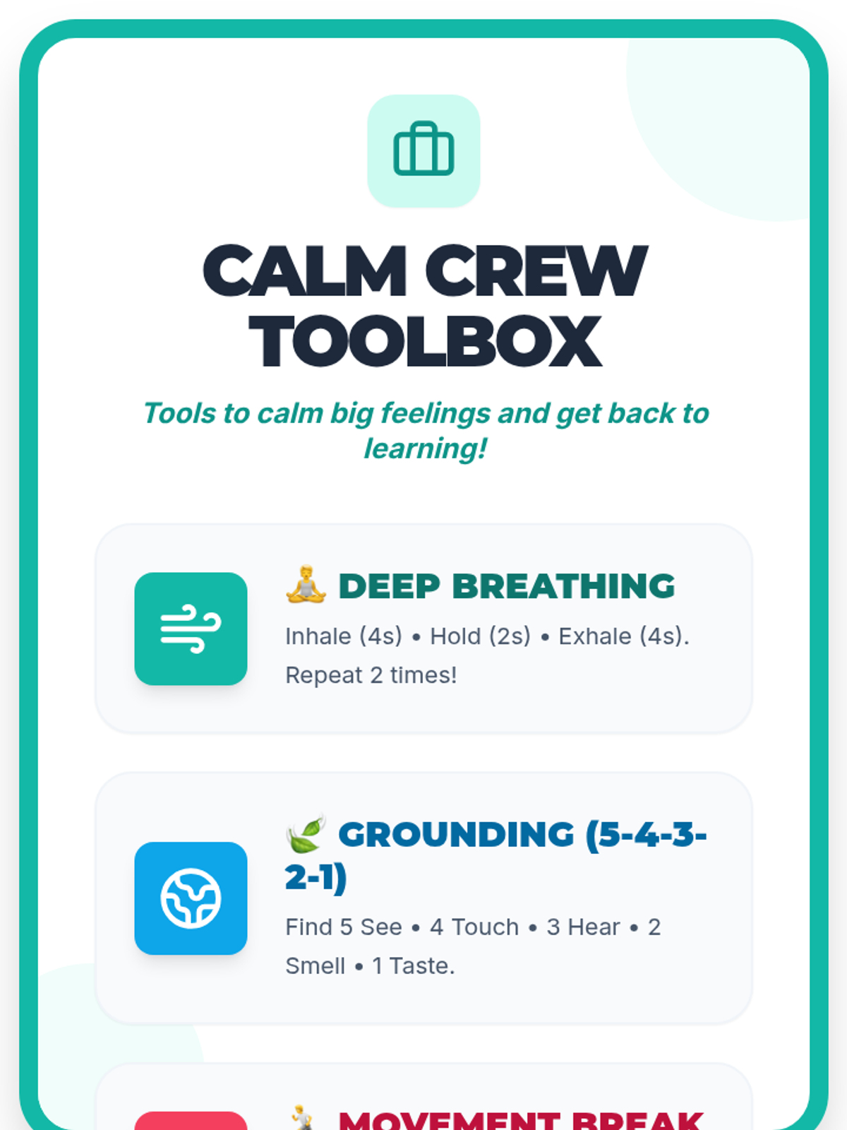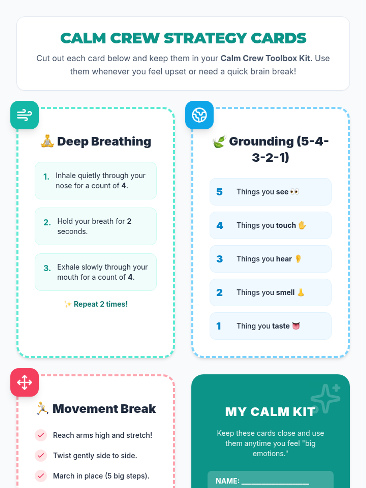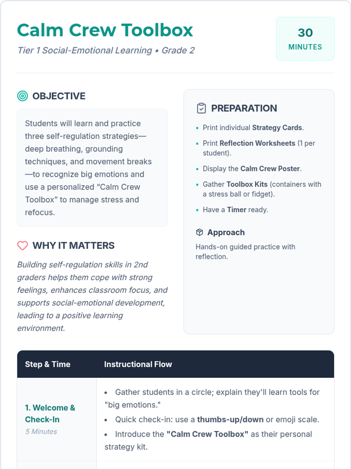 A 30-minute Tier 1 SEL lesson for 2nd graders to learn and practice self-regulation strategies including deep breathing, grounding, and movement breaks. Students build a personal 'toolbox' of strategies to manage big emotions and improve focus.