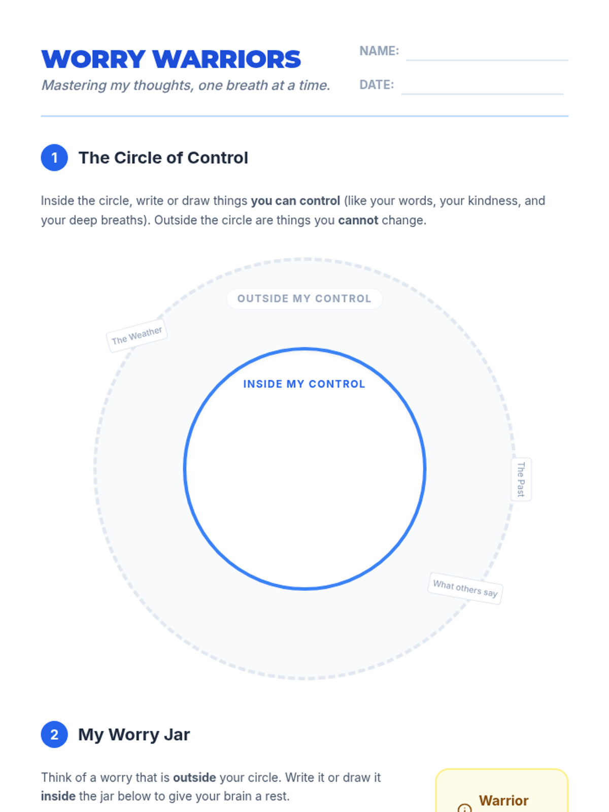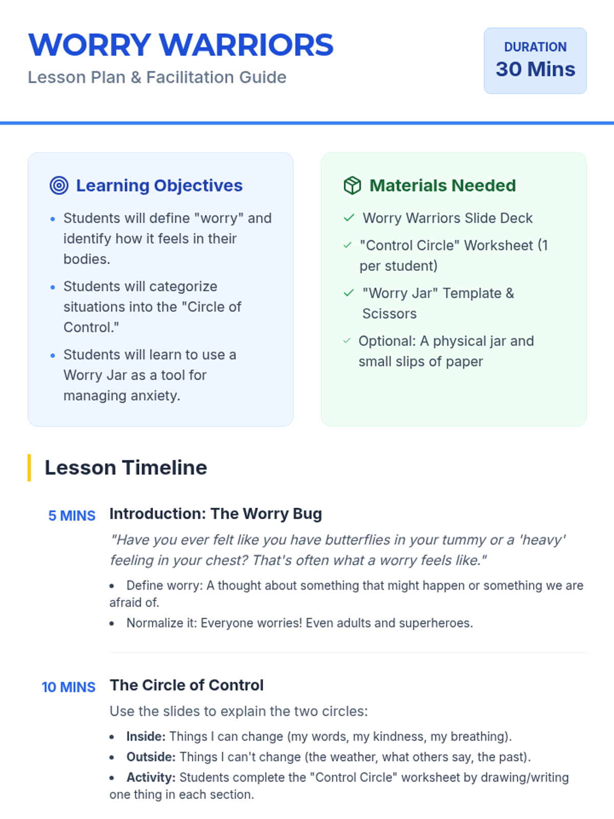 A 30-minute social-emotional learning lesson designed for 2nd graders to help them manage anxiety by identifying what they can control and using a Worry Jar to release heavy thoughts.