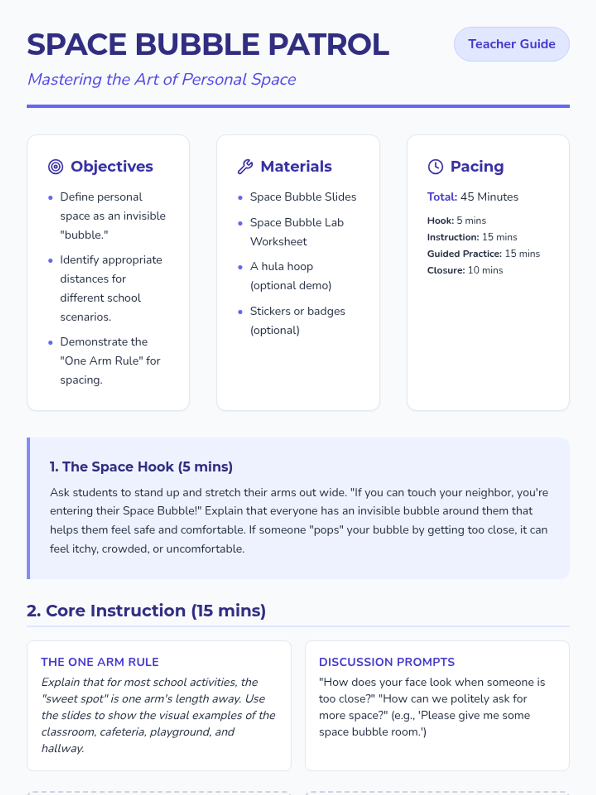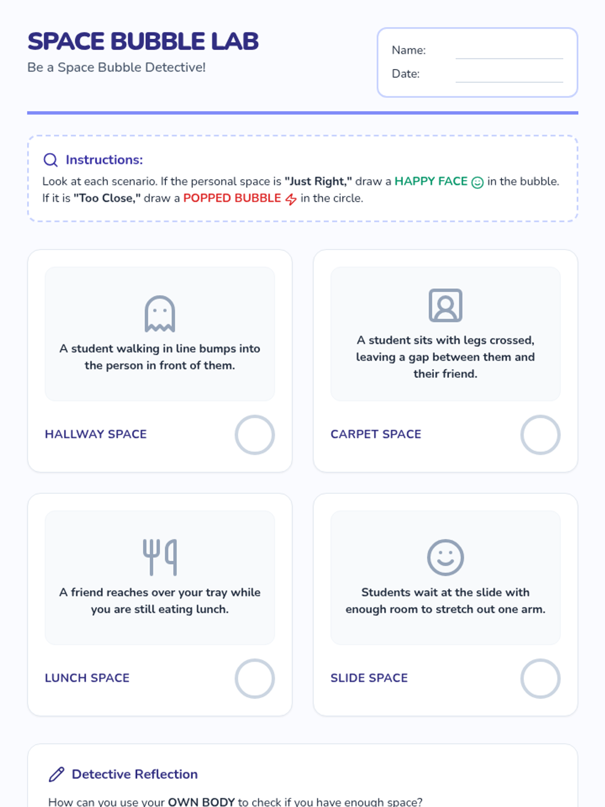 A social-emotional learning lesson for 2nd graders focused on understanding and maintaining personal space using the 'Space Bubble' concept across various school settings.