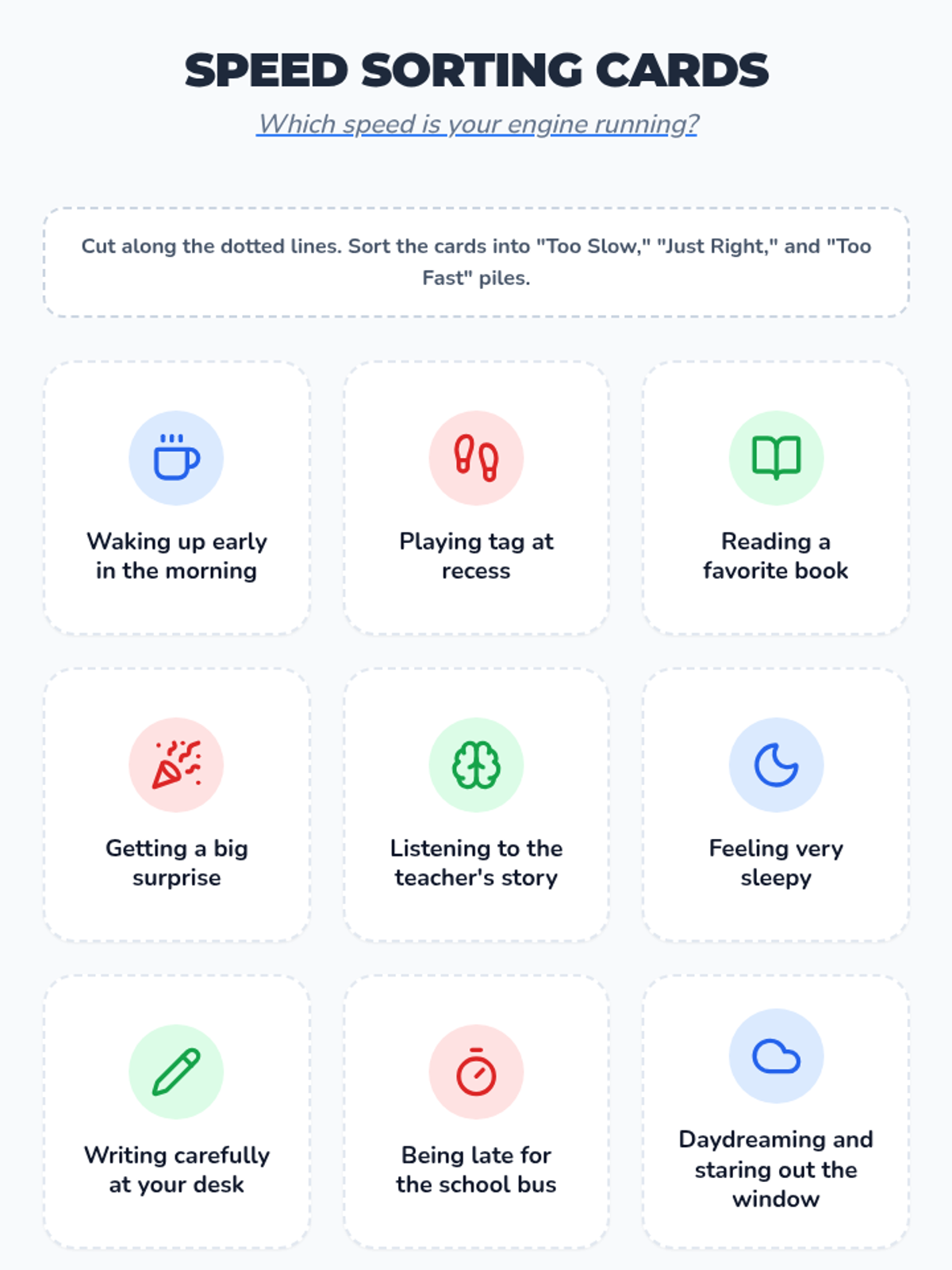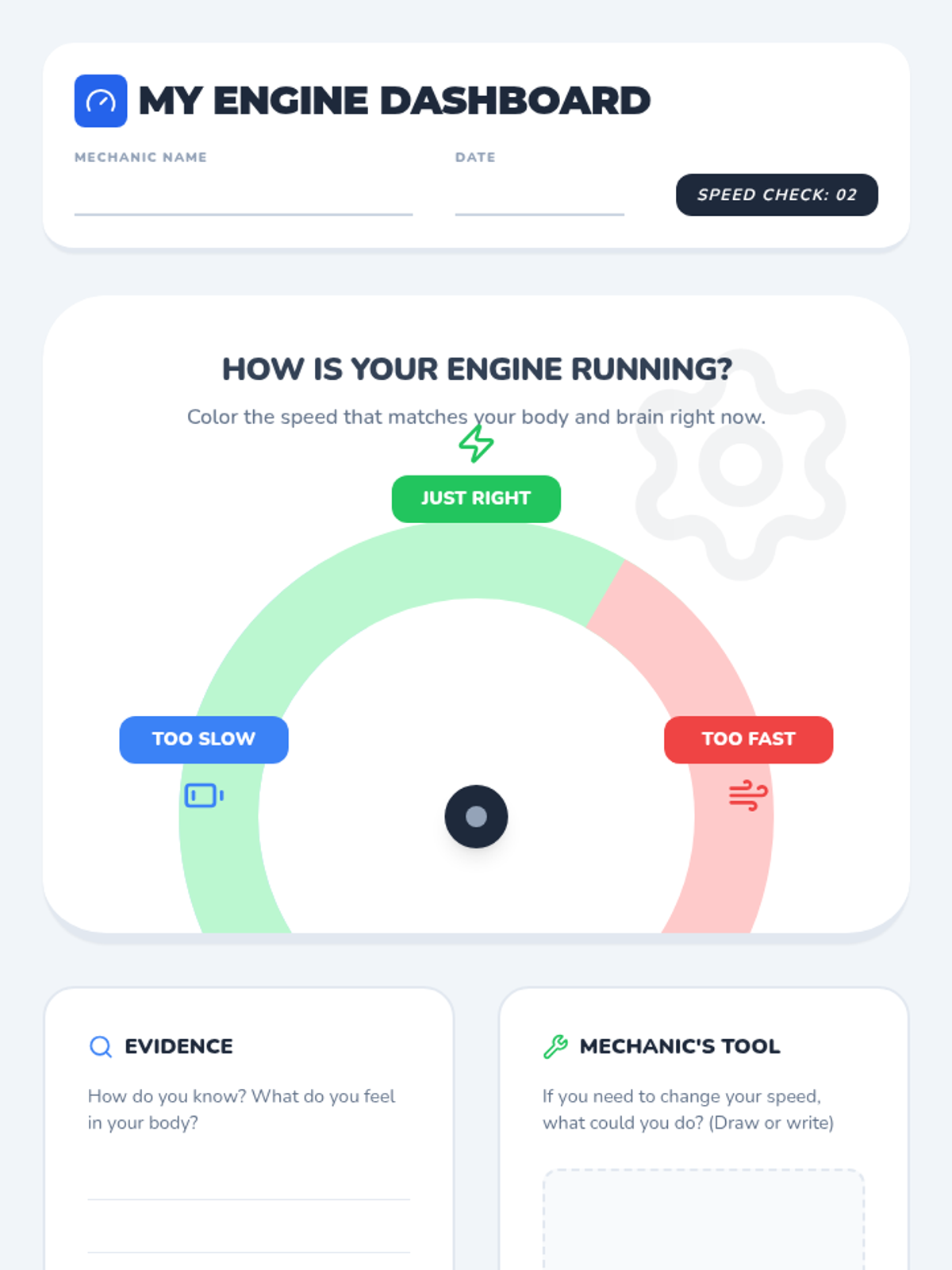 A 20-minute social-emotional learning lesson for 2nd graders that uses a car engine metaphor to help students identify and regulate their emotional energy levels. Students move through a physical warm-up, visual identification of 'speeds', and a personal check-in.