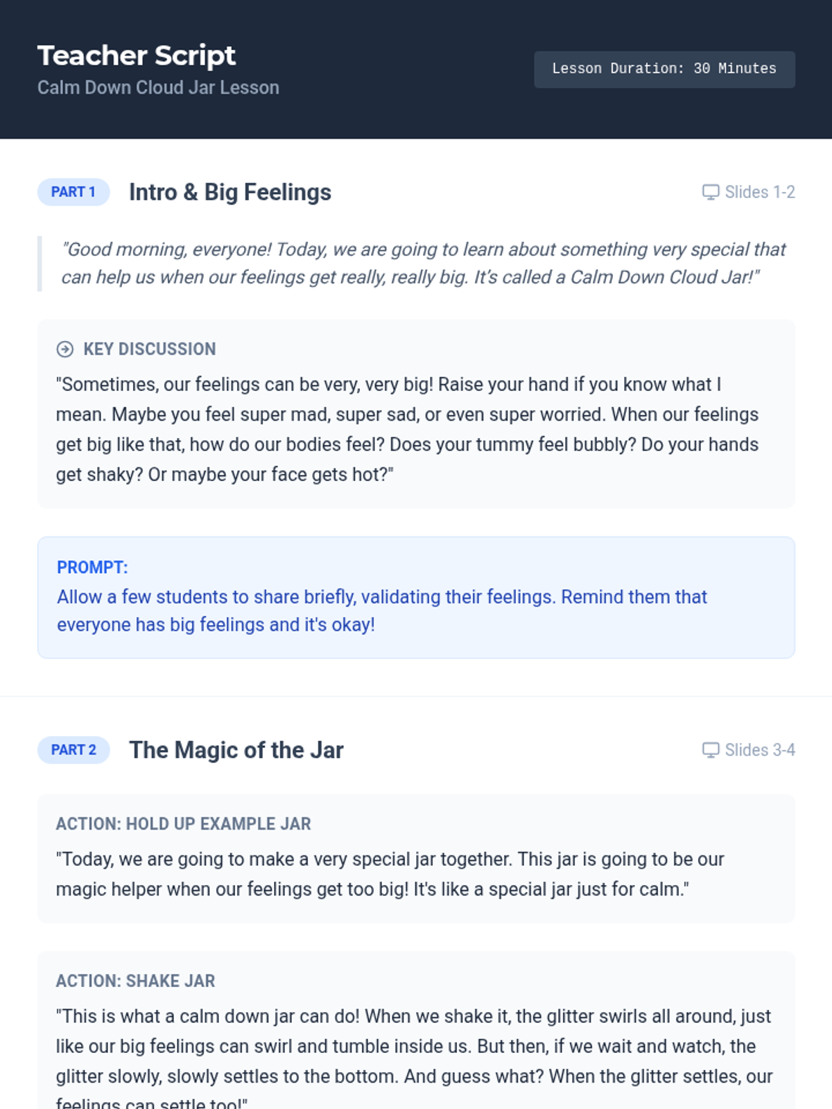 A lesson designed for two first-graders to learn how to replace screaming and eloping with verbal communication using a feelings chart. Through role-play and visual aids, students practice identifying their emotions and stating their needs.