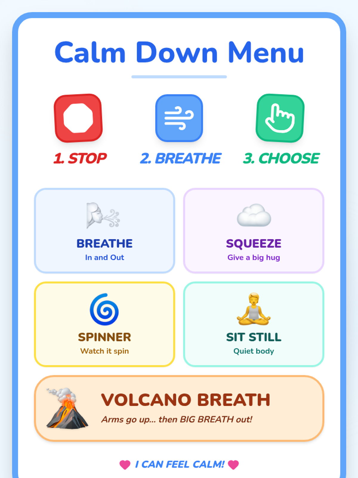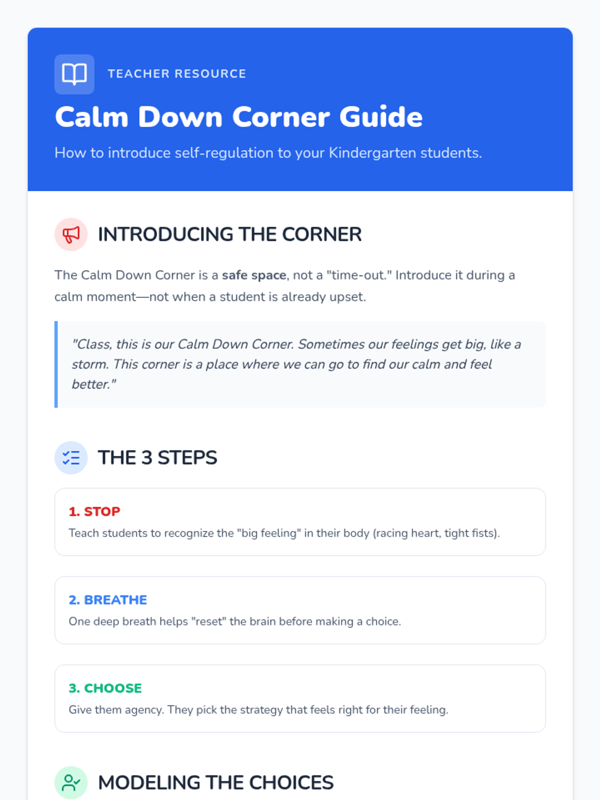 A lesson focused on self-regulation and emotional management for young learners, centered around a calm down corner.