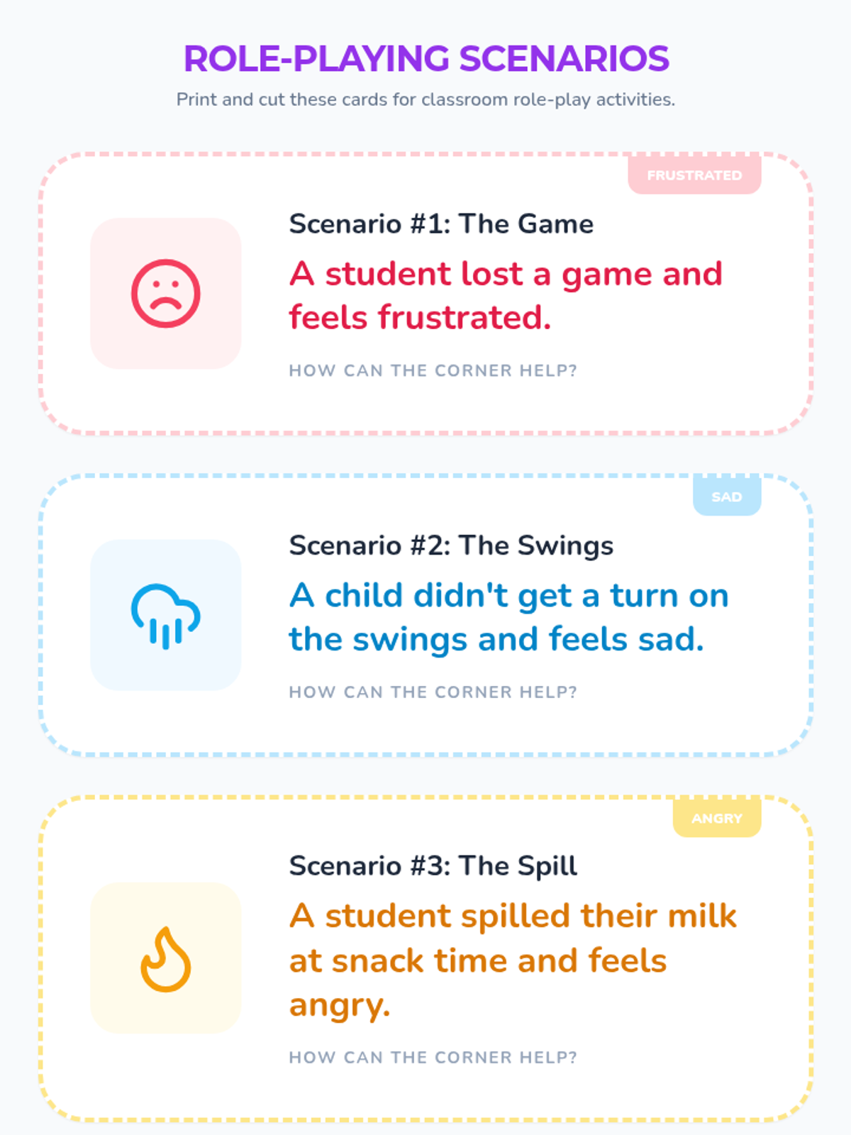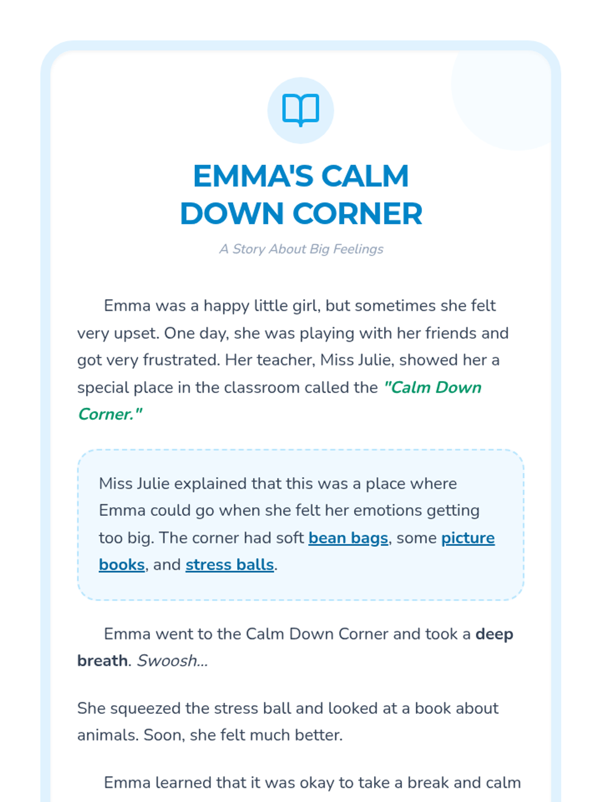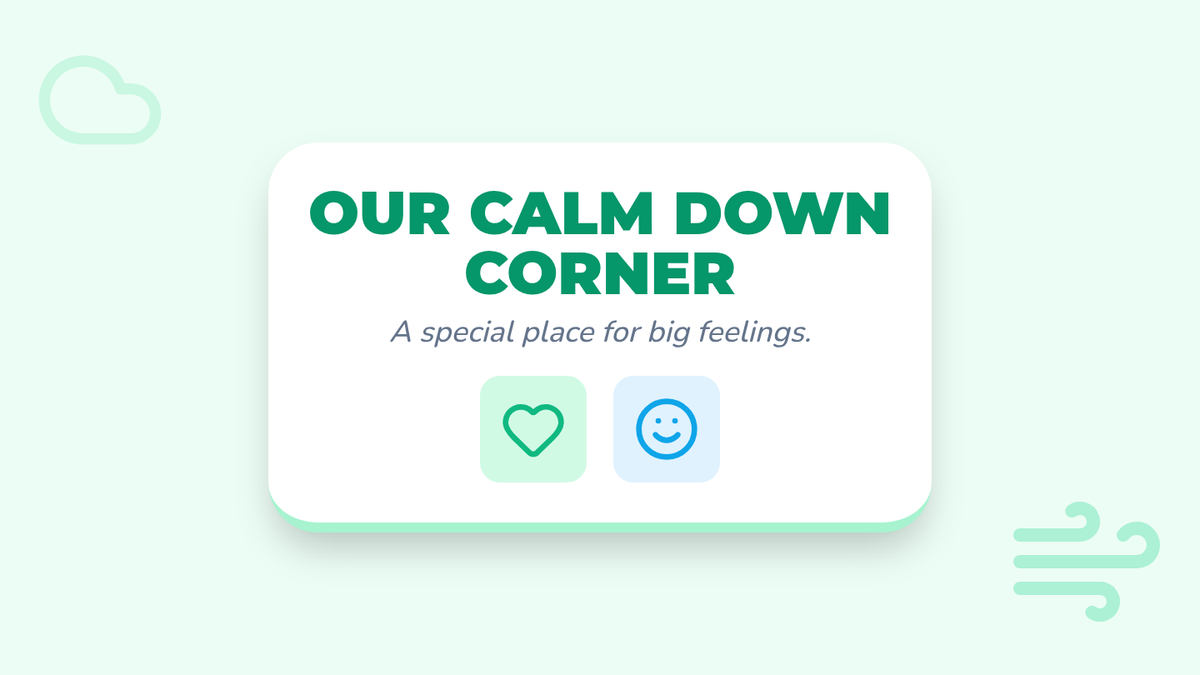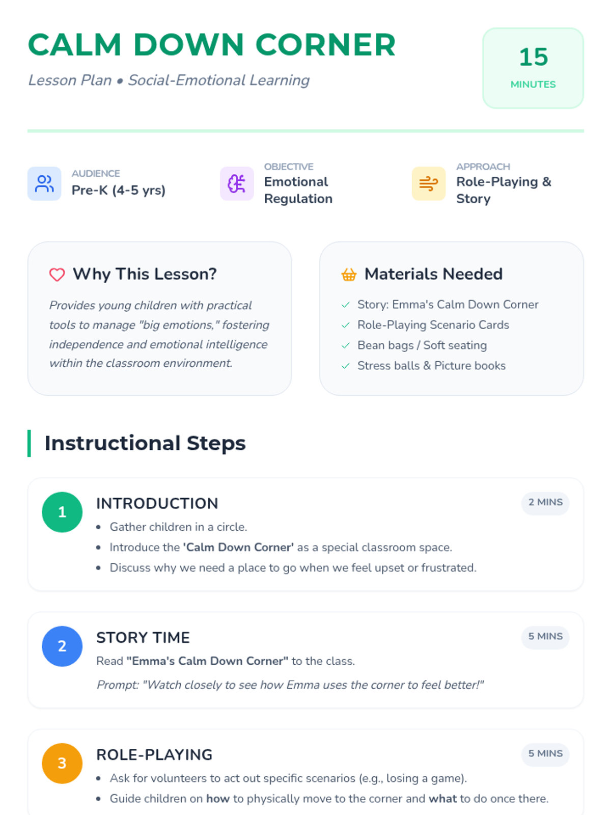 A Pre-K lesson introducing the 'Calm Down Corner,' a dedicated classroom space for emotional regulation. Students learn how to use the corner through a story and role-playing activities.