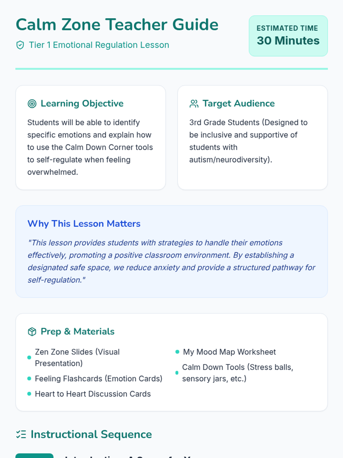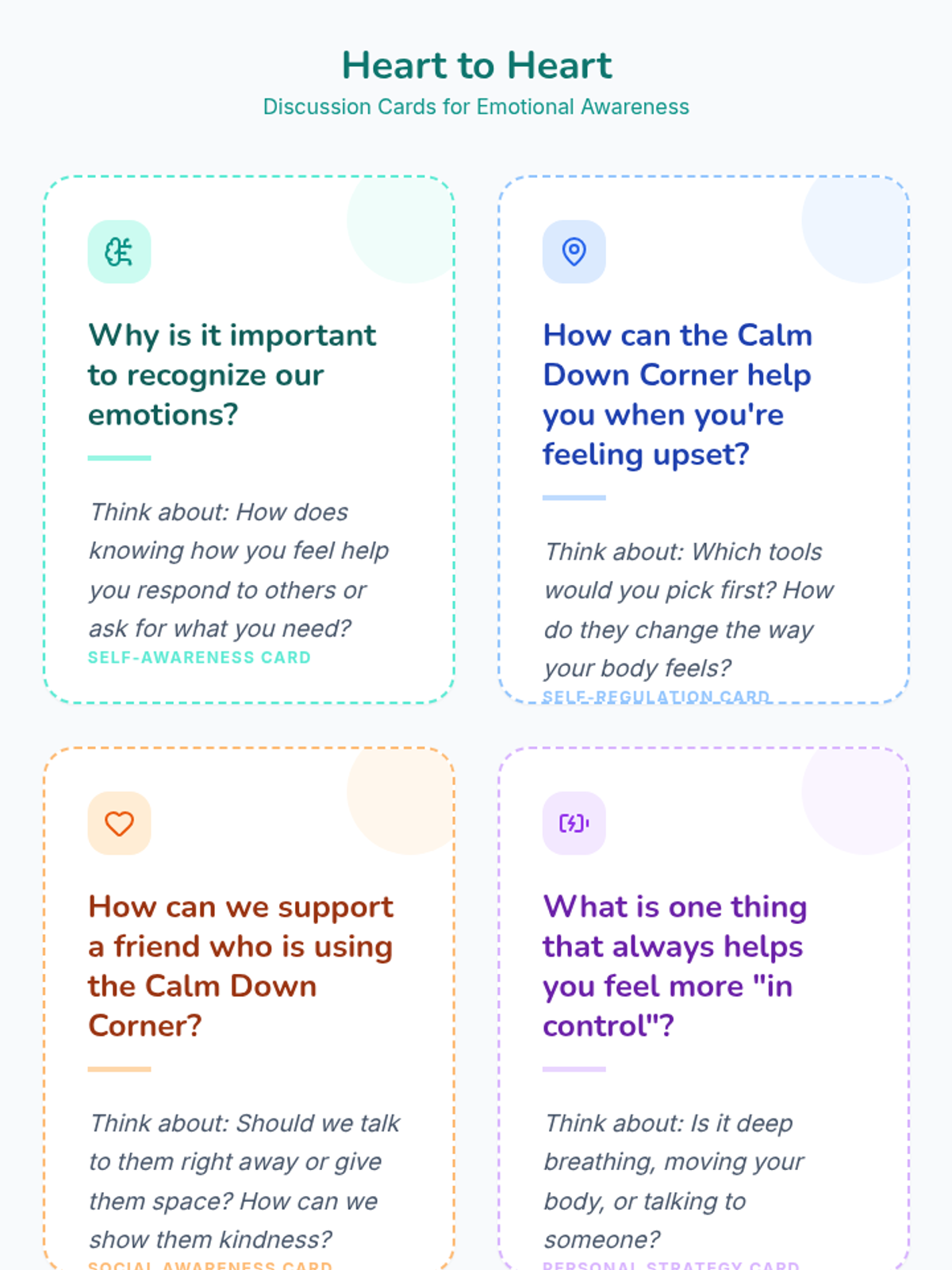 This lesson introduces the Calm Down Corner, a designated classroom space for emotional self-regulation. Students learn to identify feelings and practice using specific tools to manage them, fostering a supportive environment for all learners.