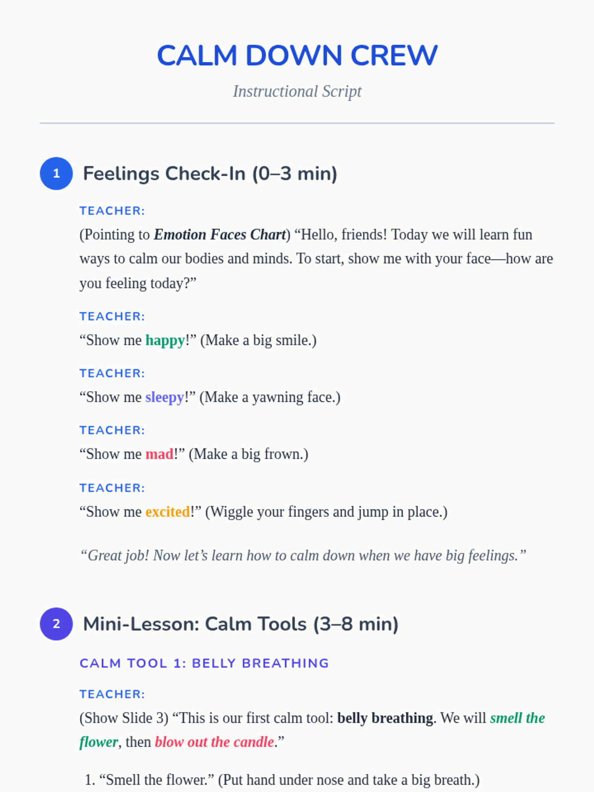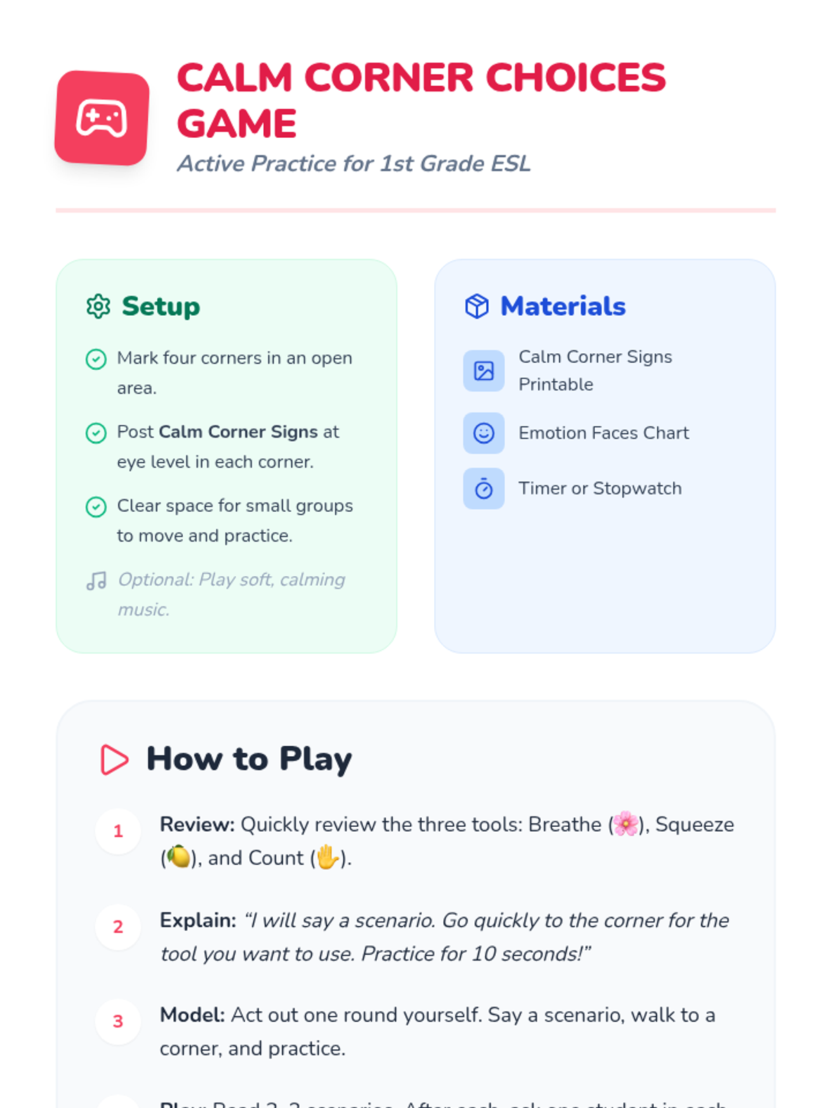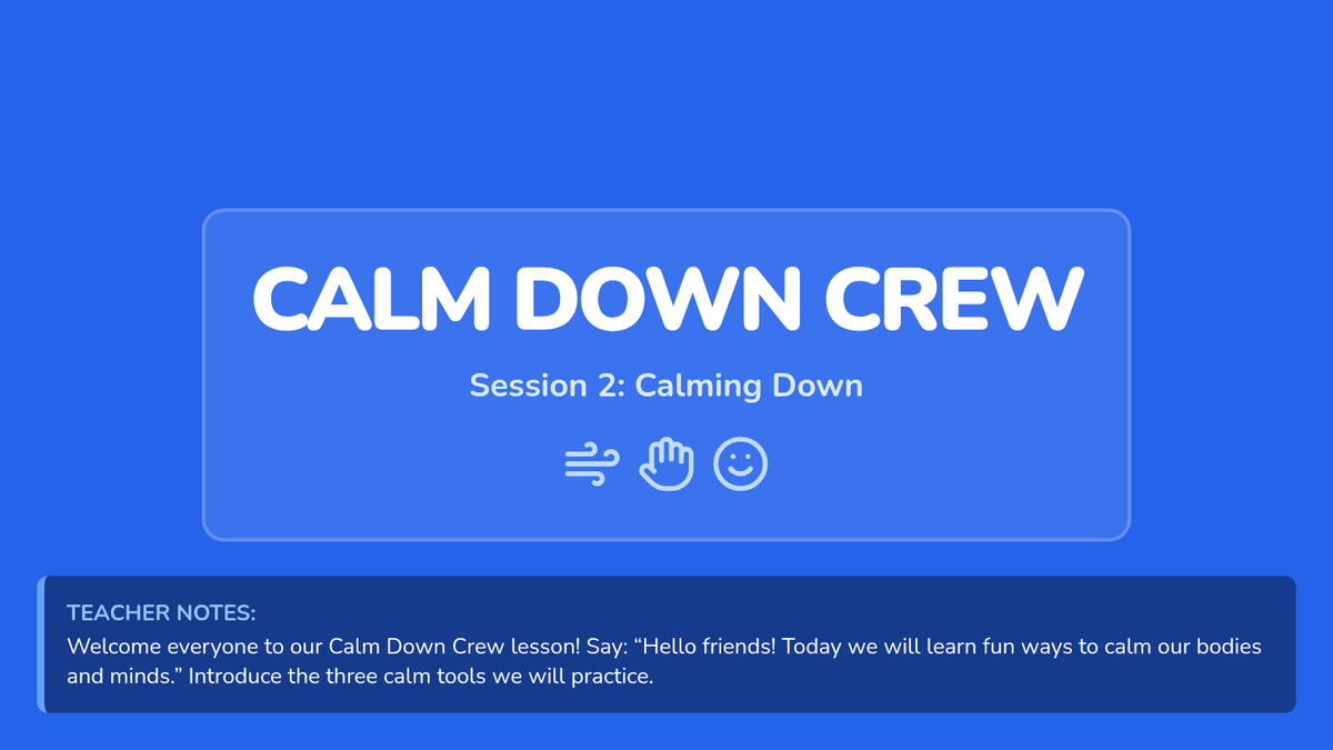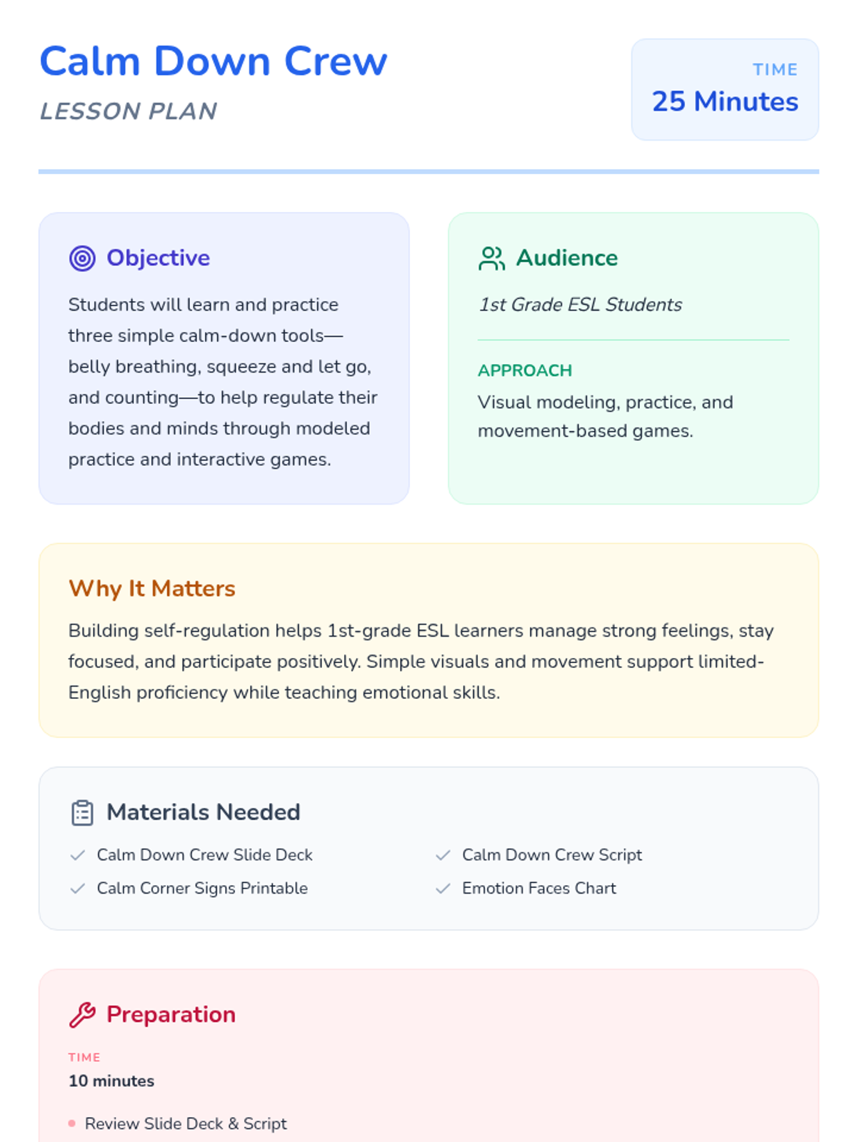A 25-minute interactive lesson for 1st-grade ESL students to learn three core self-regulation tools: belly breathing, physical tension release, and slow counting.