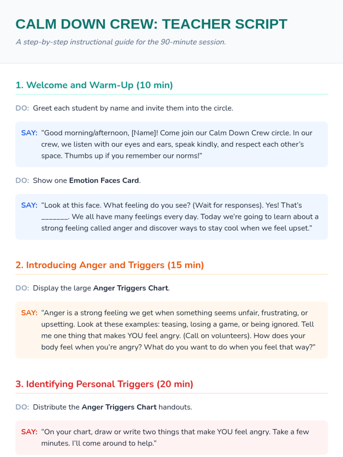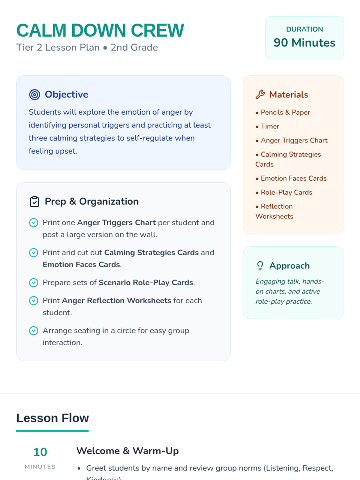 A 90-minute Tier 2 lesson for 2nd graders to recognize anger triggers and practice effective calming strategies in a small-group setting.
