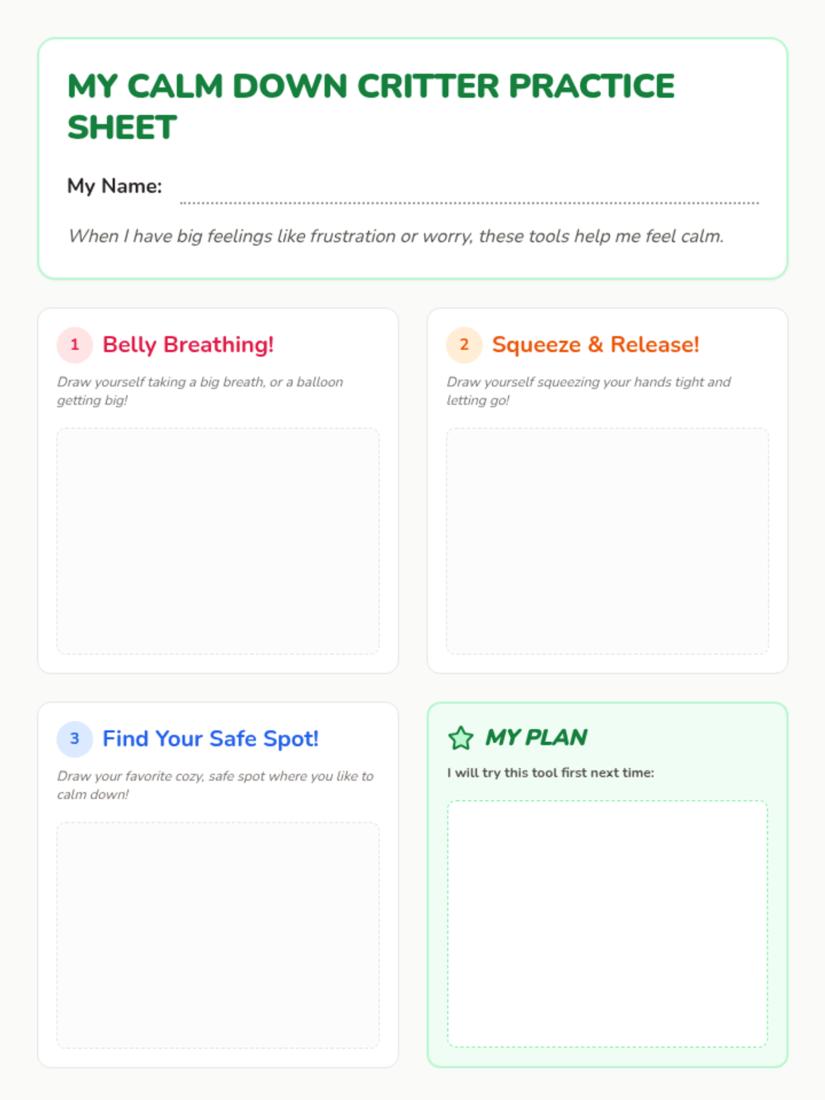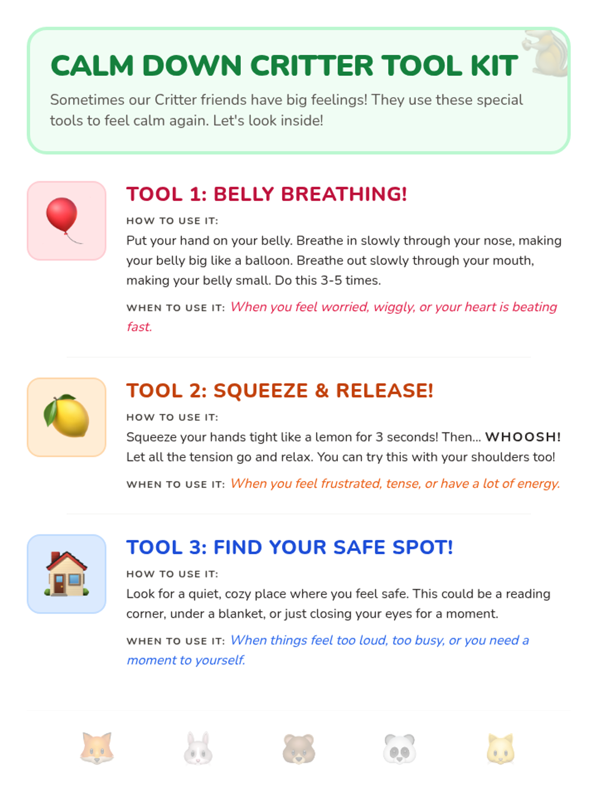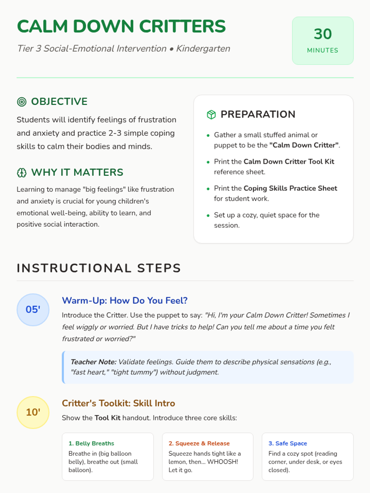 A Tier 3 intervention lesson for Kindergarten students to learn and practice simple coping skills for managing frustration and anxiety using 'Calm Down Critter' metaphors.