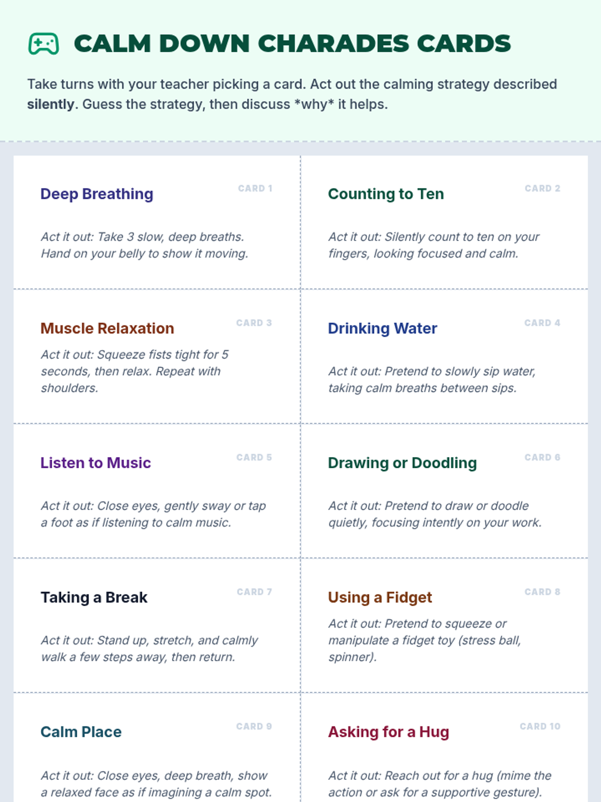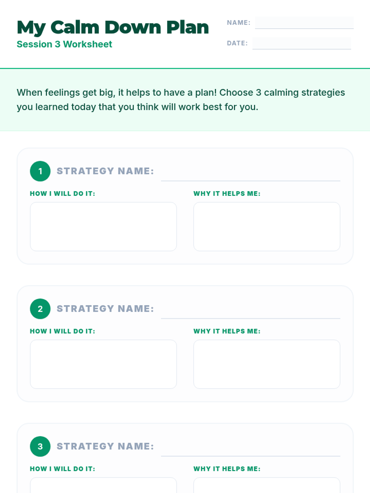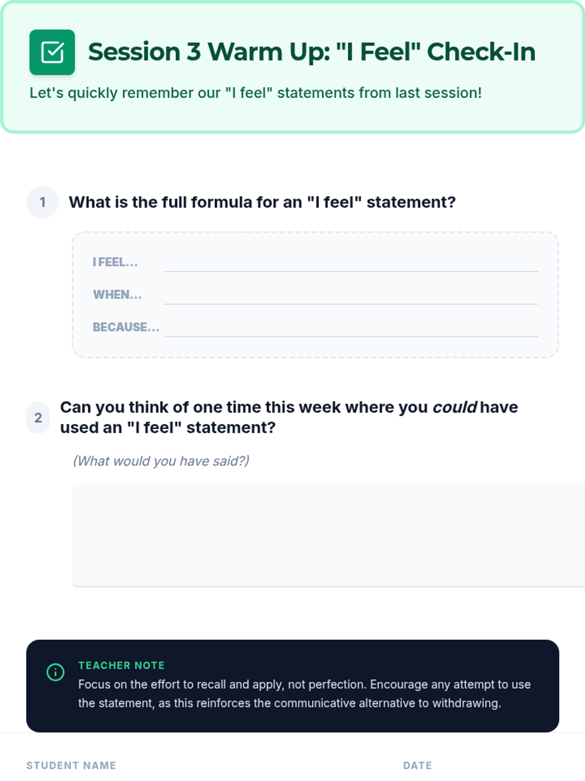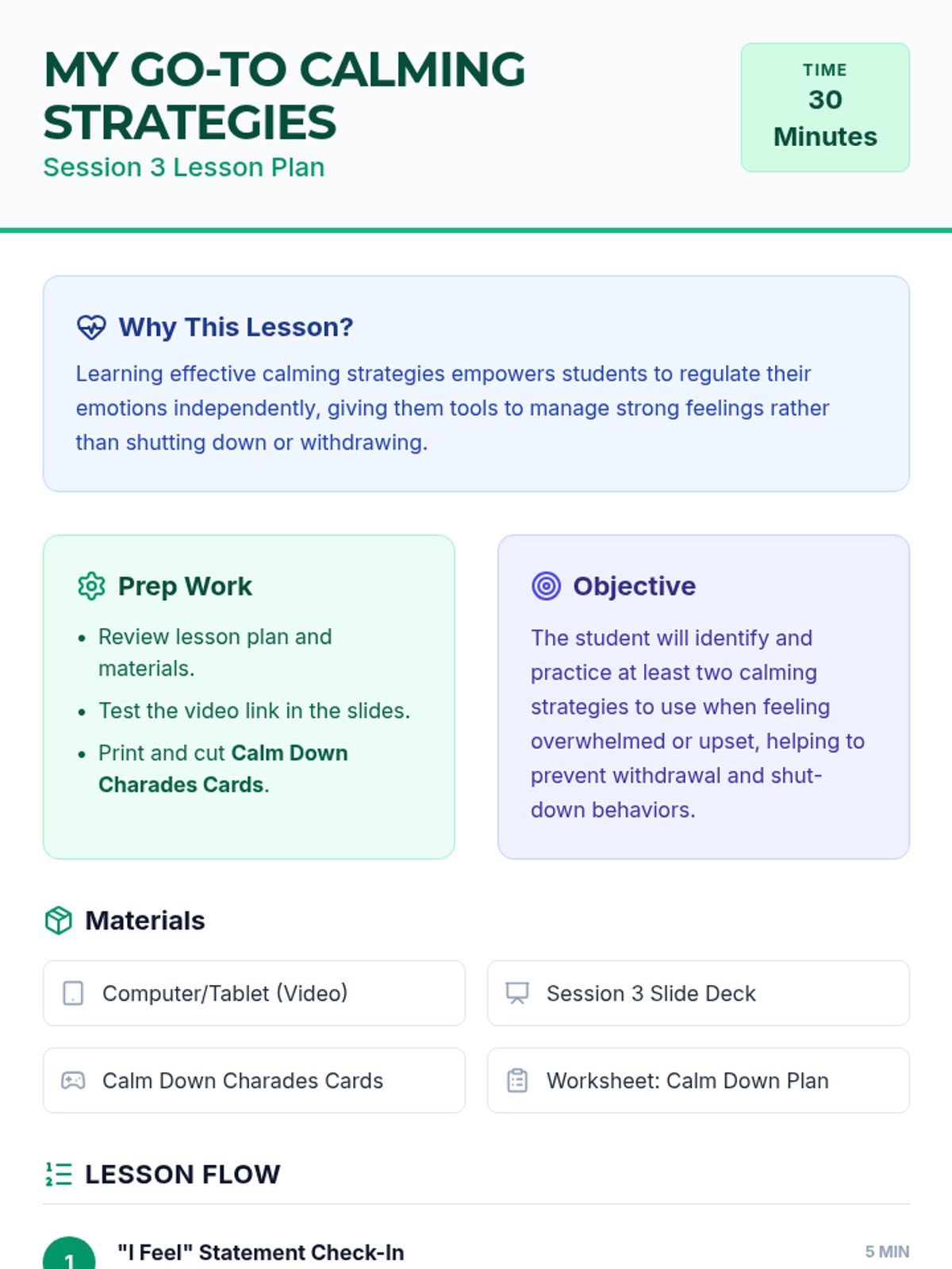 Introduces practical self-regulation techniques like deep breathing and grounding to help students manage intense emotions before they lead to withdrawal.