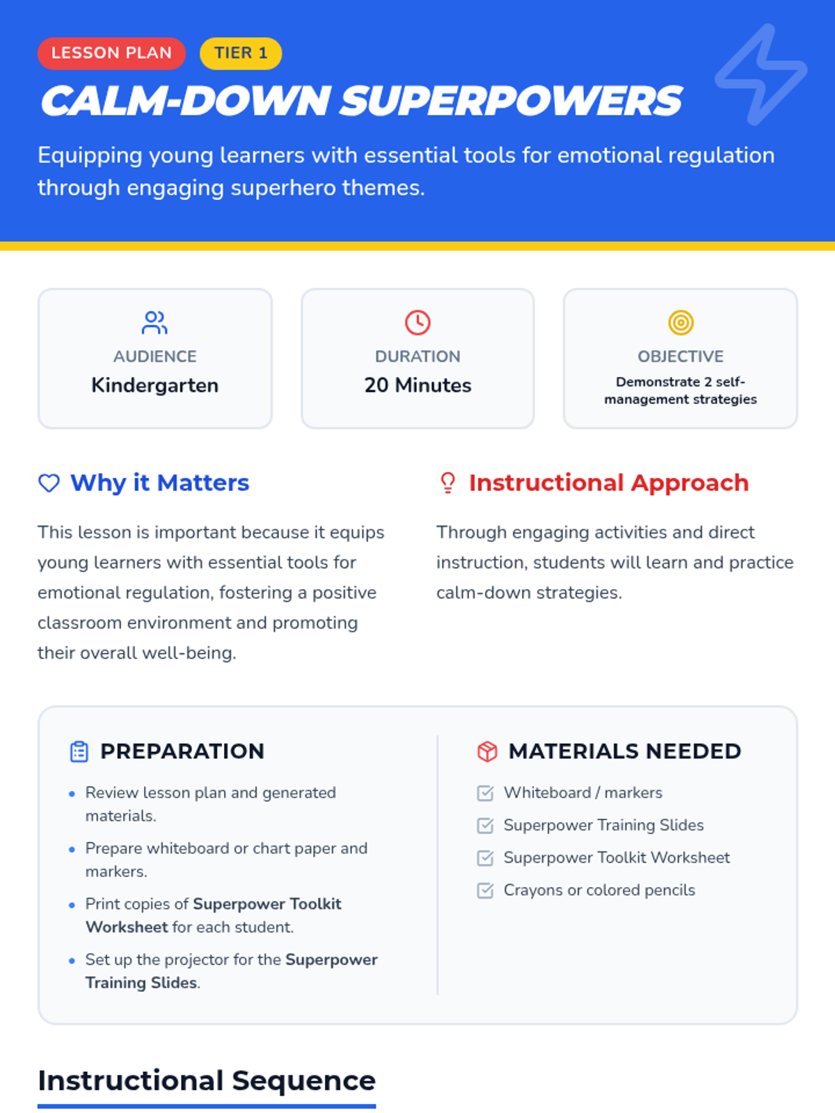 A 20-minute Kindergarten lesson introducing self-regulation strategies through a 'superpower' theme, focusing on deep breathing and taking breaks.