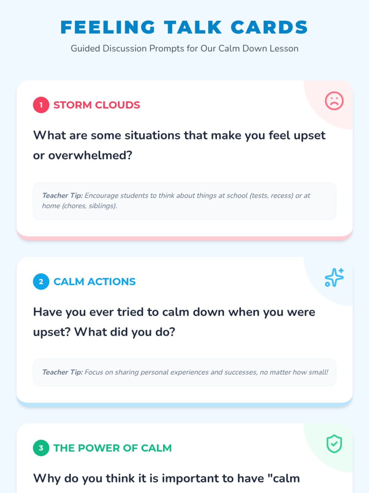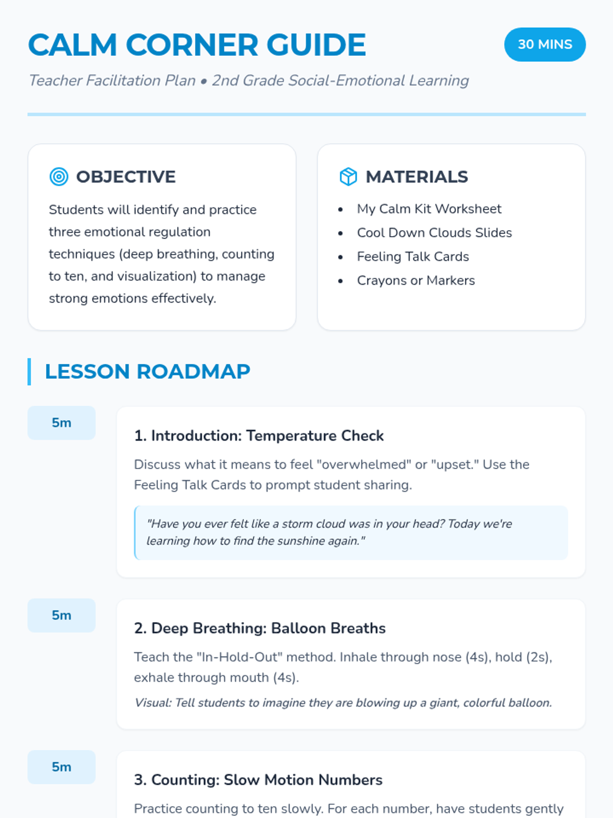 A lesson introducing 2nd-grade students to emotional regulation techniques like deep breathing, counting to ten, and visualization to help manage strong emotions.